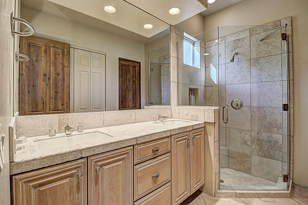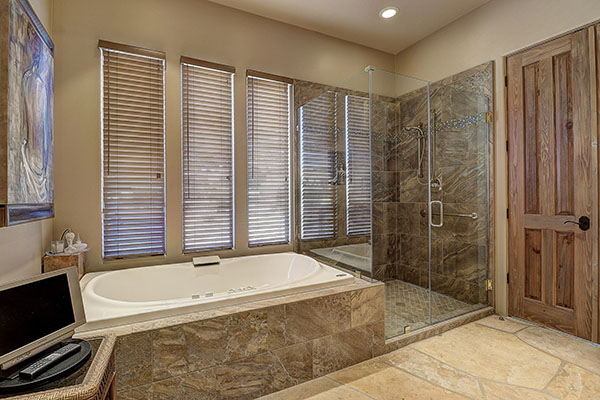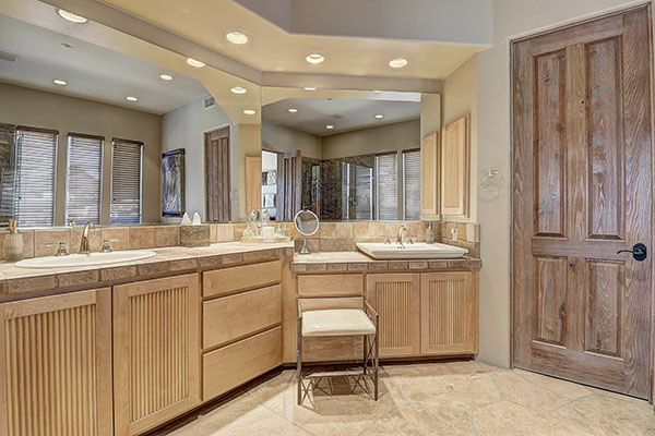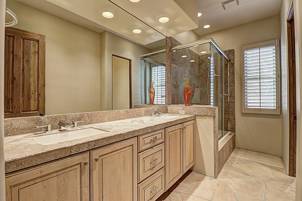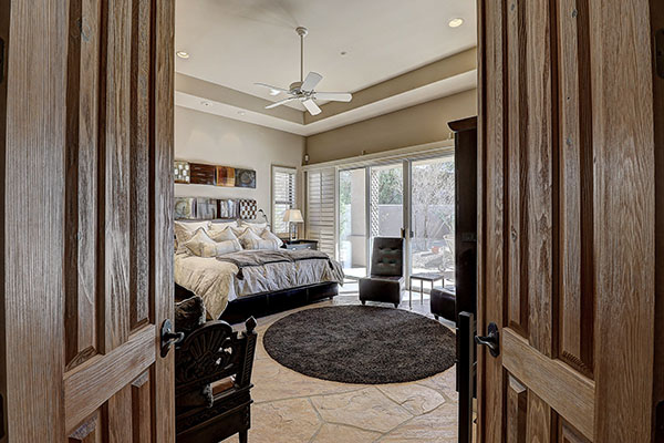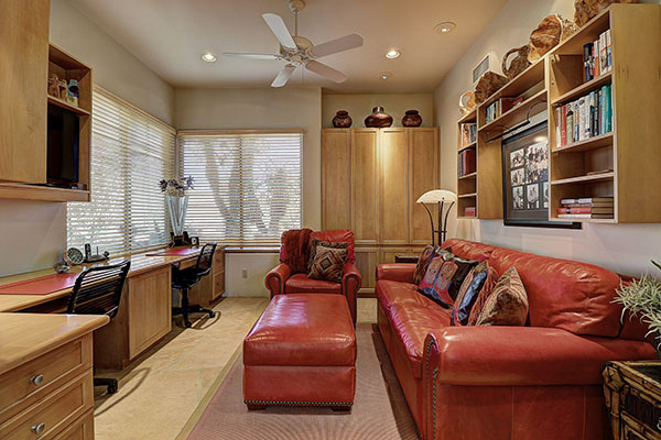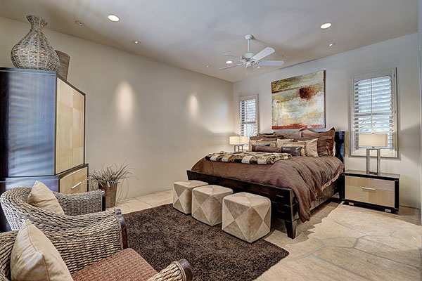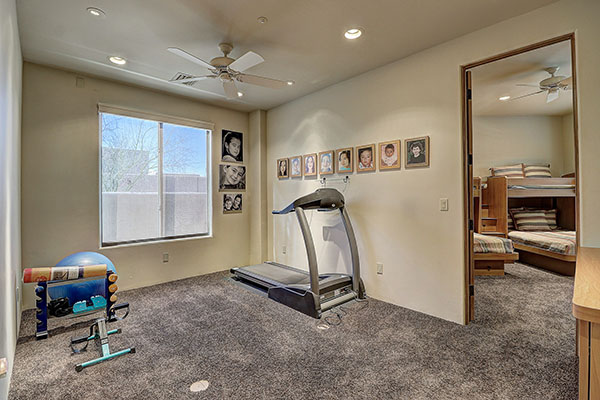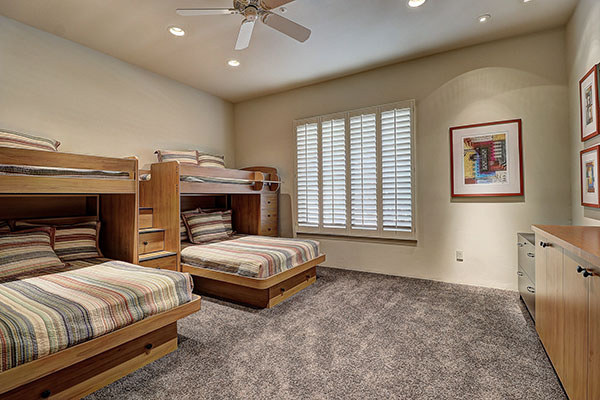 The master suite is spacious with sitting area and separate yard entry, plantation shutters and a large walk-in closet. There are dual sinks, a brand new shower and a separate Jacuzzi tub in the master bath. Three additional guest bedrooms with ensuite baths and walk-in closets. Den/office with built in desks, cabinets, and book shelves. Workout area with room for treadmill, spin bike, and elliptical. Sonos sound system connects to both inside (in-wall) and backyard/pool/patio speakers. All walk-in closets have built in dressers and ample hanging space.