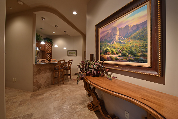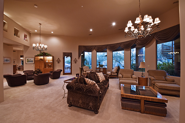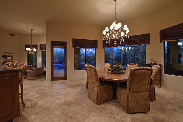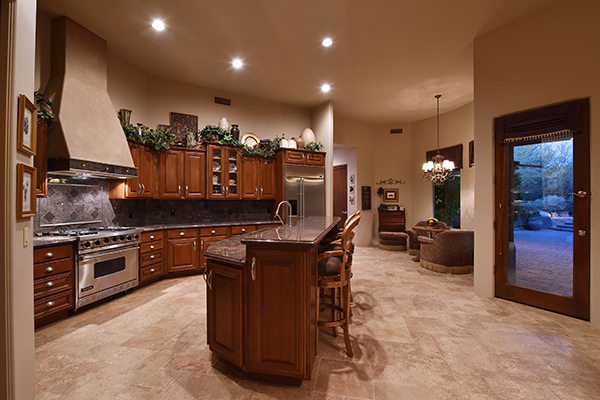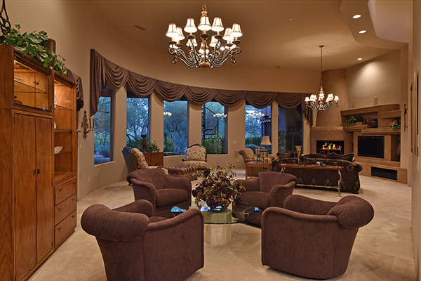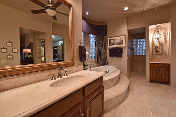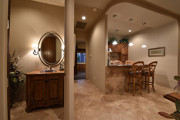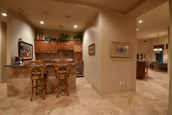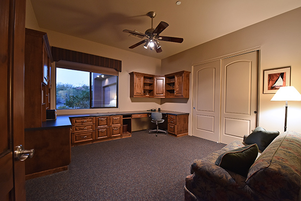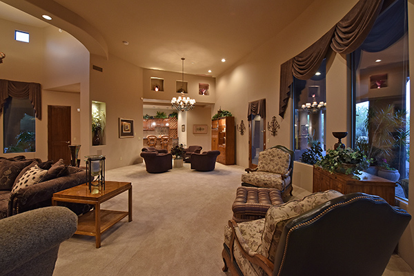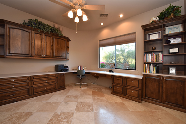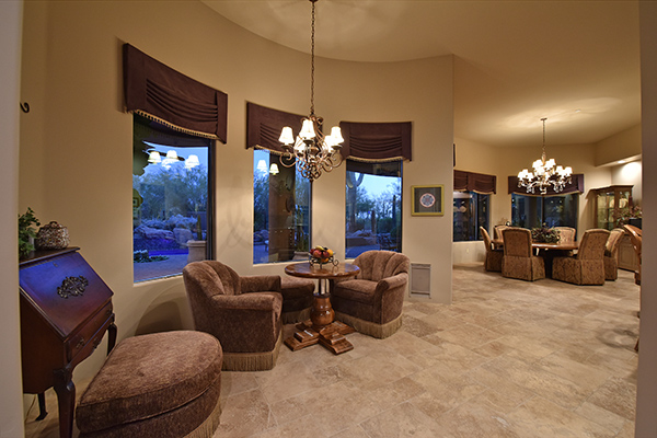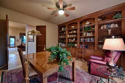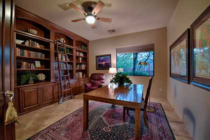 Other features include: central vac, front entry courtyard with awnings and custom drapes, energy efficient windows, travertine flooring, no interior steps, living and dining spaces with wet-bar and corner kiva fireplace, large master suite with sitting area, jack and jill guest bedrooms, office with built in bookcases and pre-wired media media system, and large laundry with sink and storage. With too many features to list, this home has it all!
