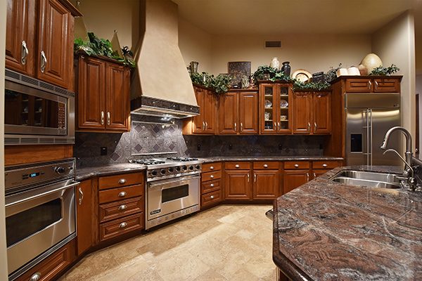 The chef inspired kitchen has granite counters, large viking gas cooktop and stove, centerpiece hood vent, stainless steel appliances, center island with counter seating, and custom cabinetry all open to the family room and breakfast area. For the car enthusiast, the paver drive leads to the motor court with 3 car garage with epoxy floors and built in shelving and cabinets and 1 RV garage with dual garage doors for pull through access.