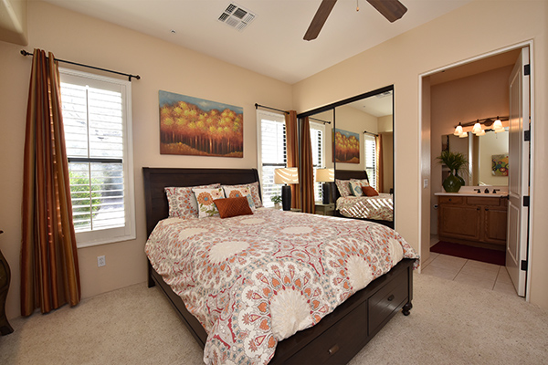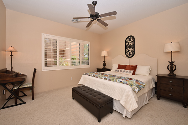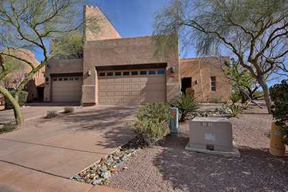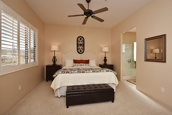 The master suite is light and bright featuring a walk in closet, full bathroom with soaking tub and separate walk in shower, two sink vanity, and oil rubbed bronze accents. Other features include an ensuite guest bedroom, powder bath, cozy patio space, two car garage with extended driveway, plantation shutters. Community features include access to heated pool and spa, fitness center, walking distance to Troon North Golf Club, and close to hiking, shopping and dining.