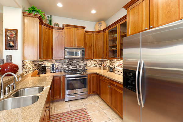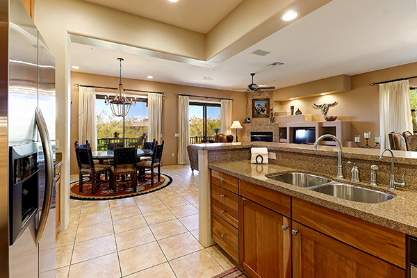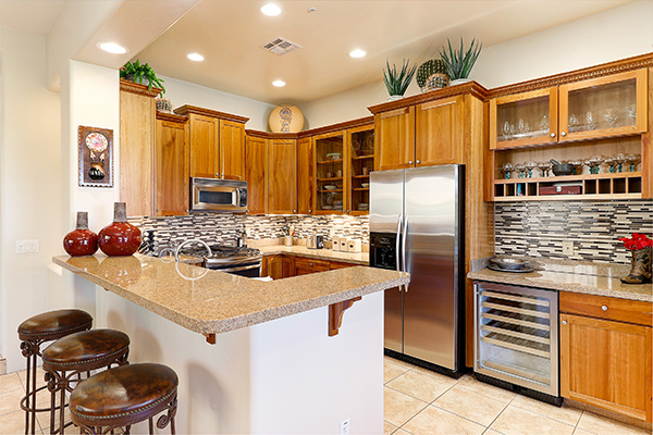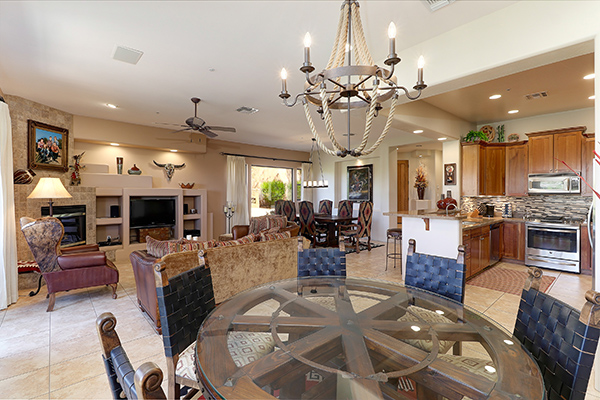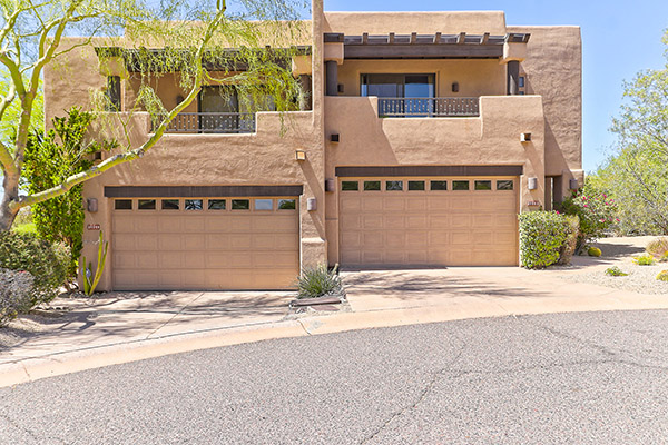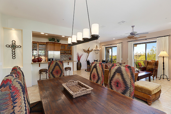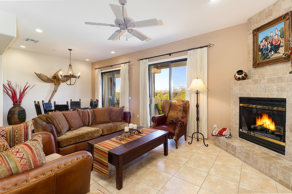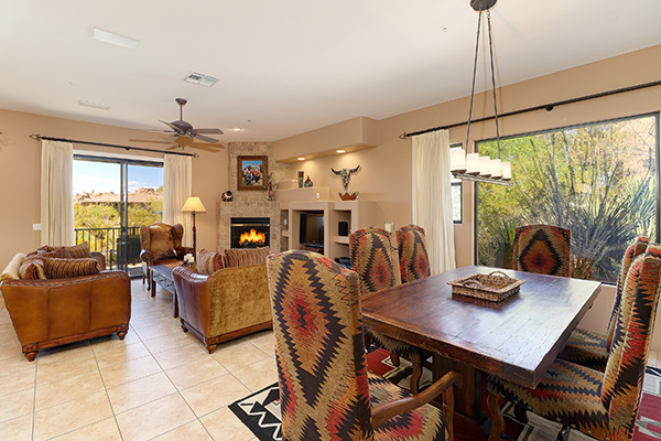 Fabulous town home located on the 9th Fairway at Troon Norths Monument Course features light and bright spaces perfect for the seasonal visitor or year round homeowner! The updated kitchen has plenty of cabinet space with granite counters, stainless steel appliances, wine fridge, gas range with electric oven and warming drawer, RO system, and new glass mosaic backsplash.
