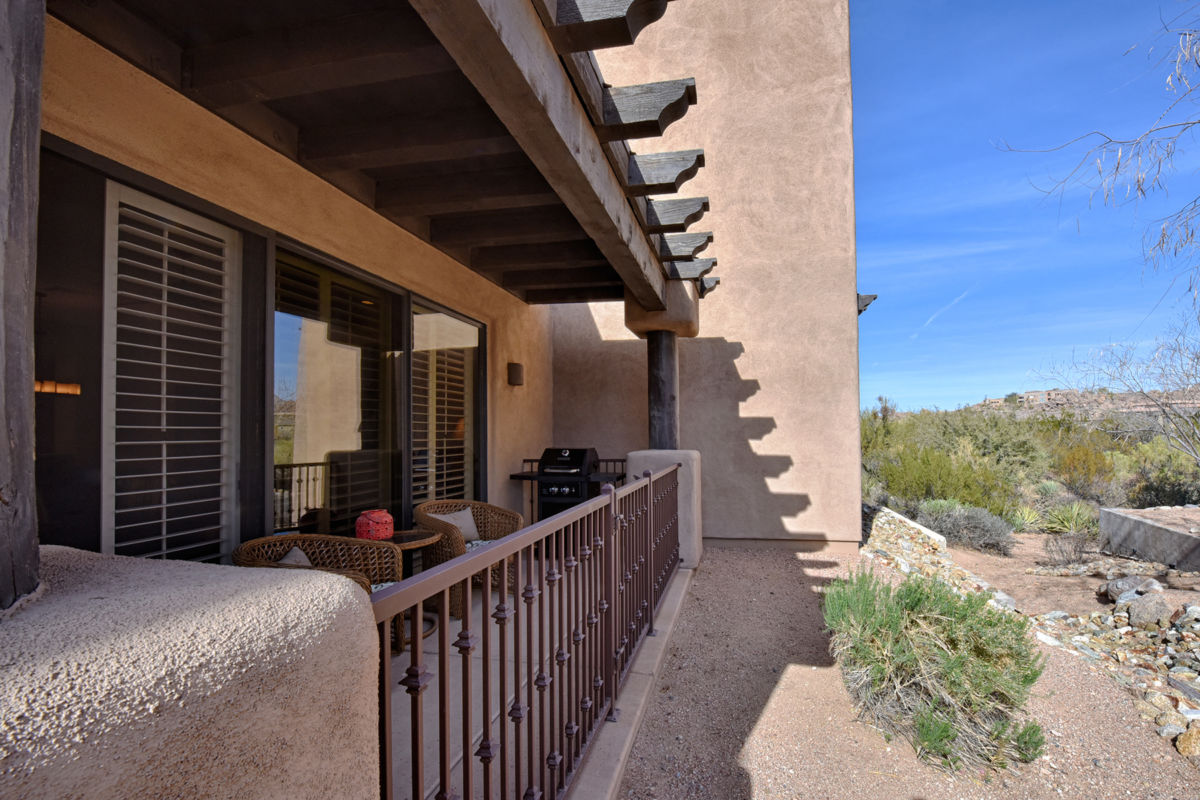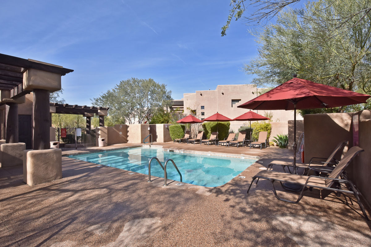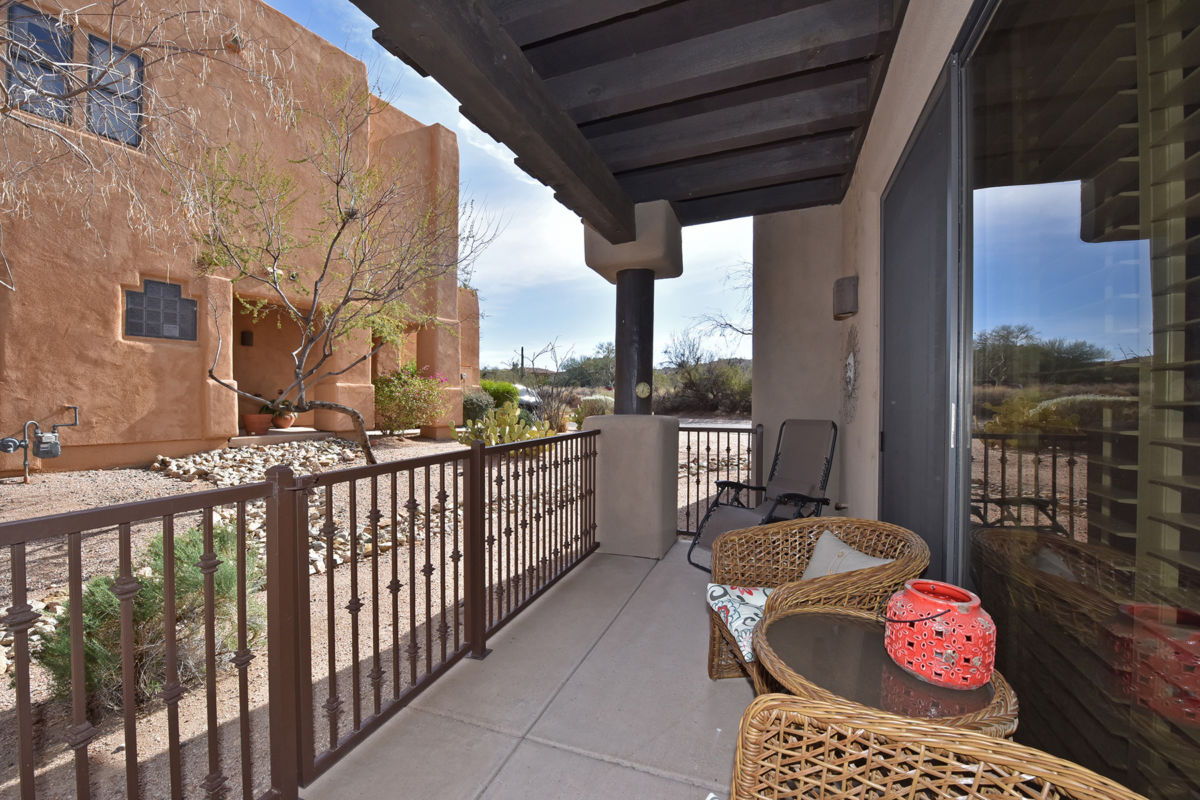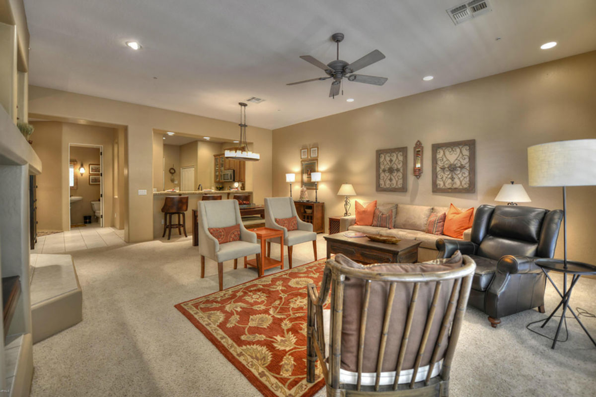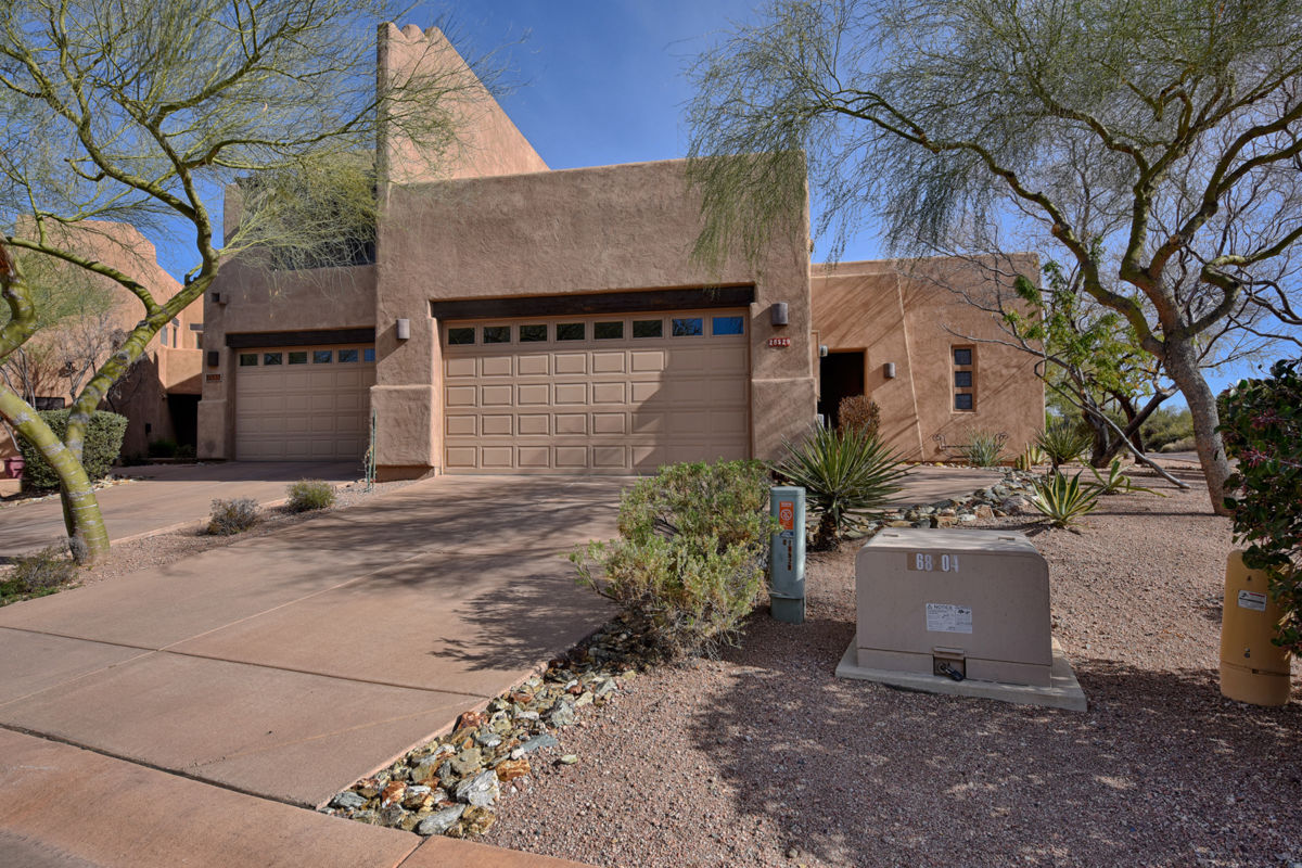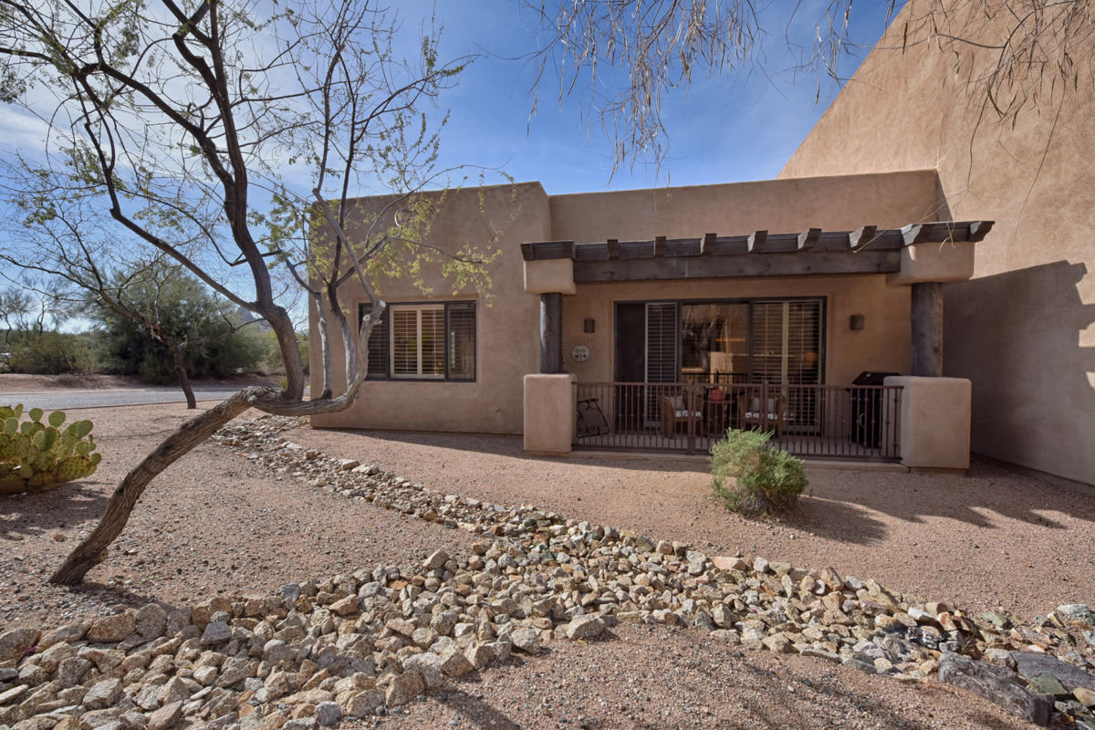 Immaculate, move-in ready town home in Troon North is model perfect. Single level home with no interior steps features open living spaces that include the dining area and living/family area with fireplace and built in shelving. The kitchen is chef inspired with plenty of counter space, granite surfaces, stainless steel appliance package, and a bar top area for additional seating. The master suite is light and bright featuring a walk-in closet, full bathroom with soaking tub and separate walk-in shower, two sink vanity, and oil rubbed bronze accents. Other features include an ensuite guest bedroom, powder bath, cozy patio space, two car garage with extended driveway, plantation shutters. Community features include access to heated pool and spa, fitness center, walking distance to Troon North Golf Club, and close to hiking, shopping & dining.