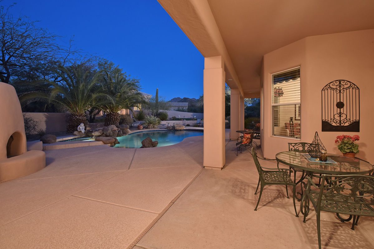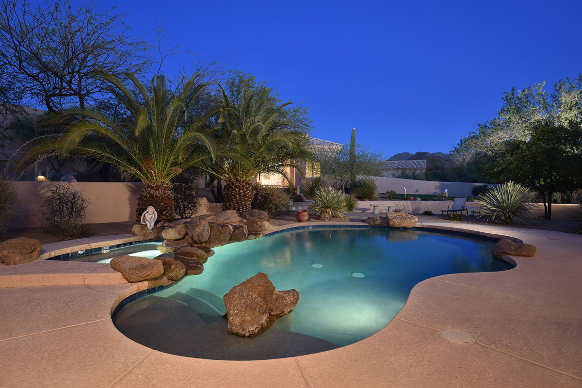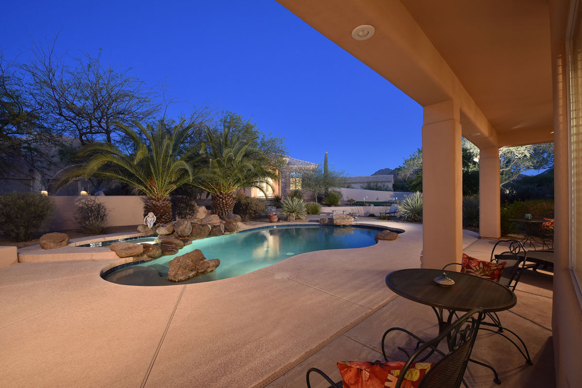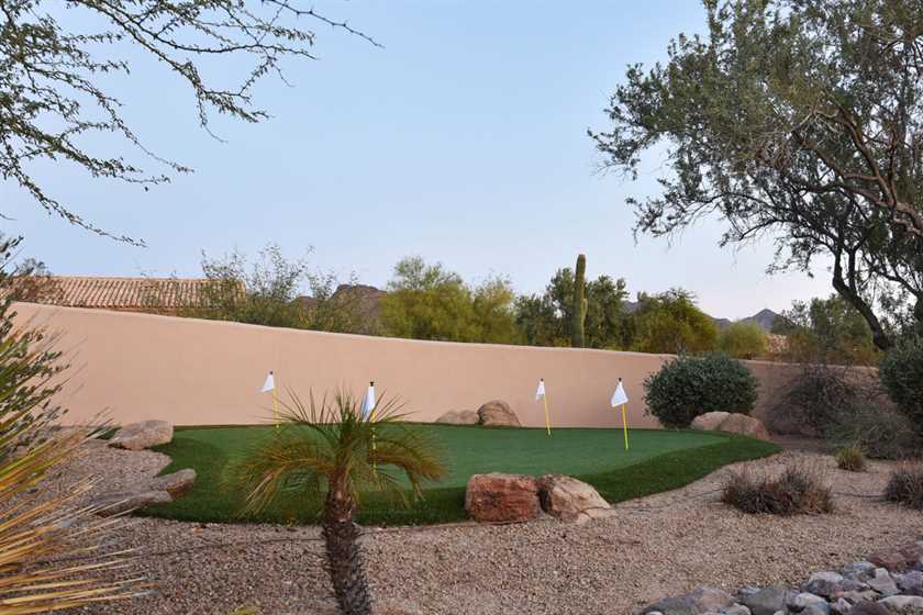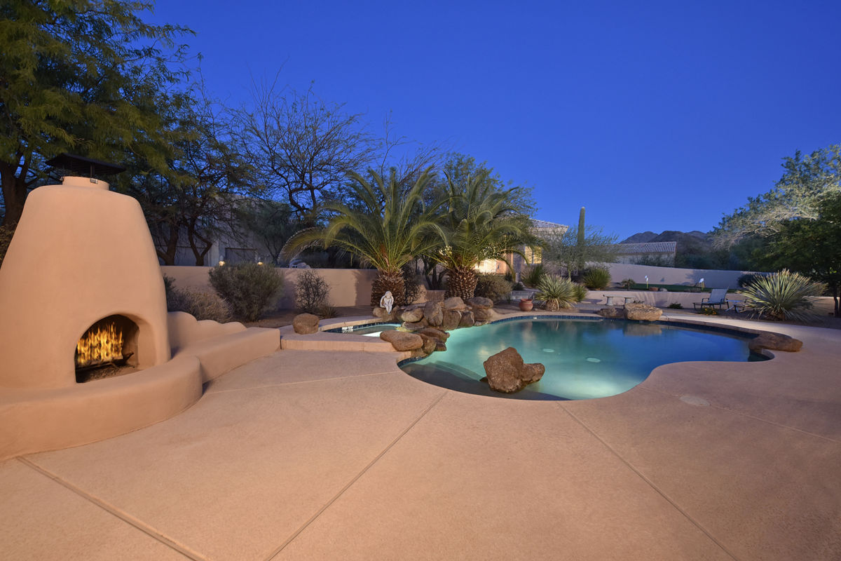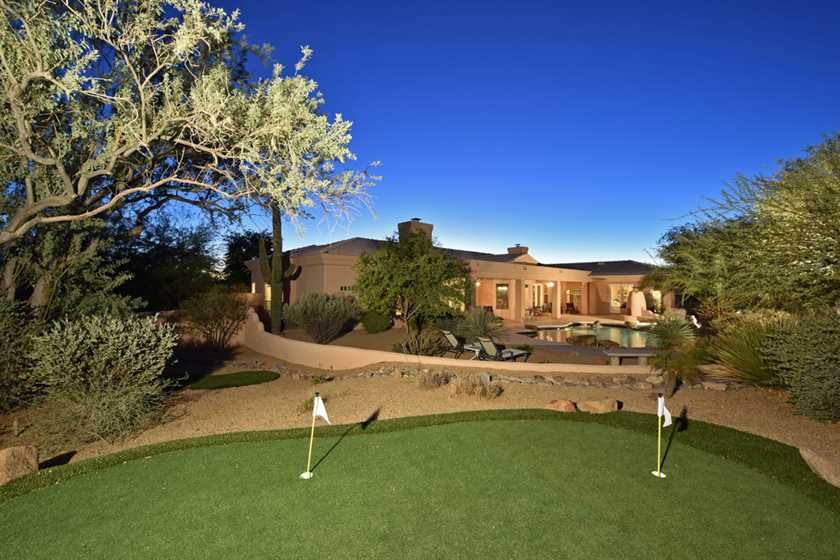 The beautifully landscaped backyard features mature landscaping, pebble-tec pool and heated spa, boulder waterfall feature, putting green, mountain views, kiva fireplace, built in BBQ, and covered patio for lounging and dining.