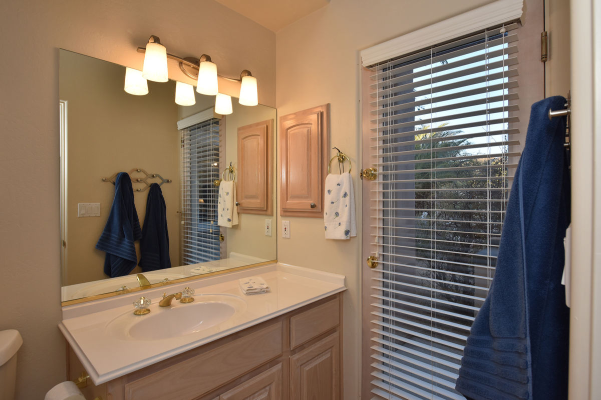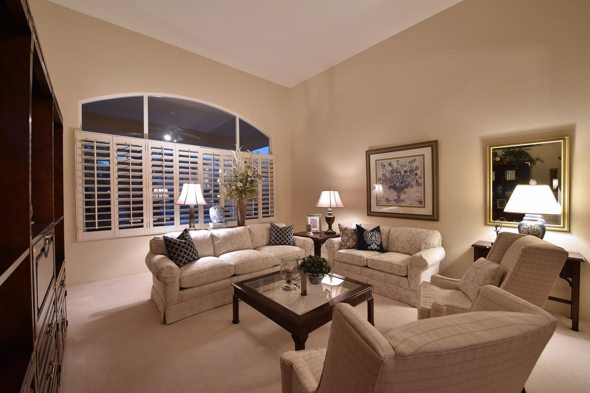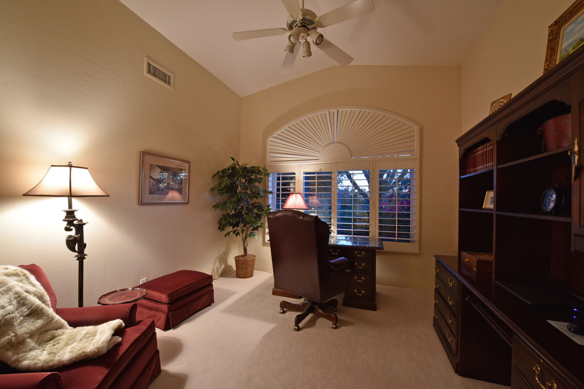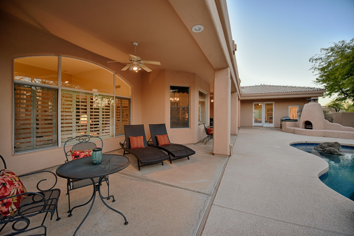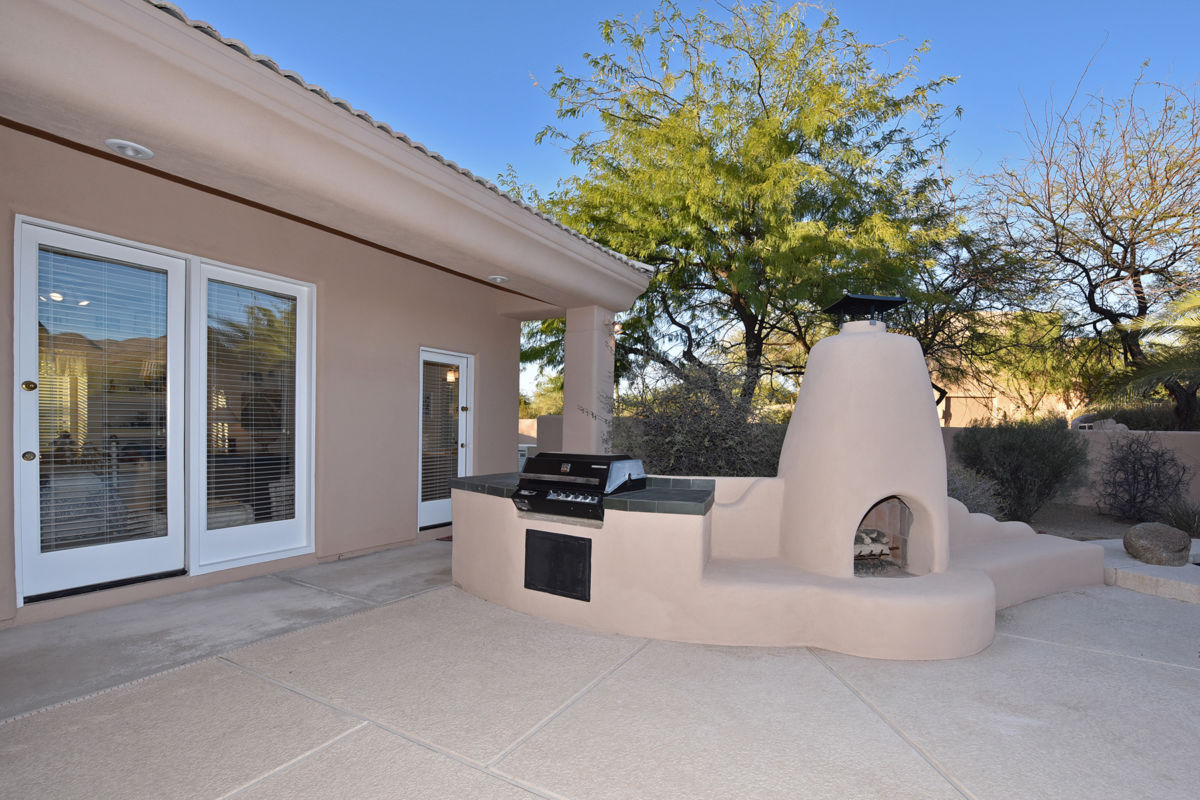 The beautifully landscaped backyard features mature landscaping, pebble-tec pool and heated spa, boulder waterfall feature, putting green, mountain views, kiva fireplace, built in BBQ, and covered patio for lounging and dining.