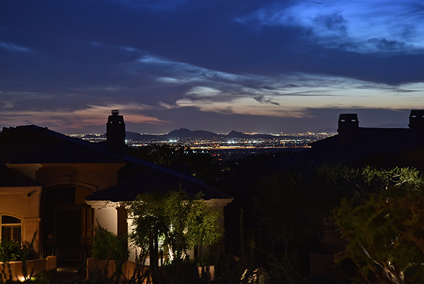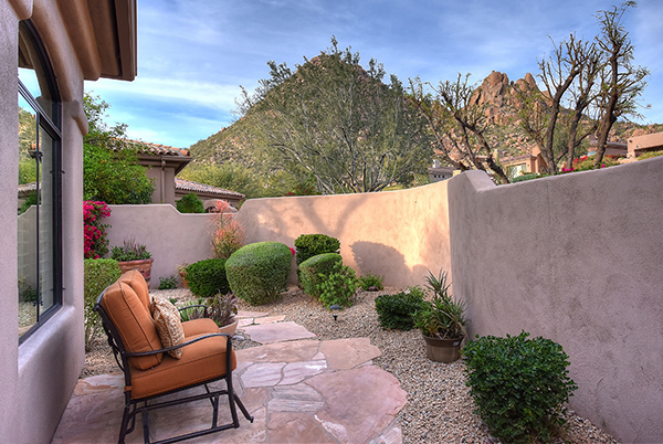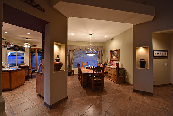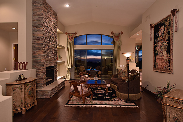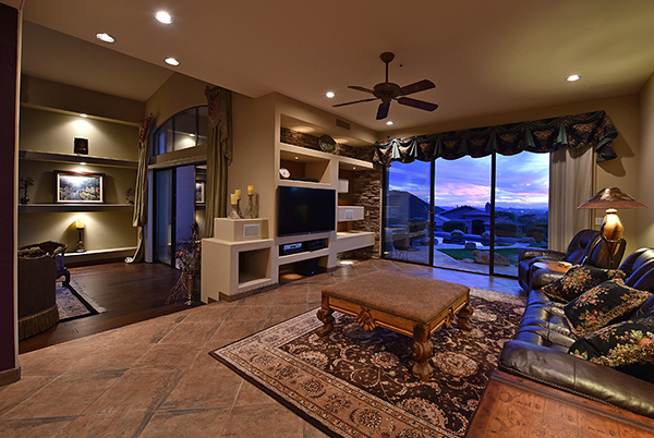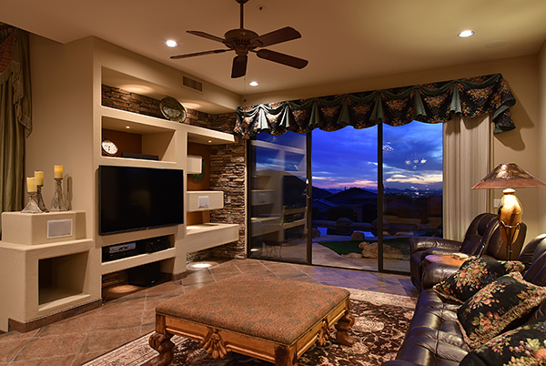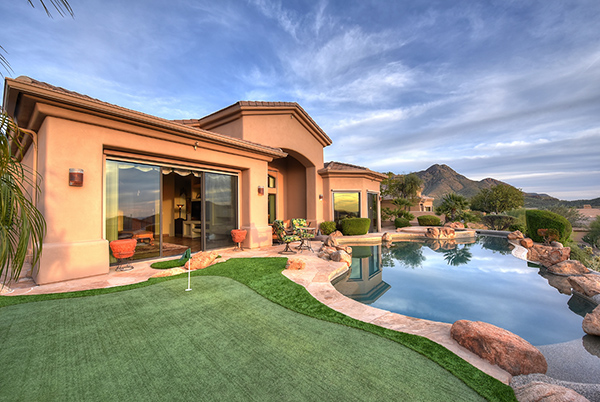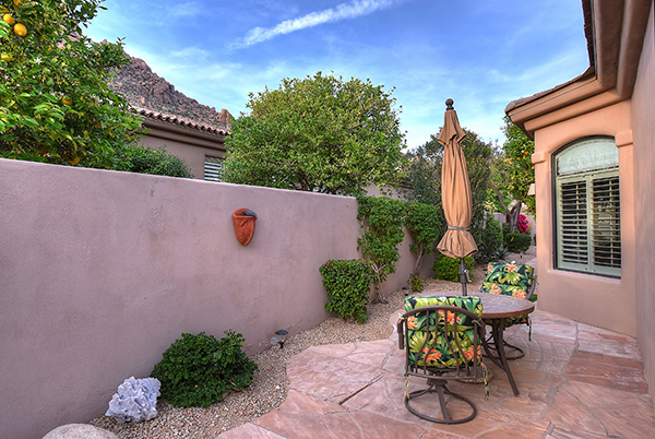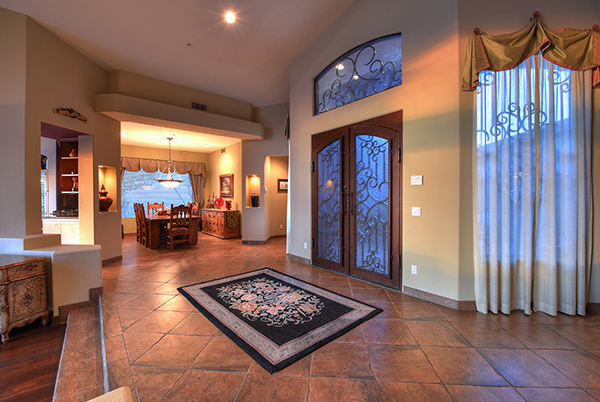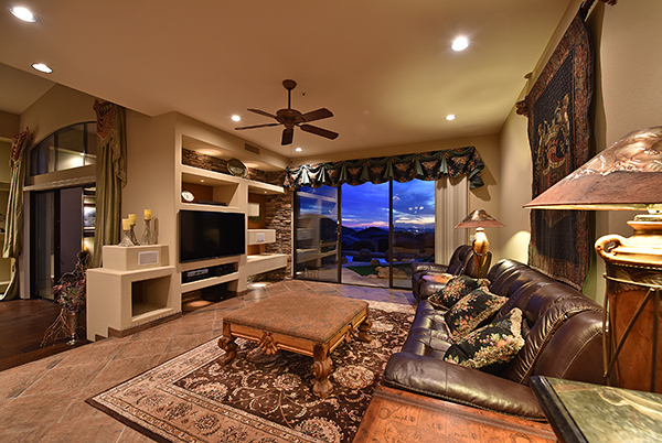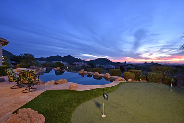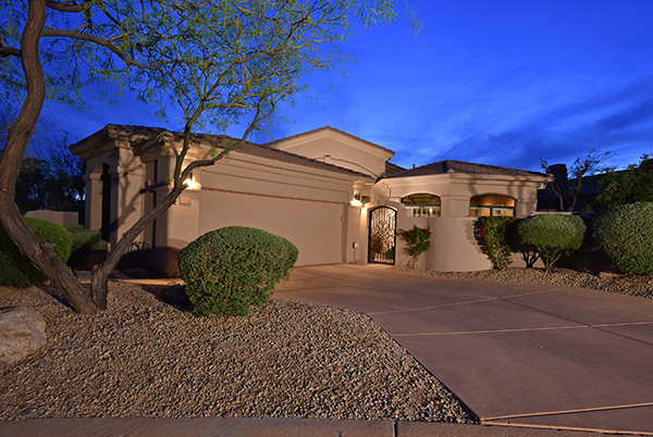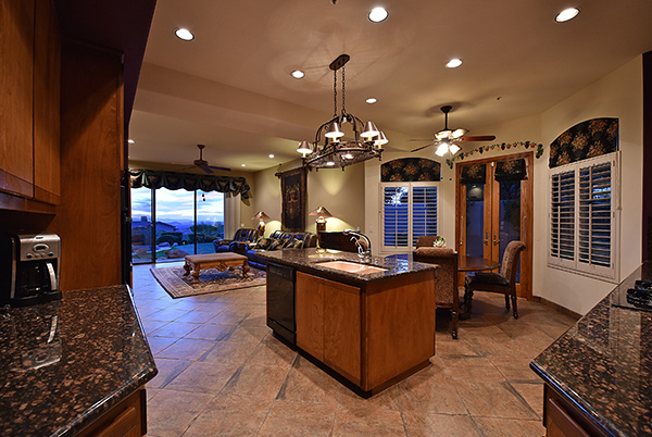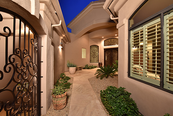 In the private gated community of Quail Ridge in Troon Village, this Edmunds custom residence is nestled within the gentle slopes of Troon Mt. Magnificent city light views from the back and stunning Troon Mt. views from the front. This quiet cul de sac home located towards the top of the subdivision, feature a charming front courtyard, cantera front door, custom window treatments, shutters, and spacious floor plan with 3,067 sf all rooms are a generous size. Kitchen has granite counters with full backsplash, island with sink, and double doors off Breakfast nook for outside entertaining. 3rd Bedroom is used as an office and has a Murphy Bed. Beautiful negative edge Pebble Tec pool, spa, firepit, putting green, and endless city light and sunset views! Freshly painted interior.