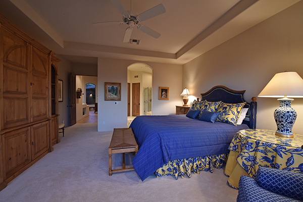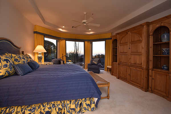 A large master suite with exterior access and relaxing master bath boasts double sinks, built in makeup seat, walk-in shower with custom cut glass, soaking tub, and walk in closet. The kitchen has an two islands, one with a sink and one with counter seating, classic shaker cabinets, beautiful granite slab countertops and opens to the family room with fire place and access to the exterior patio.