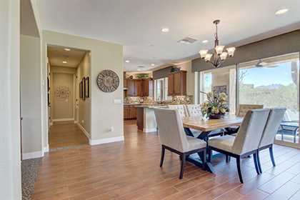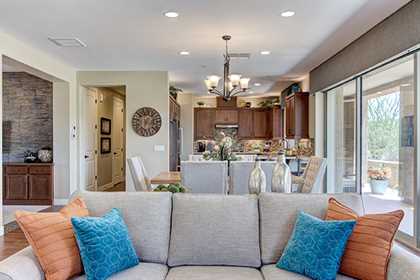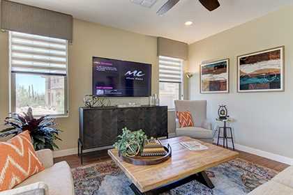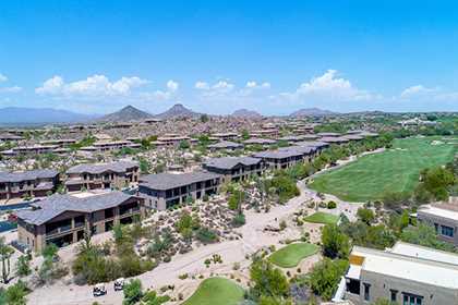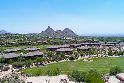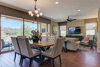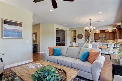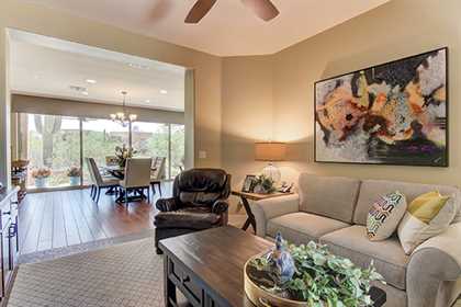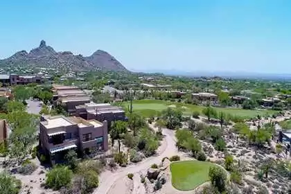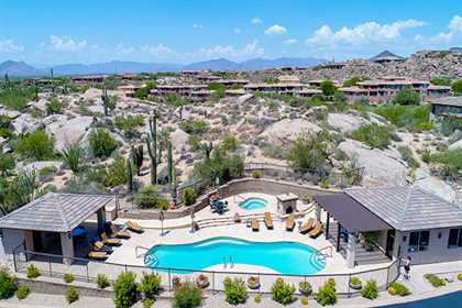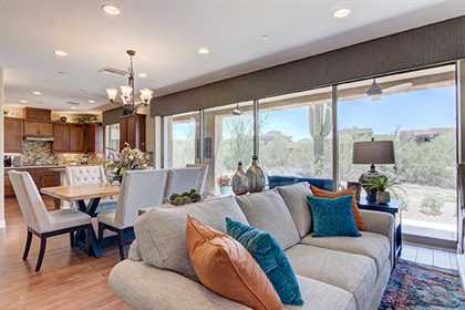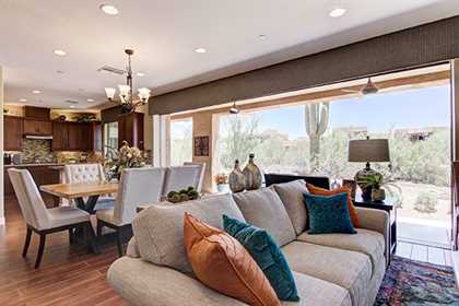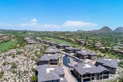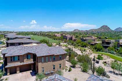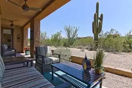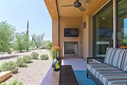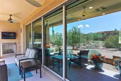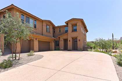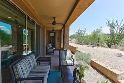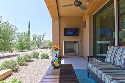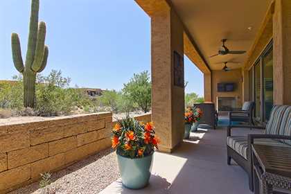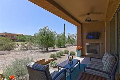 Stunning and pristine ground level end unit located in the Ridge at Troon North shows like a model home! Home includes most furnishing and accessories that have been hand selected by an interior designer. Direct entry from the 2-car tandem garage located directly across from the garage allows for ample additional and guest parking. The open floor plan allows for seamless entertaining with the large expanse of pocketing doors highlighting the 9th hole of the Monument course, mountain and sunset views.