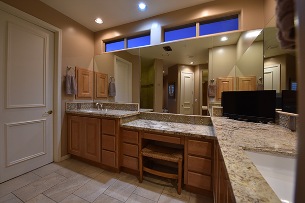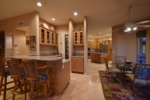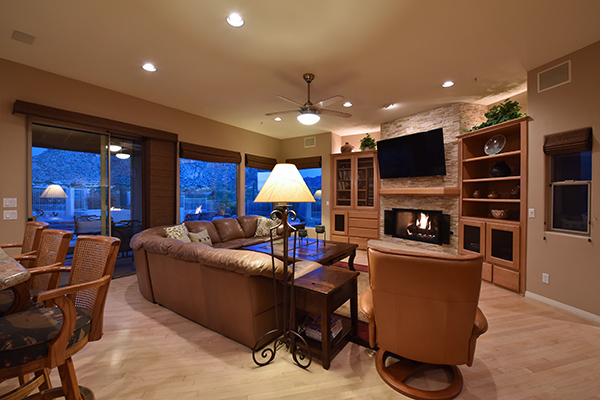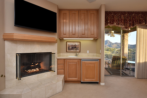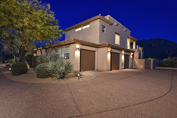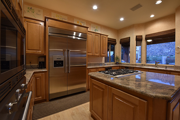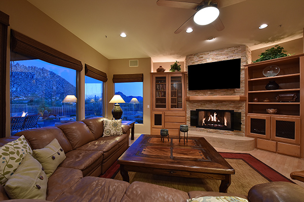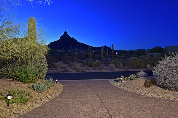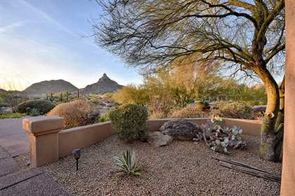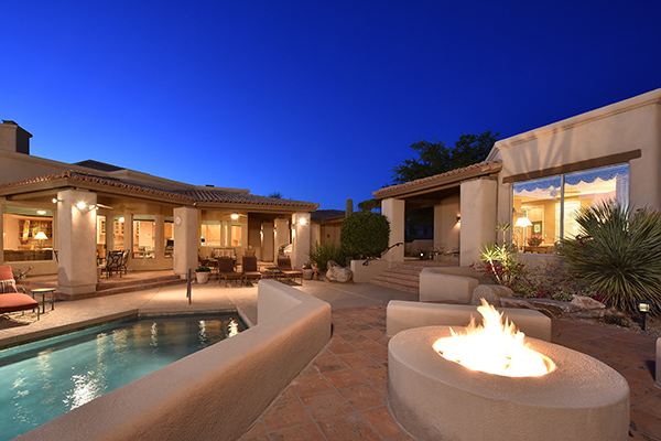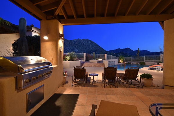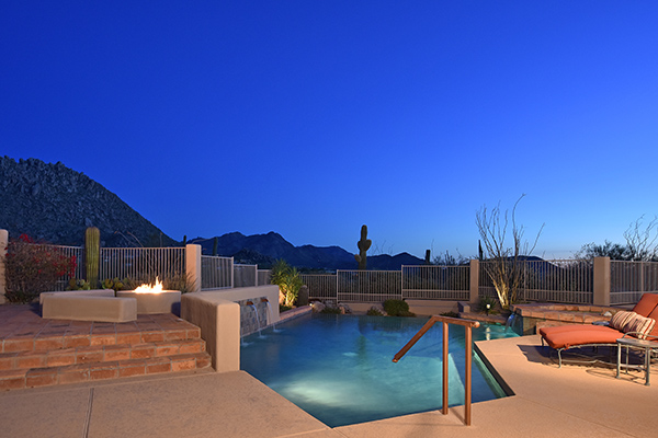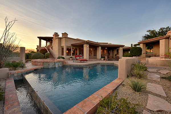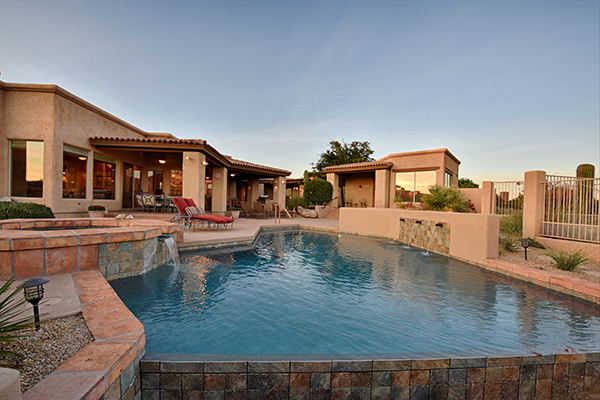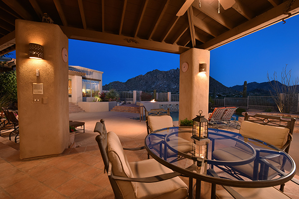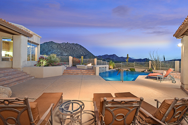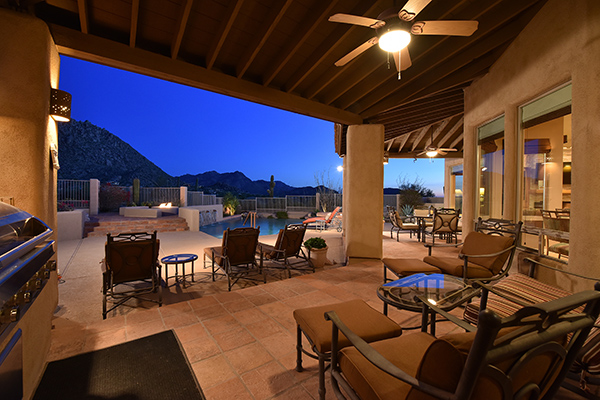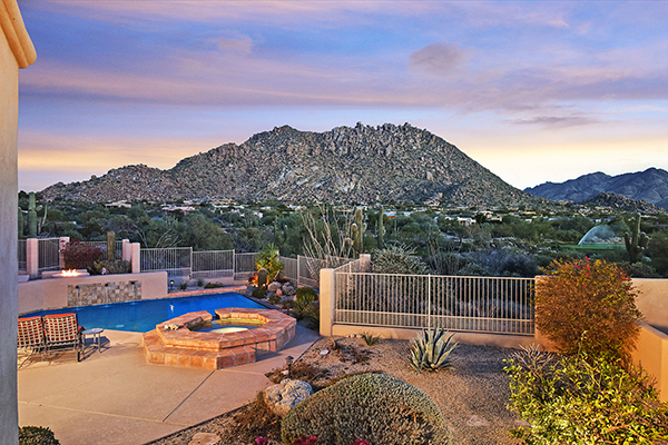 Thoughtfully situated on a golf course lot to maximize views, this gated Troon Fairways home featuRes4 bedrooms and 4.5 baths with commanding views of several Troon Golf fairways, Troon Mountain, the McDowell Mountains, and Pinnacle Peak. Enjoy the famed Arizona weather from the backyard with pool and built-in water feature, elevated spa, fire pit, multiple lounge and dining areas, and built in BBQ. The master bedroom, complete with fireplace and wet bar, continues to highlight the surrounding views with it’s own personal balcony and staircase with access to the backyard. Master bath featuResdual sinks with built in vanity, recessed soaking tub with private view window, walk in shower, and large closet. A detached casita with full bath, sitting room, and private bedroom with extraordinary views is perfect for visiting guests. Traditional living spaces allow for flexible use with the living and dining rooms separated by a two way fireplace, a game area with built in cabinetry, full wet bar with wine storage opening to the breakfast area and family room with cozy stacked stone fireplace anchored by built in entertainment units. The kitchen has a stainless steel appliance package, granite counters, six-burner gas cooktop, and a view to the exterior.
