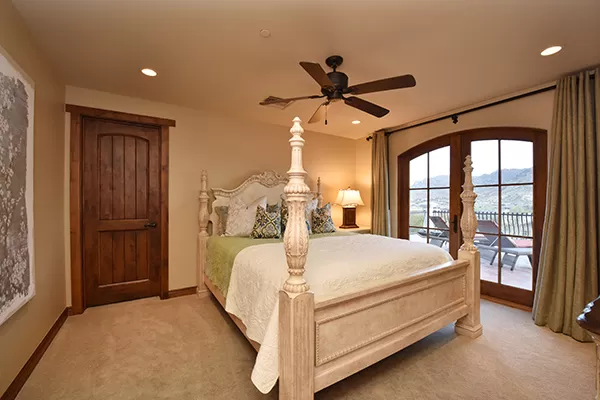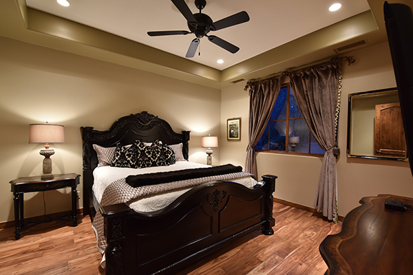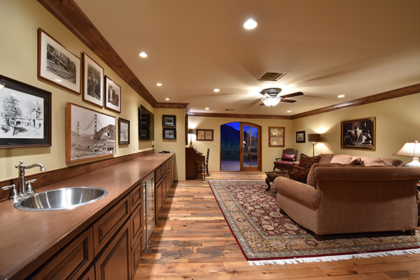 The lower level master suite has it’s own sitting room and exterior access with an ensuite bath including his and her’s sinks and walk-in closets, jetted soaking tub, and a separate shower with intricate tile work. Two additional ensuite bedrooms and den are located downstairs. Upstairs is a bonus living space with view deck access, and built in cabinetry with refrigerator and sink, and an additional bedroom with full bath.