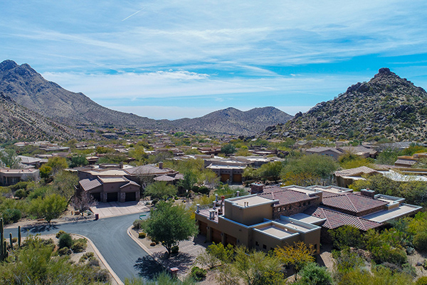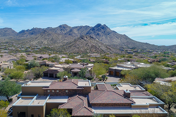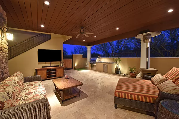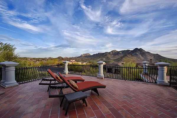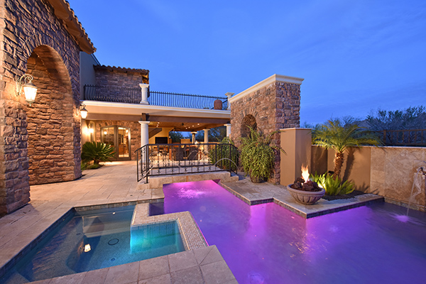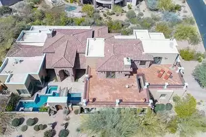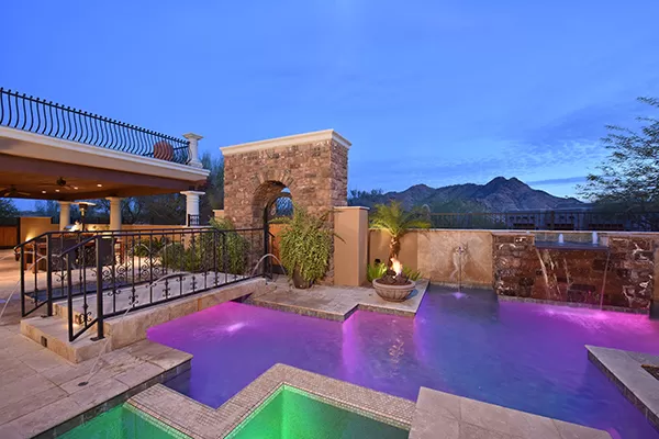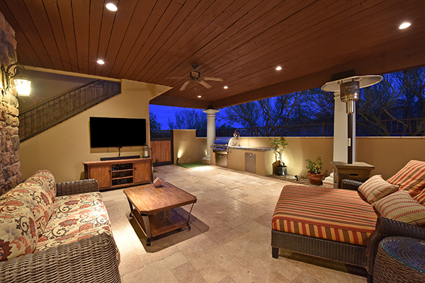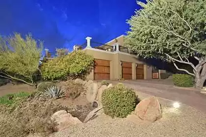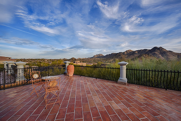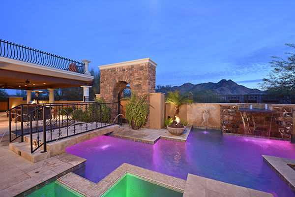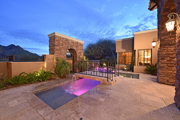 The spacious rooftop deck allows for nearly 360-degree views including Troon Mountain and the McDowell Mountain range. The grounds are designed for entertaining with a front entry bridge over the heated pool and spa leading to the entry courtyard then wrapping around to the large, fully covered patio with built in BBQ, travertine tile and large pocketing doors to bring the inside out.