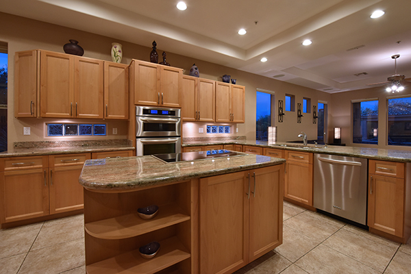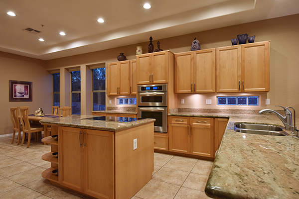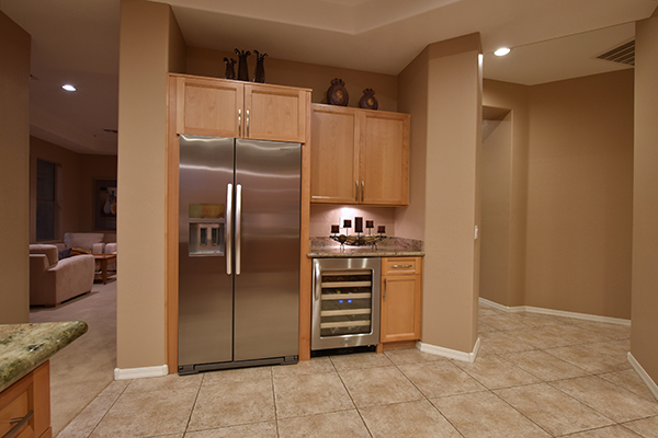 The family room is open to the kitchen and features exterior access, built in shelving, stacked stone accents, and a cozy gas fireplace. The well thought out, remodeled kitchen has all the amenities including center island with cooktop, counter top seating, stainless steel appliance package with wine fridge, and separate breakfast area.