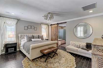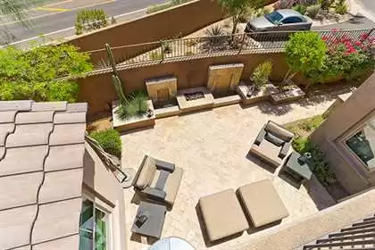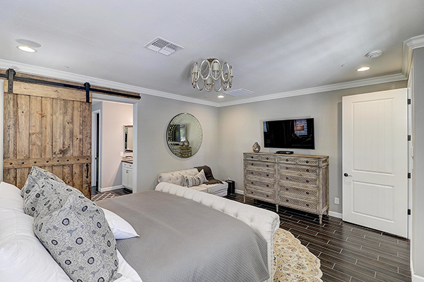The downstairs master continues with the rich wood tile floors and has views into the rear yard with dual water features, covered patio, built in BBQ, and fire pit. The master bath is guarded by a custom reclaimed wood barn door and features dual vanities, separate shower and soaking tub, and a large walk in designer closet. Upstairs are two additional bedrooms and bath and an open loft with built in storage and desk niche, and a private balcony with city light and up close McDowell Mountain views.