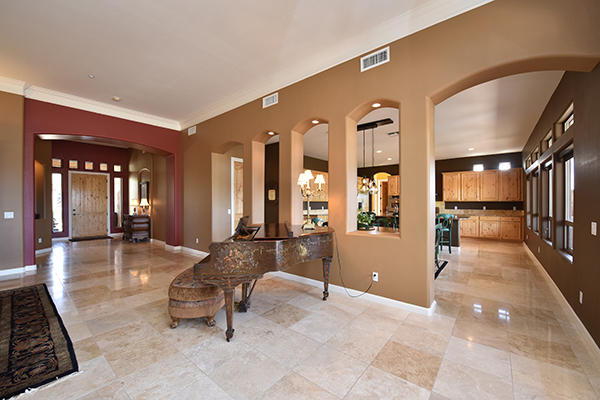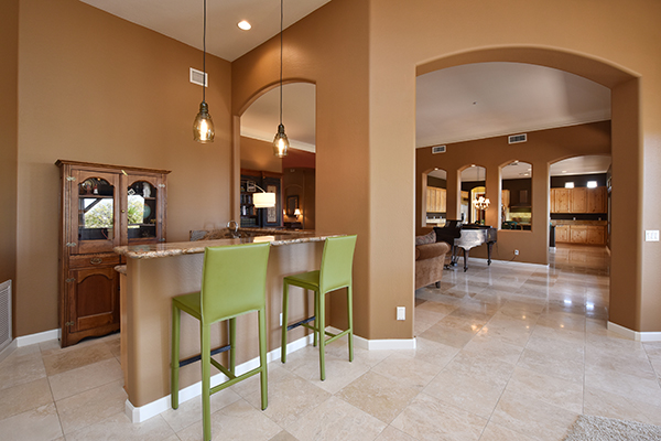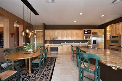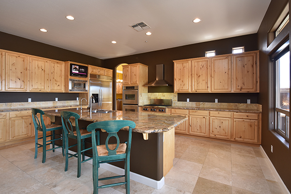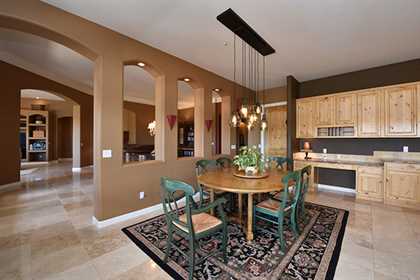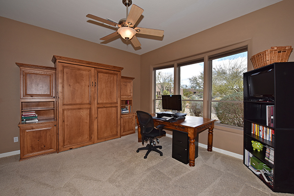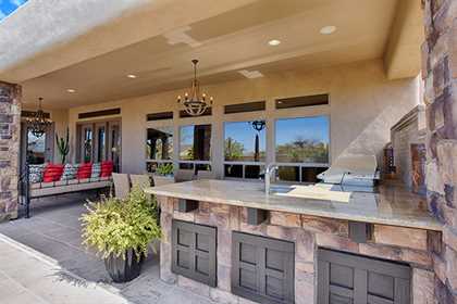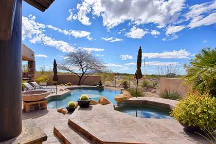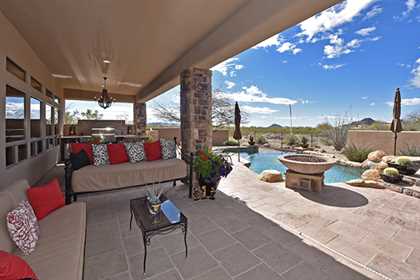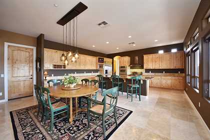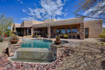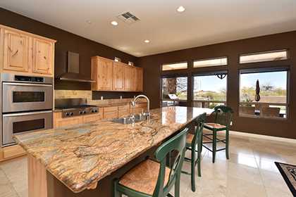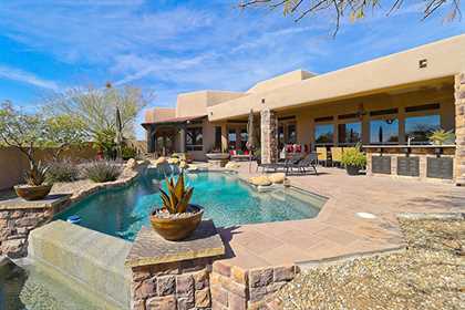 The kitchen is well appointed with a large breakfast area, stainless steel appliances, two wall ovens, built in microwave, gas cook top, granite counters, floating island with counter top seating. The backyard is a great space for entertaining with a heated pool and spa with negative edge waterfall, full covered outdoor kitchen, built in BBQ, view fencing, and a large fire pit for those beautiful Arizona evenings.