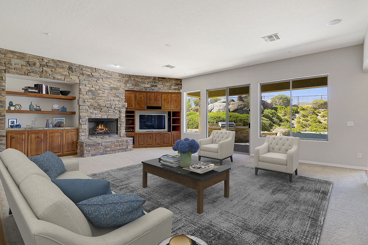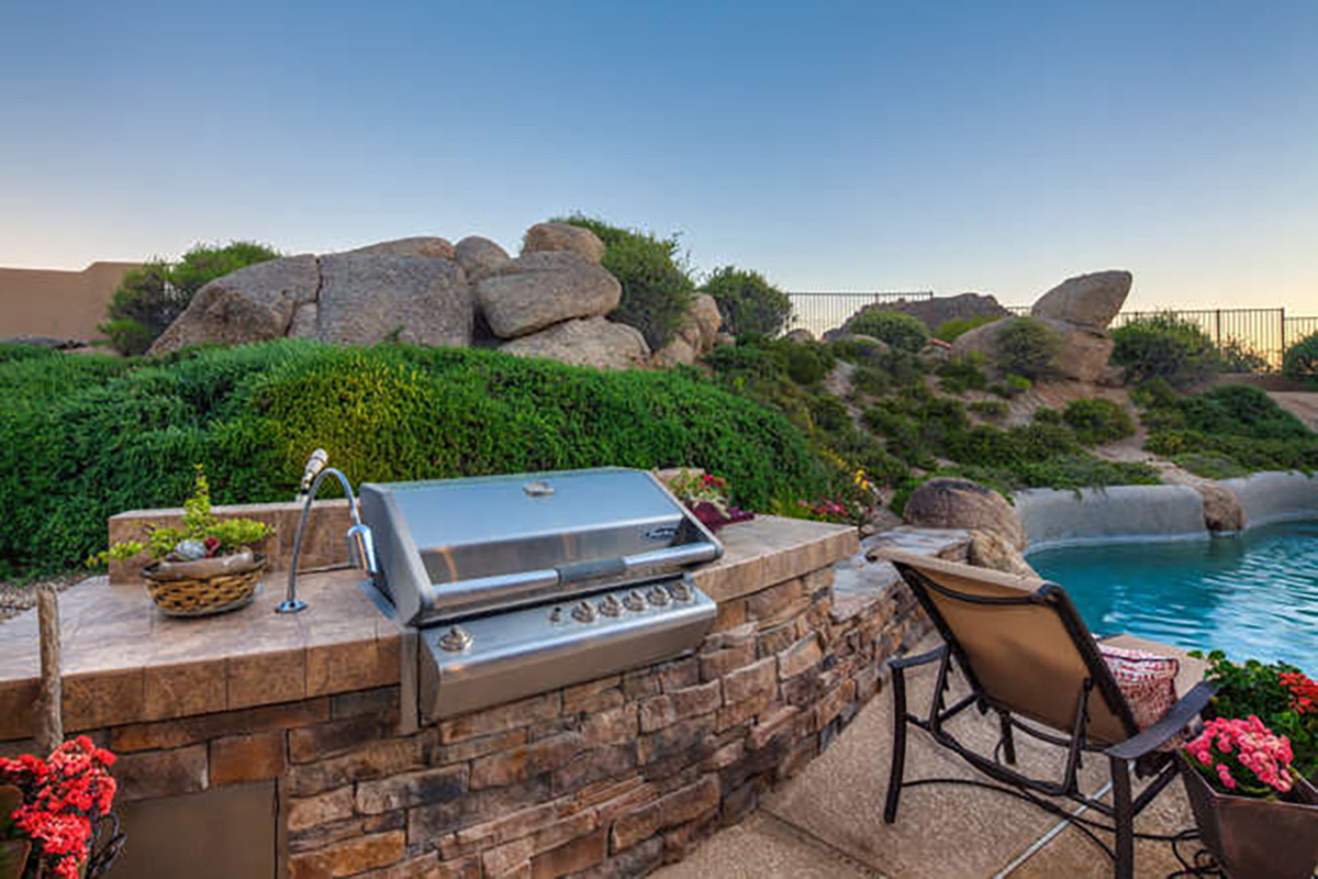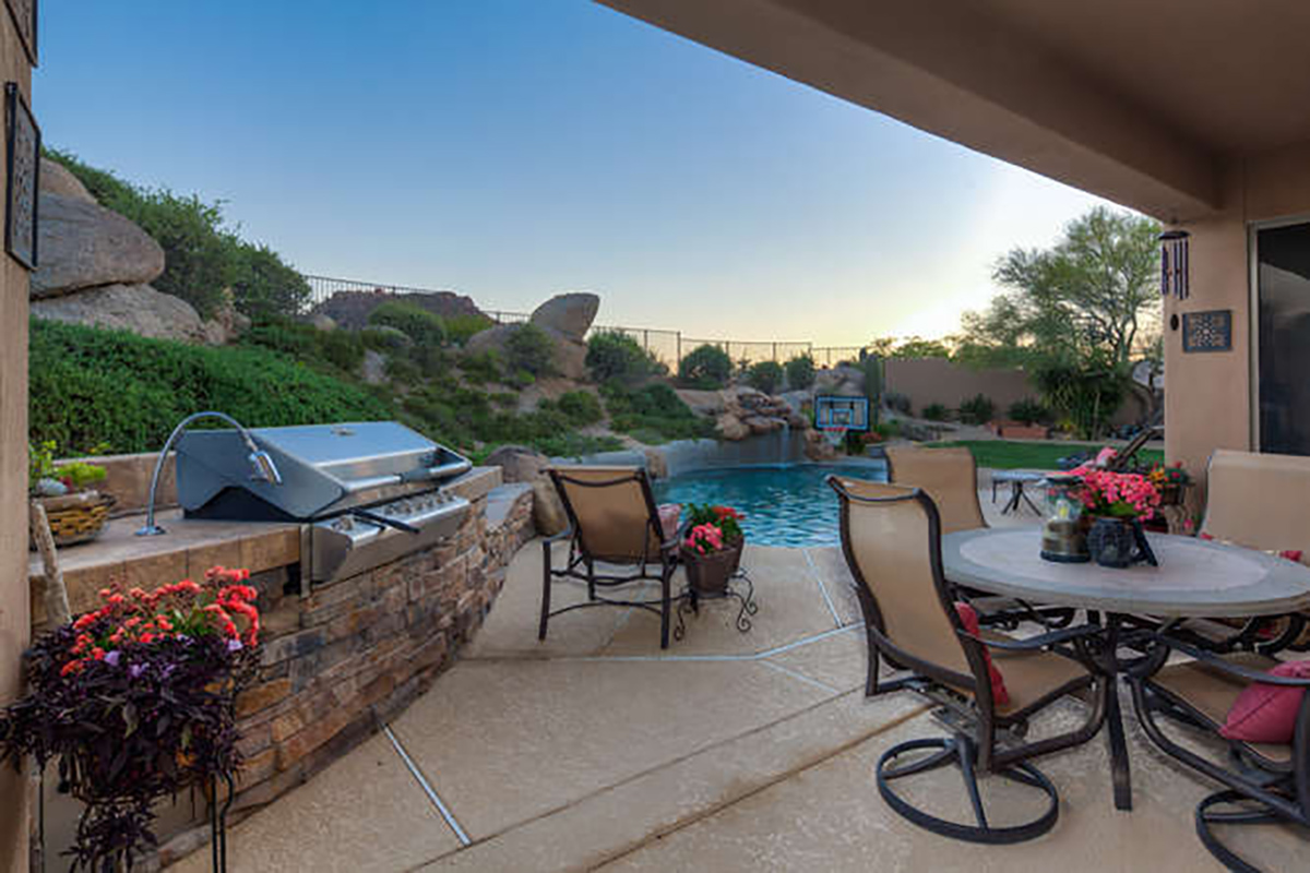 Throughout the home you can find elements of rustic charm with a beamed ceiling and wood accents in the office, charming stone entry bridge and stacked stone in the great room playing off the natural boulders in the backyard. The beautiful Southern exposure backyard makes this the perfect space for relaxation and entertainment with a PebbleTec salt water heated play pool, covered patio for exterior dining and lounging, built in barbecue, two grass play areas, and classic sunset views!