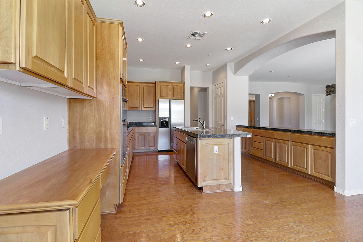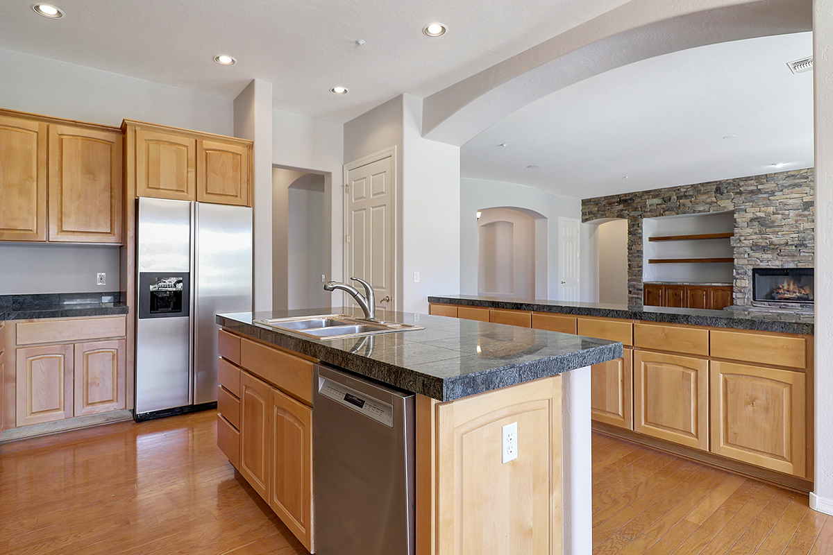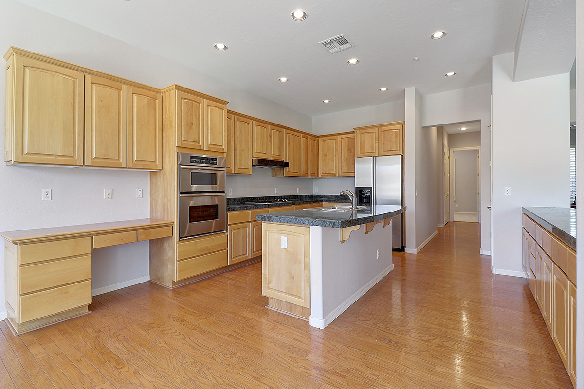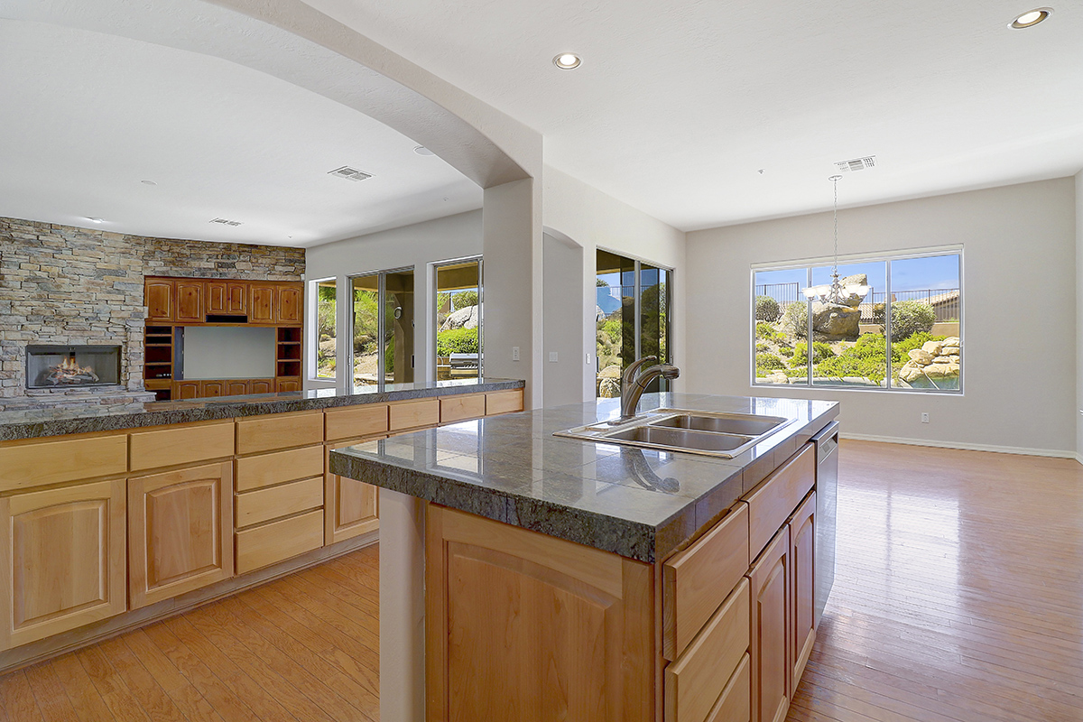 The kitchen features a gas cooktop, breakfast nook, stainless steel appliances, built-in desk, granite counters, center island with seating, built in buffet, all overlooking the great room with fireplace and backyard.