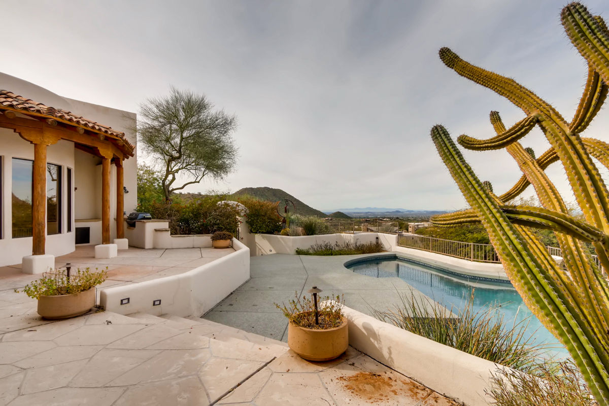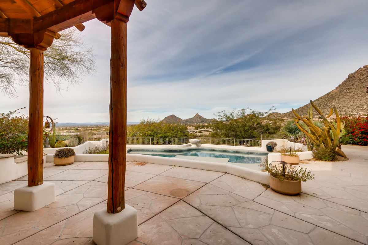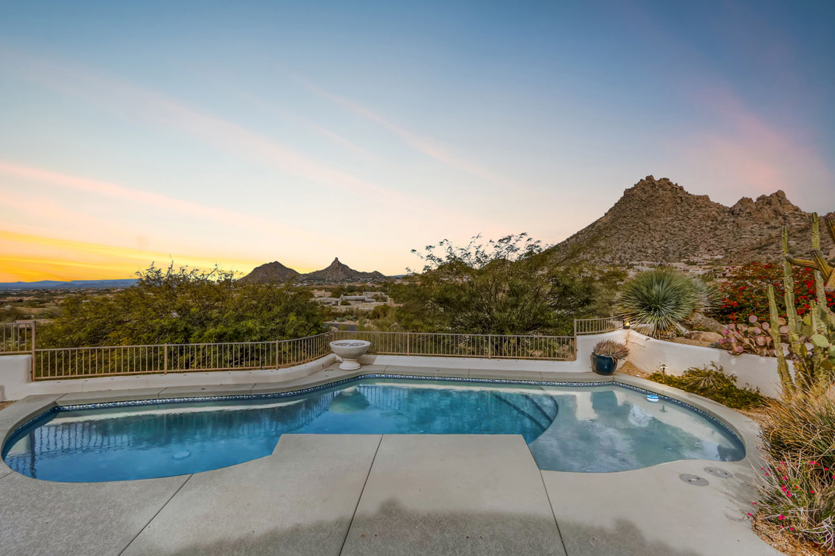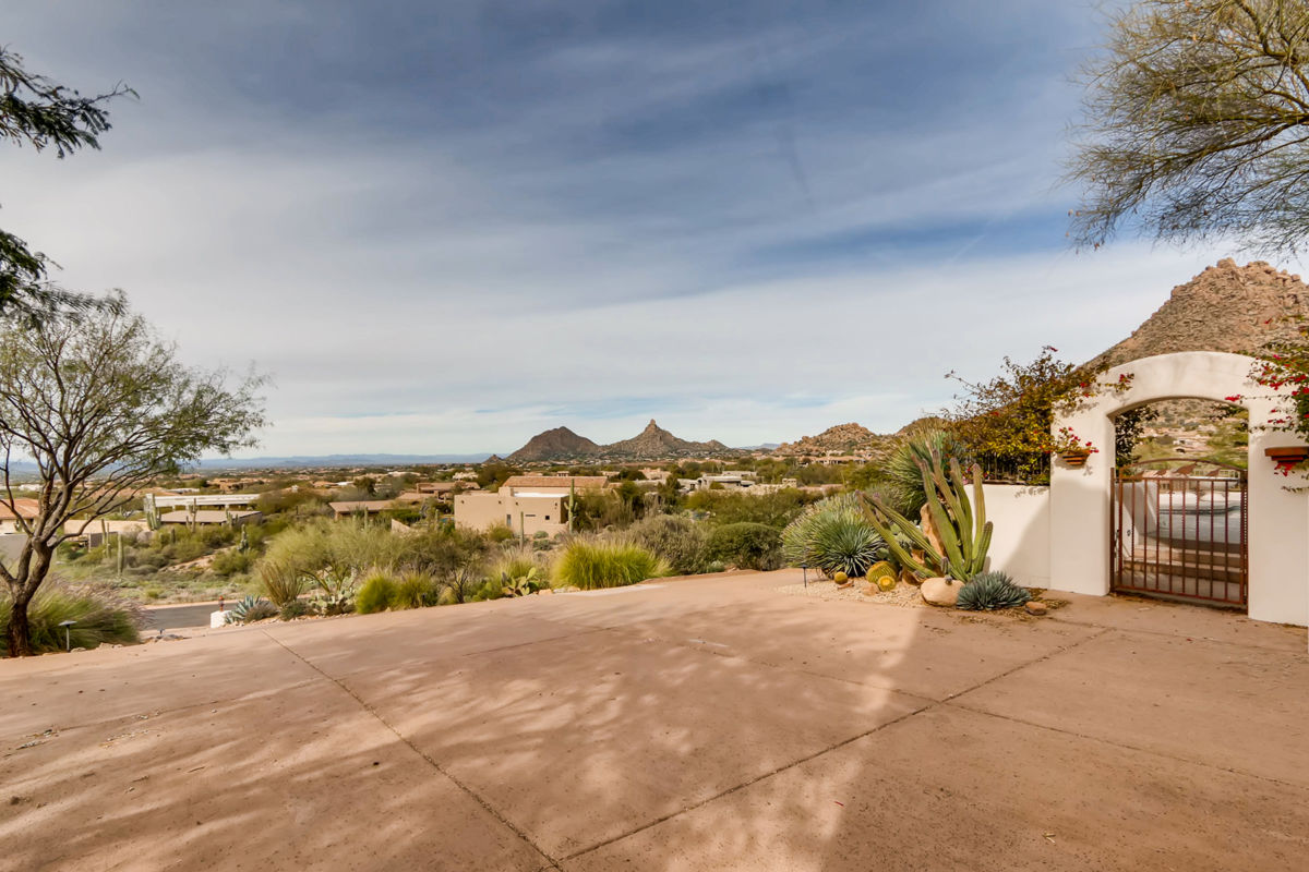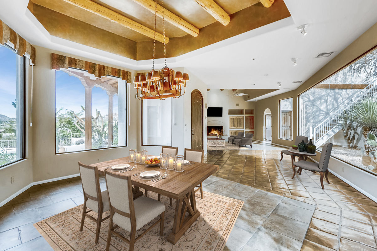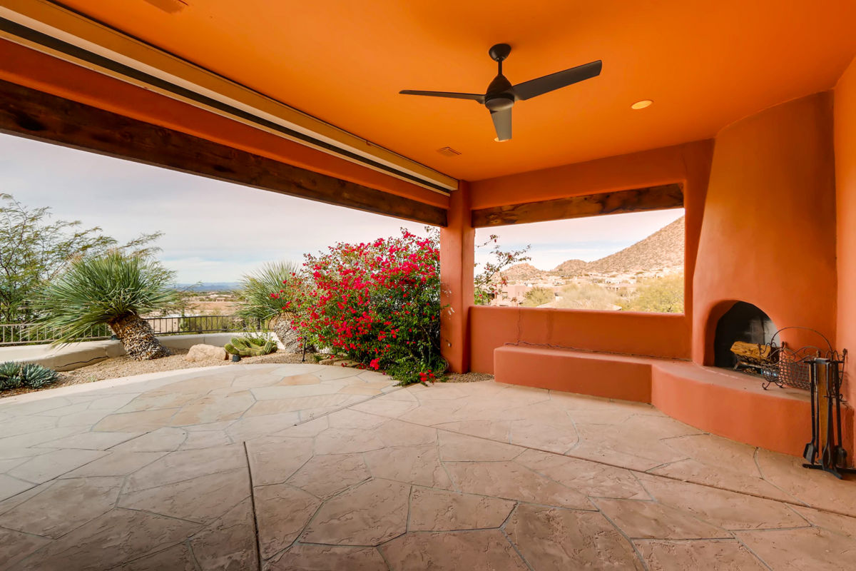Dynamite views and Southwest charm define this guard-gated Glenn Moor at Troon Village residence. Located on an elevated, unique lot featuring walls of windows showcasing the 360 degree views of the McDowell Mountains, Pinnacle Peak, Troon Mountain, and twinkling city lights. Saltillo tile, Vega beams, latillas, smooth stucco, and kiva fireplaces accent the interior and exterior highlighting the Southwest decor.
