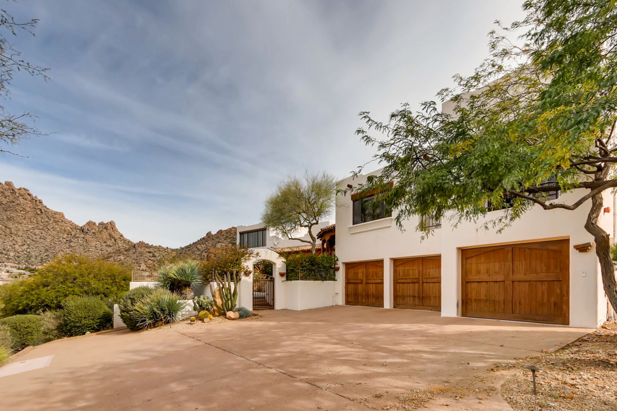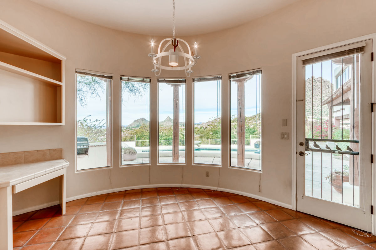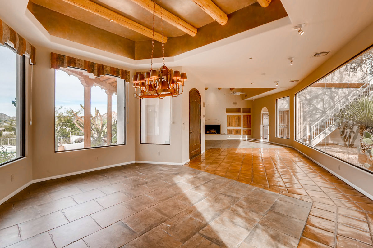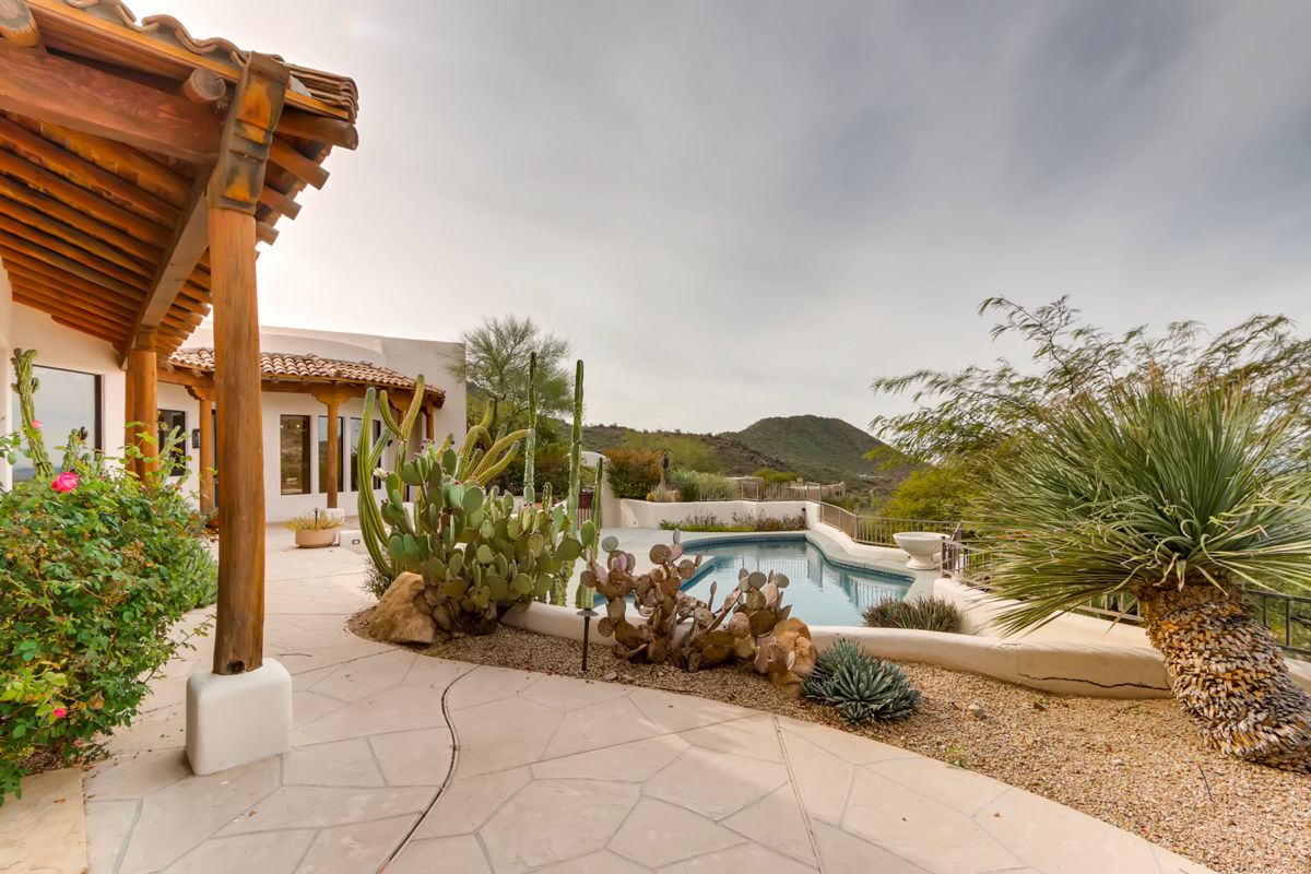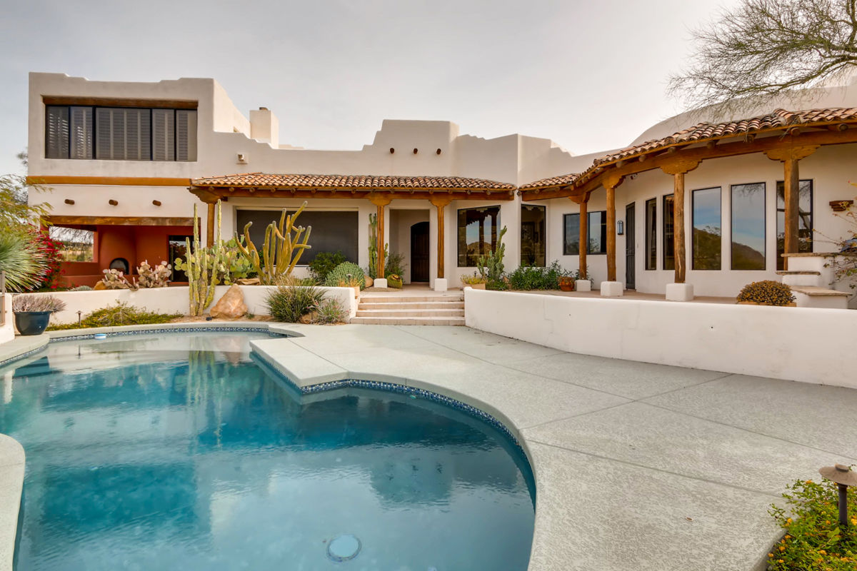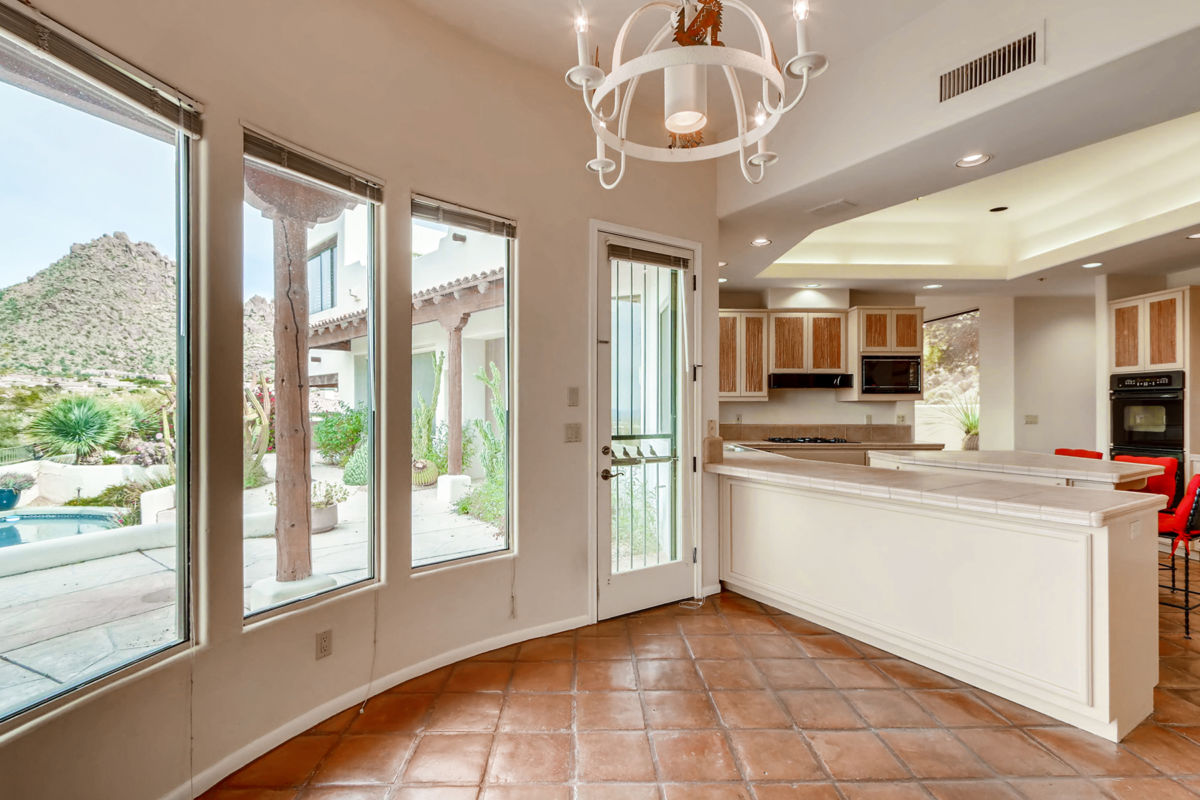 Dynamite views and Southwest charm define this guard-gated Glenn Moor at Troon Village residence. Located on an elevated, unique lot featuring walls of windows showcasing the 360 degree views of the McDowell Mountains, Pinnacle Peak, Troon Mountain, and twinkling city lights. Saltillo tile, Vega beams, latillas, smooth stucco, and kiva fireplaces accent the interior and exterior highlighting the Southwest decor.