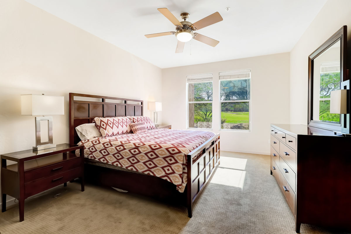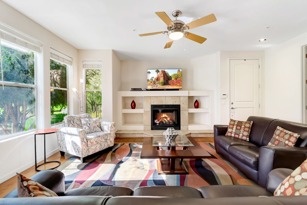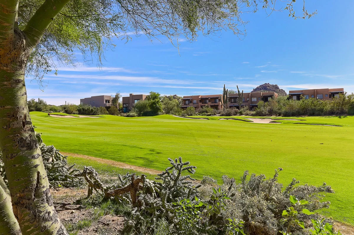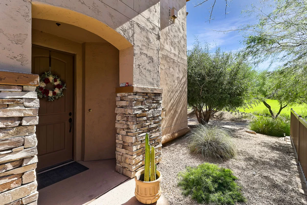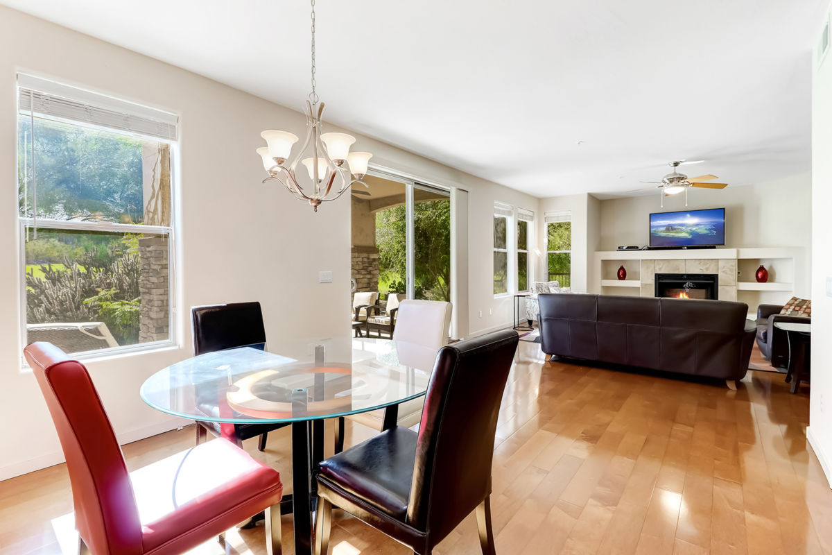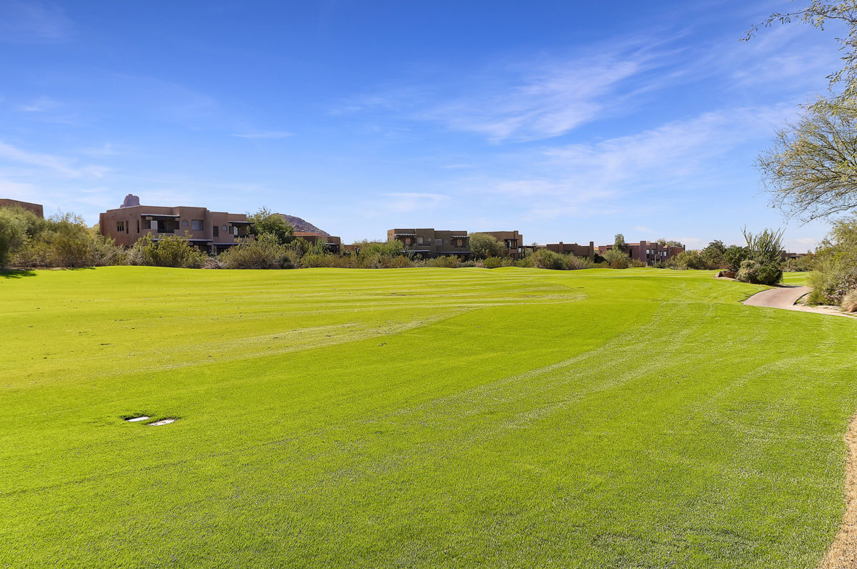 Light, bright and move in ready! Located in the gated community of the Ridge at Troon North this two bedroom plus den, two-bath home backs to the 9th Fairway of Troon’s Monument course. This ground level end unit has an open floor plan with no interior or exterior steps and a private side entry! The meticulously kept unit has a designer kitchen with warm cherry wood cabinetry, ample storage, stainless steel appliances with gas stove, bar seating, and gorgeous slab granite counters. The living room has a cozy fireplace, hardwood floors, built in shelving, and opening to both the den and dining room creating inviting gathering spaces.