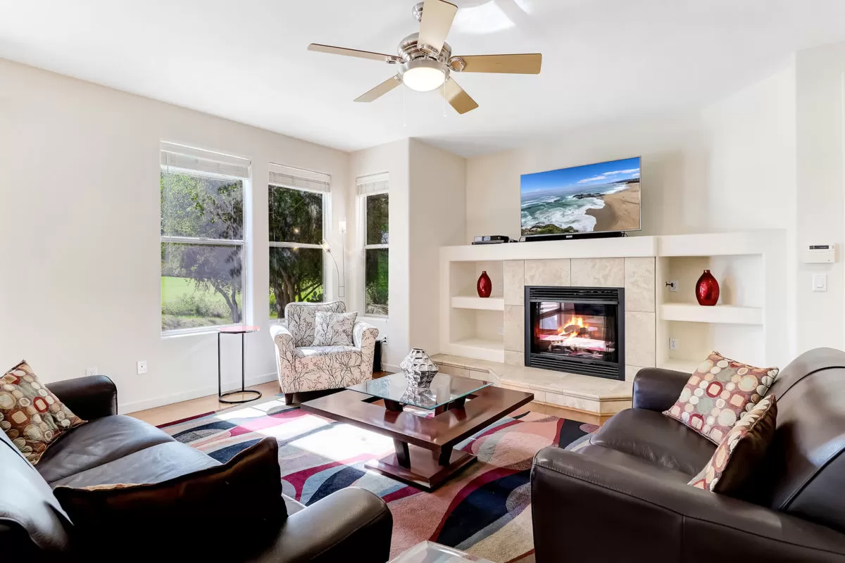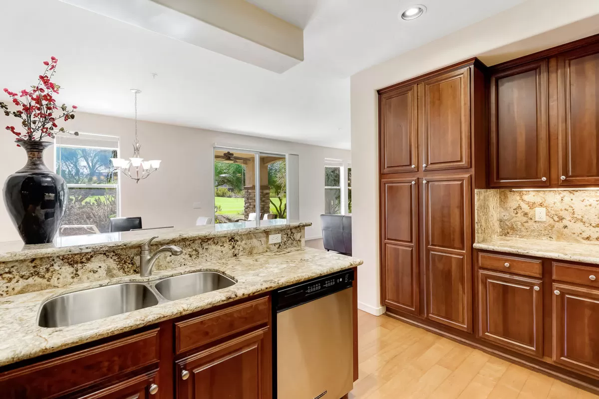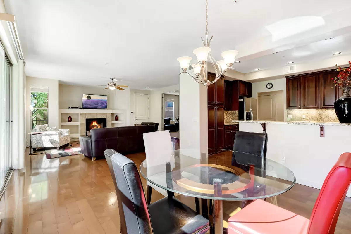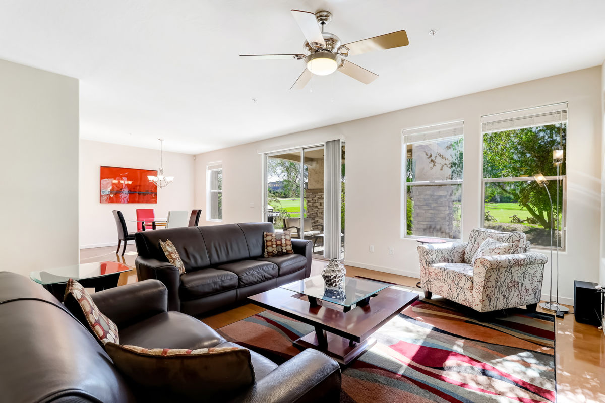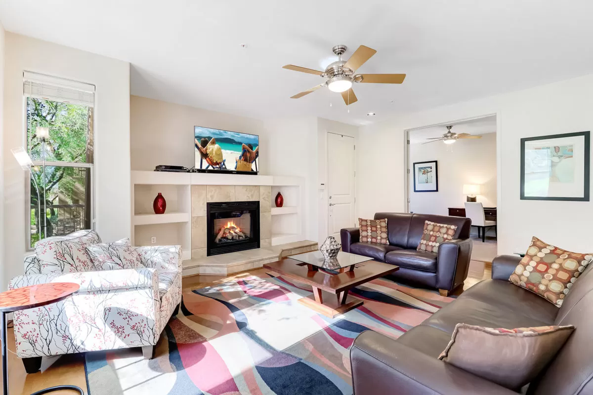 Light, bright and move in ready! Located in the gated community of the Ridge at Troon North this two bedroom plus den, two-bath home backs to the 9th Fairway of Troon’s Monument course. This ground level end unit has an open floor plan with no interior or exterior steps and a private side entry! The meticulously kept unit has a designer kitchen with warm cherry wood cabinetry, ample storage, stainless steel appliances with gas stove, bar seating, and gorgeous slab granite counters. The living room has a cozy fireplace, hardwood floors, built in shelving, and opening to both the den and dining room creating inviting gathering spaces.