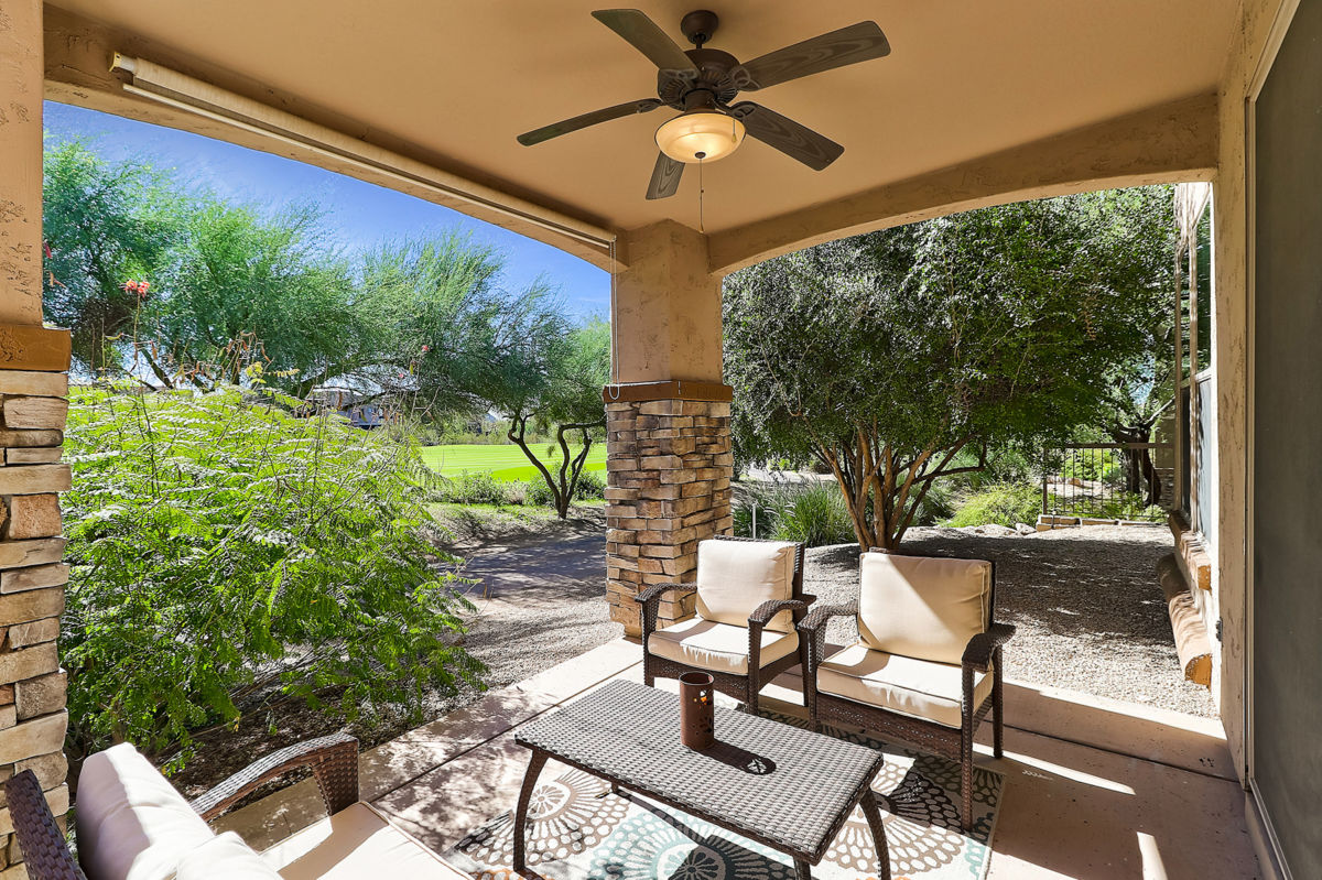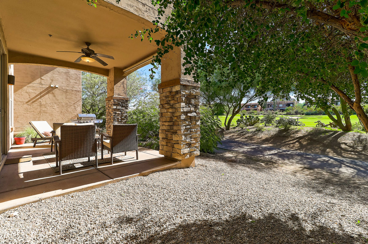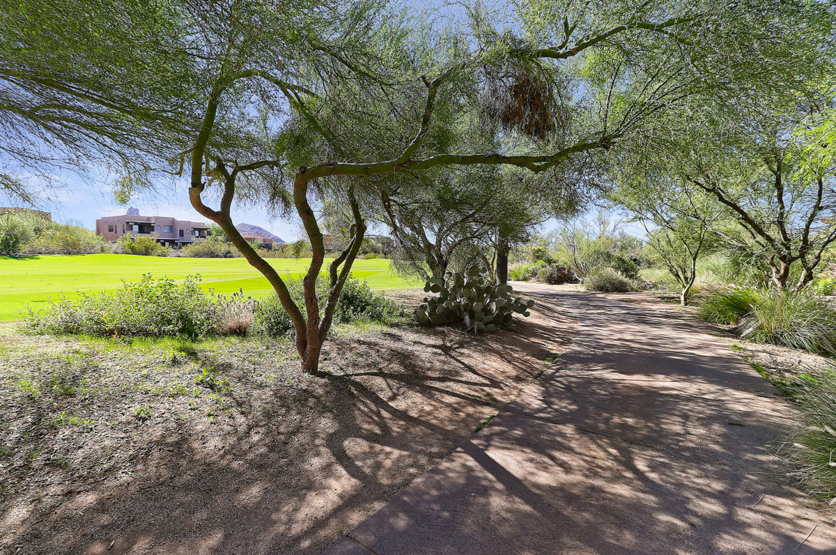A South facing back patio great for entertaining has direct views of the golf course and Pinnacle Peak in the distance. The two-car side-by-side garage has direct entry into the spacious laundry with matching cabinetry and counters, laundry sink and full size washer and dryer and an extended driveway. Within walking distance to the community facilities including fitness room and community pool and spa as well as Troon North Golf Club, this move-in ready home is perfect for full time residents or a lock and leave.