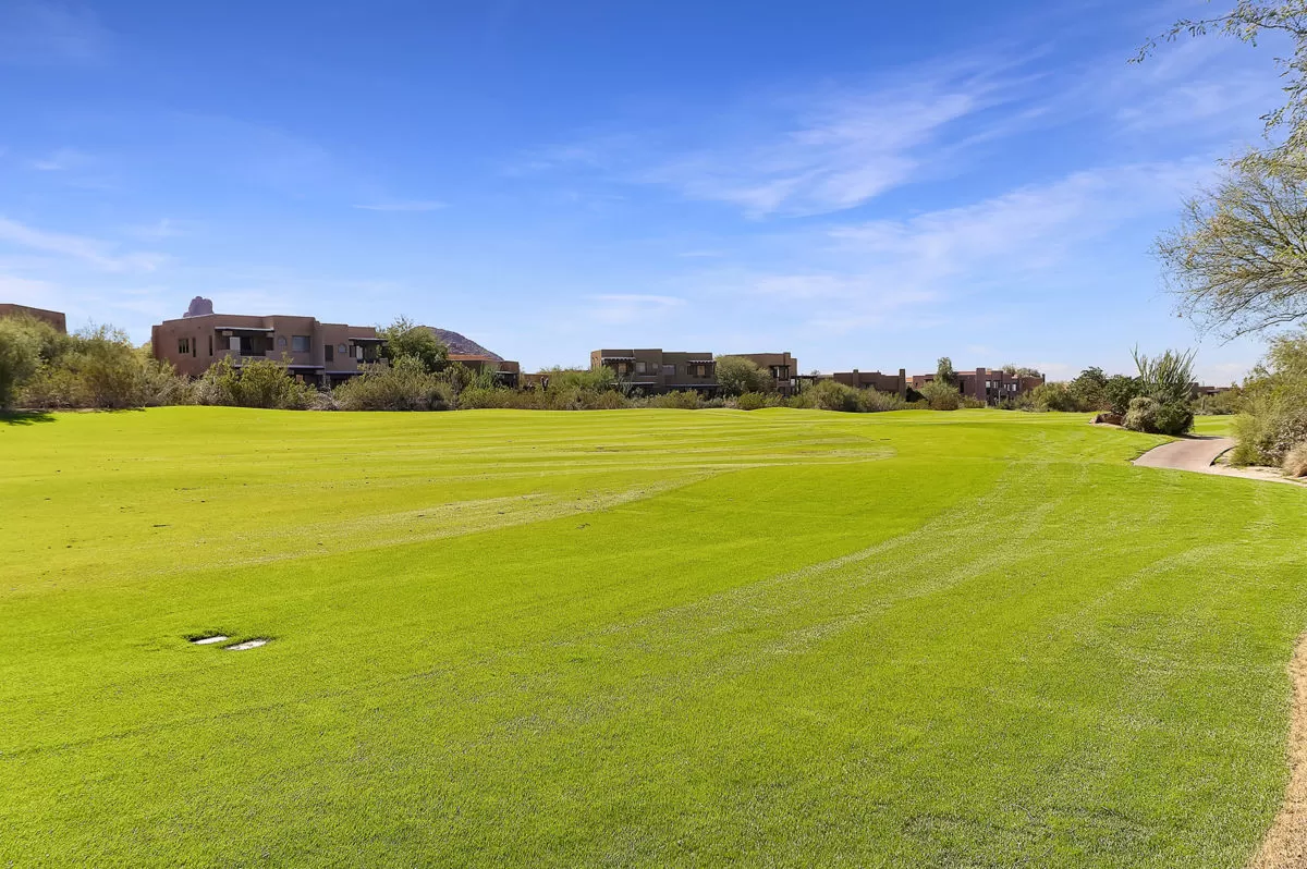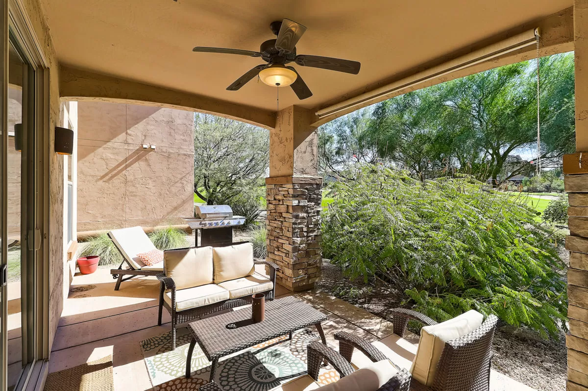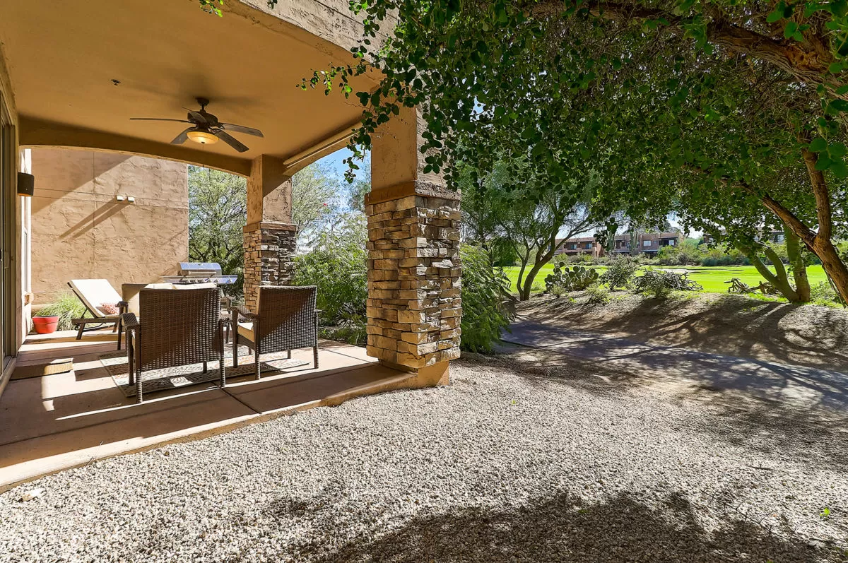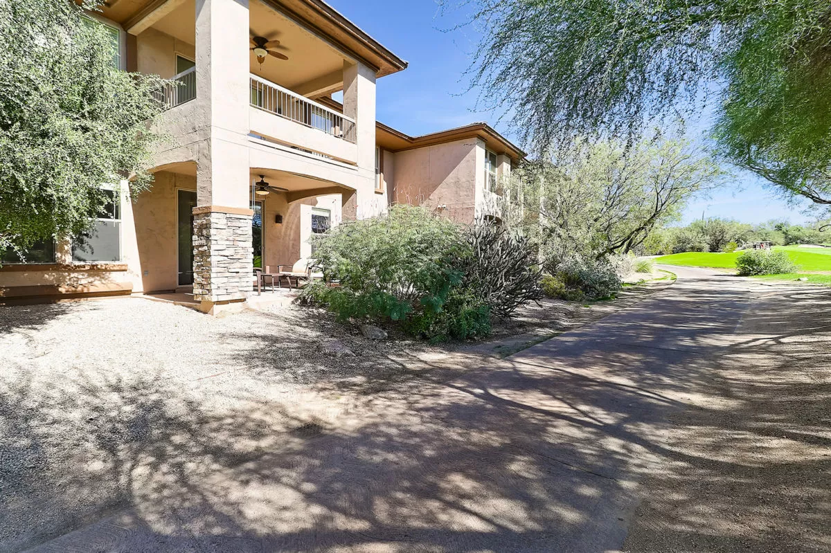 A South facing back patio great for entertaining has direct views of the golf course and Pinnacle Peak in the distance. The two-car side-by-side garage has direct entry into the spacious laundry with matching cabinetry and counters, laundry sink and full size washer and dryer and an extended driveway. Within walking distance to the community facilities including fitness room and community pool and spa as well as Troon North Golf Club, this move-in ready home is perfect for full time residents or a lock and leave.