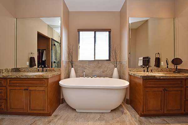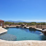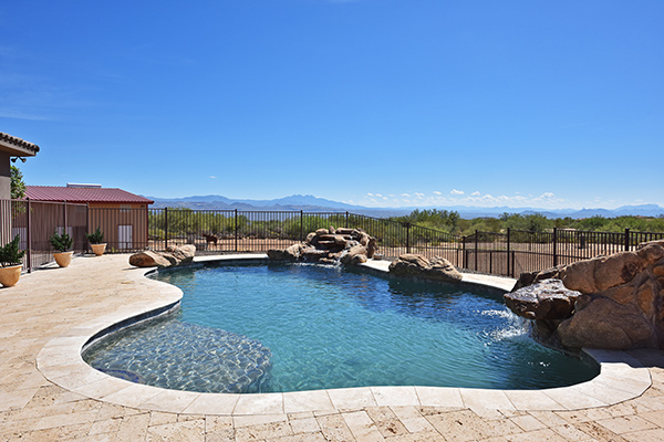A fenced backyard with tumbled-travertine hardscape, multiple lounge and patio spaces, and a saltwater pool with two rock water features highlight the picturesque views.