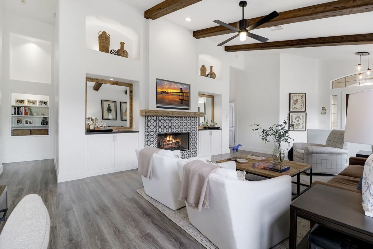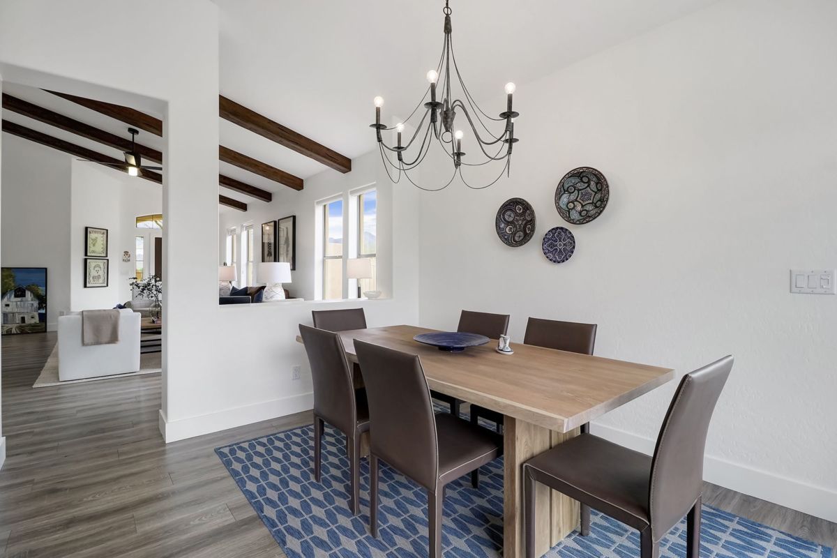 Upon entering the family room note the crisp white walls, beamed ceiling accents, easy care flooring, art niches and built in’s, all centered around the fireplace with decorative accent tile and wood mantle. The kitchen is open to the dining room and overlooks the family room for an open feel to this single level floor plan. A stainless steel appliance package, center island with seating, walk-in pantry, and granite counters round out the well laid out kitchen.