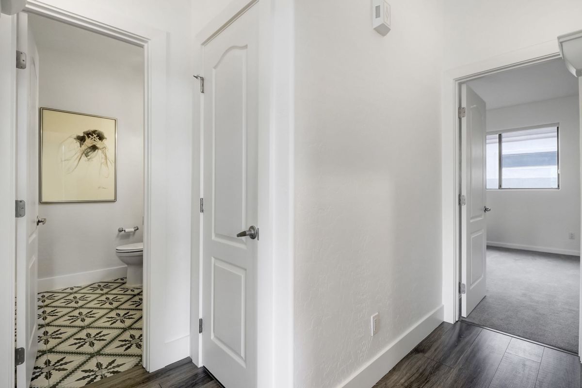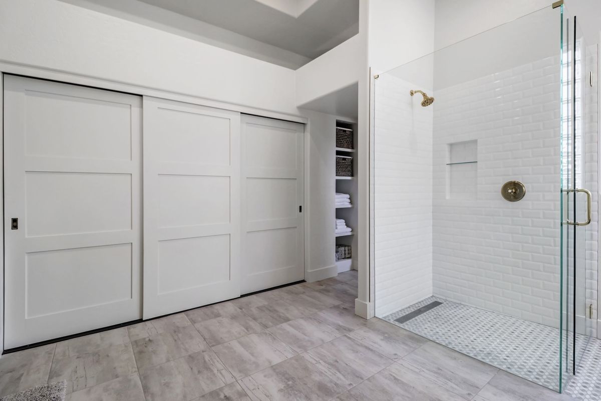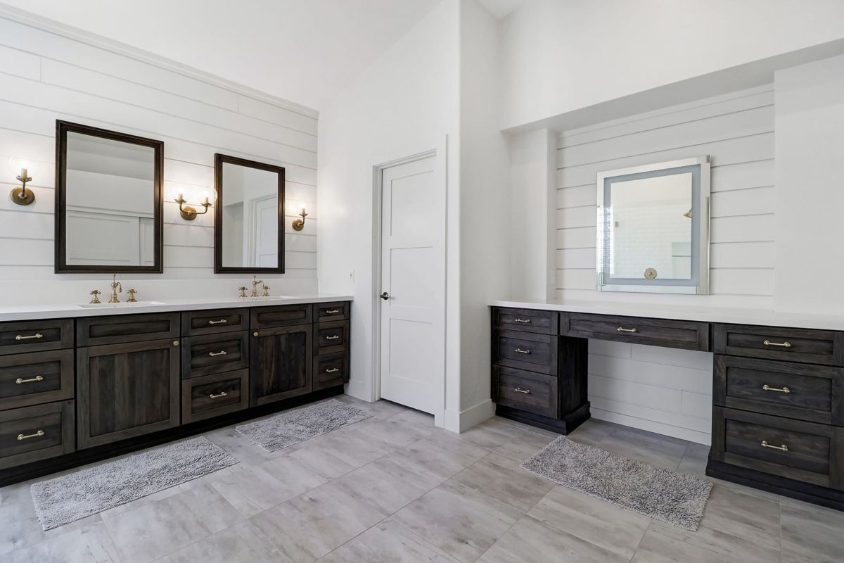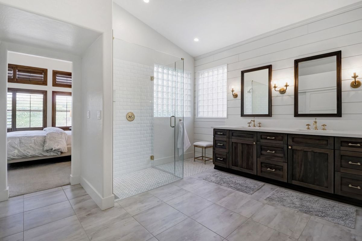The master suite features a complete 2018 remodel of the bathroom with shiplap walls, zero-grade frameless glass shower with white subway tile, custom dual sink cabinets and a separate custom vanity and large format tile floors. The backyard has an extended covered patio, refreshing pool with water feature, tumbled travertine hard scape, and beautiful Lady Banks roses helping create a private backyard setting.