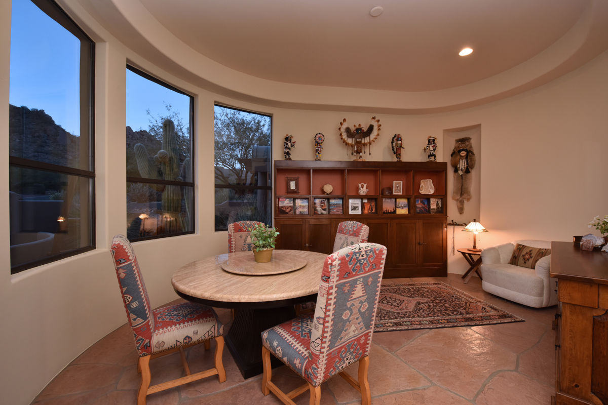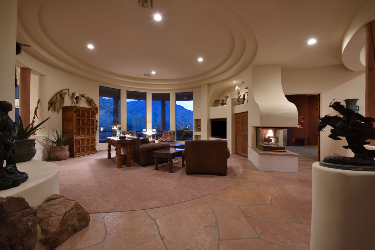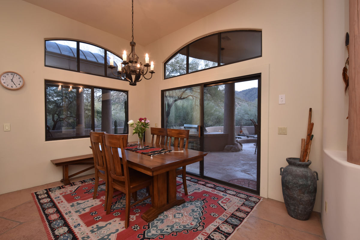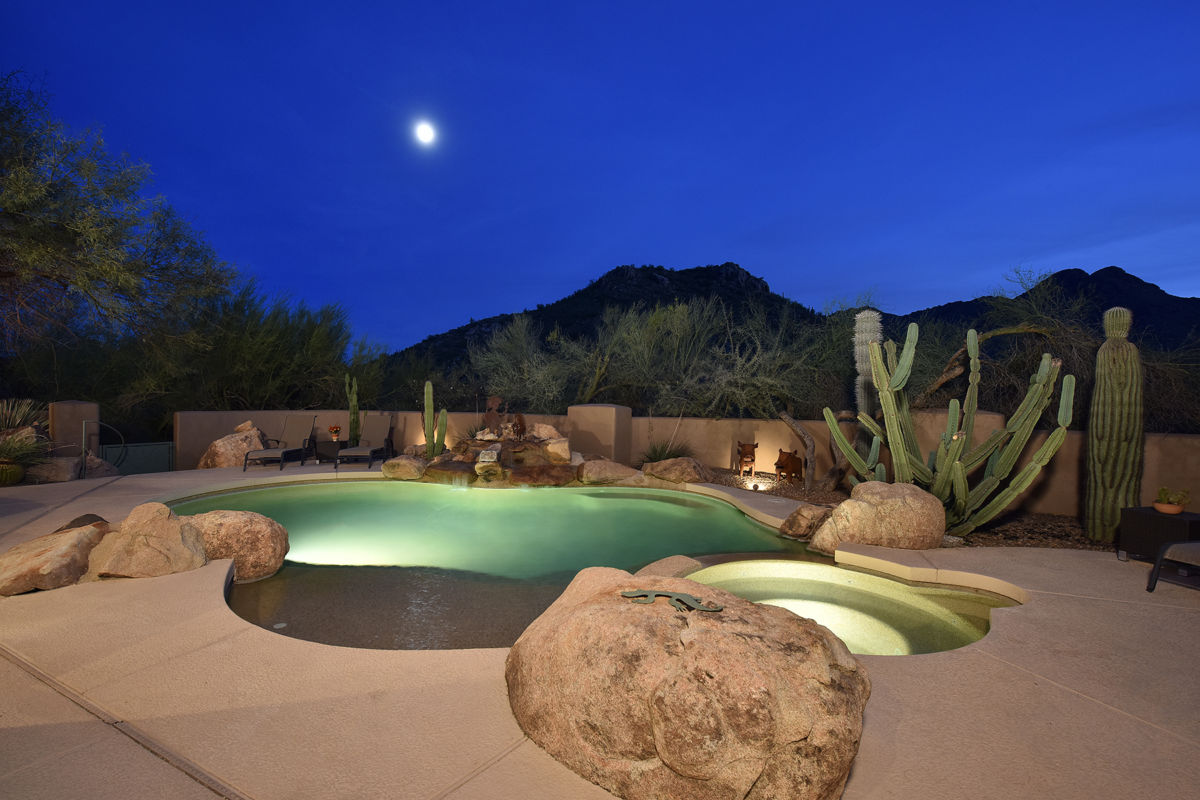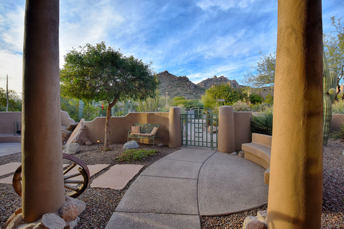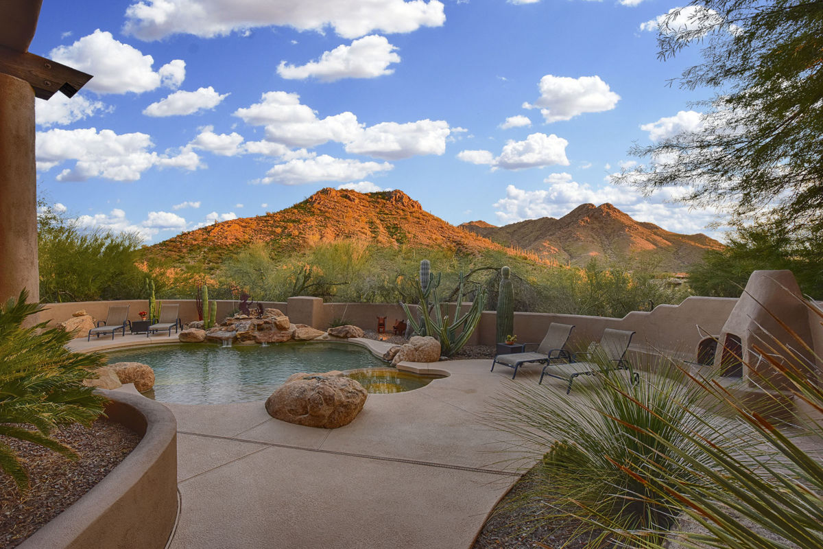 Tucked away in the gated community of Troon Ridge Estates II, you will find this southwest inspired custom home perfectly cradled between Troon Mountain and the McDowell Mountain range. Enjoy the views from the gated front courtyard with fireplace and lounge area before being ushered in to the entry rotunda accented by vega beams, and art niches. From the backyard enjoy up close mountain views from the numerous lounge and covered patio areas, and relax in the pool with new heater and filter and new wifi controls, all surrounded by mature landscaping.