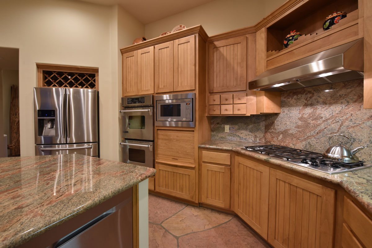 The master suite is split from the guest bedrooms with front and rear patio access, dual vanities, soaking tub with views, separate walk in shower, and a walk-in closet and dressing room. The nicely appointed kitchen has access to the attached breakfast area and formal dining room, with upgraded refrigerator, microwave and dishwasher, gas stove, large island, granite counters, and built in desk area.