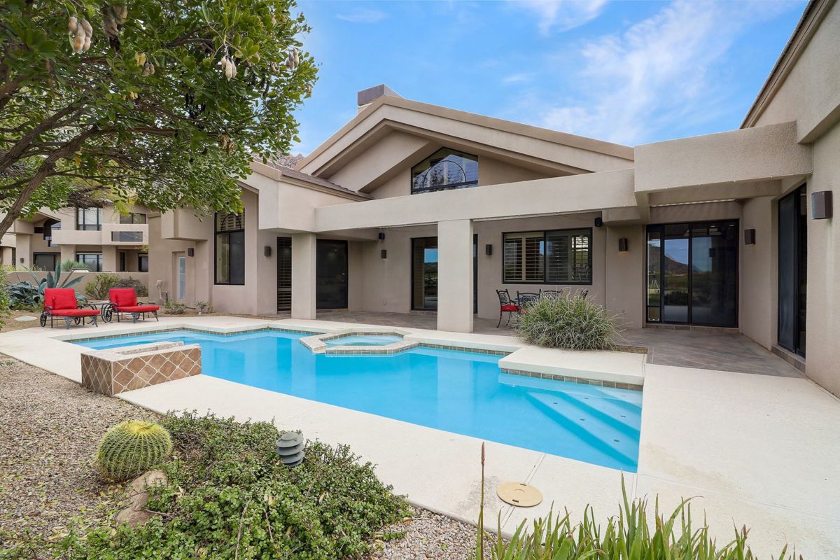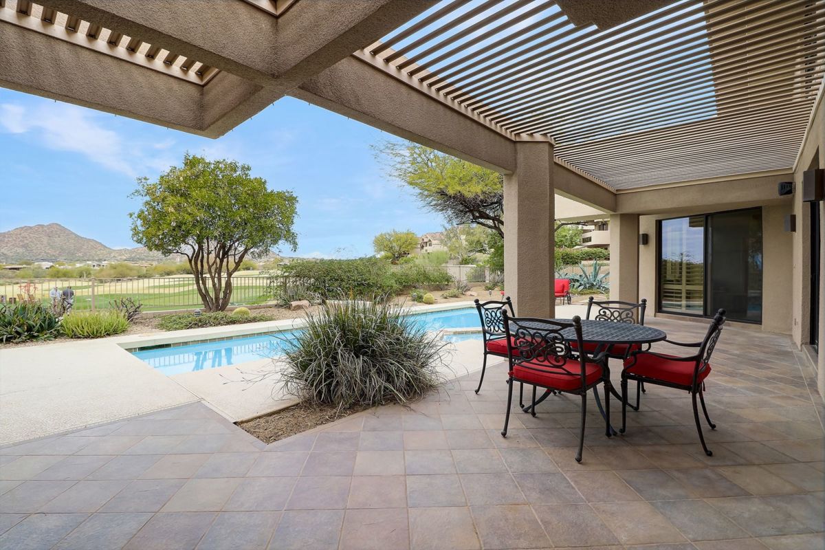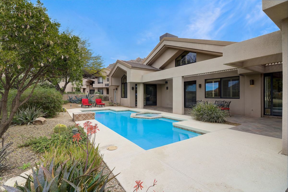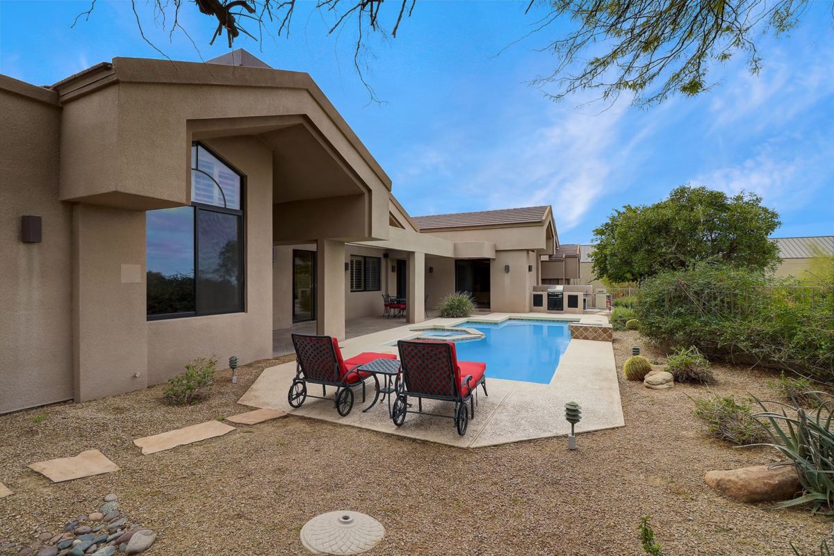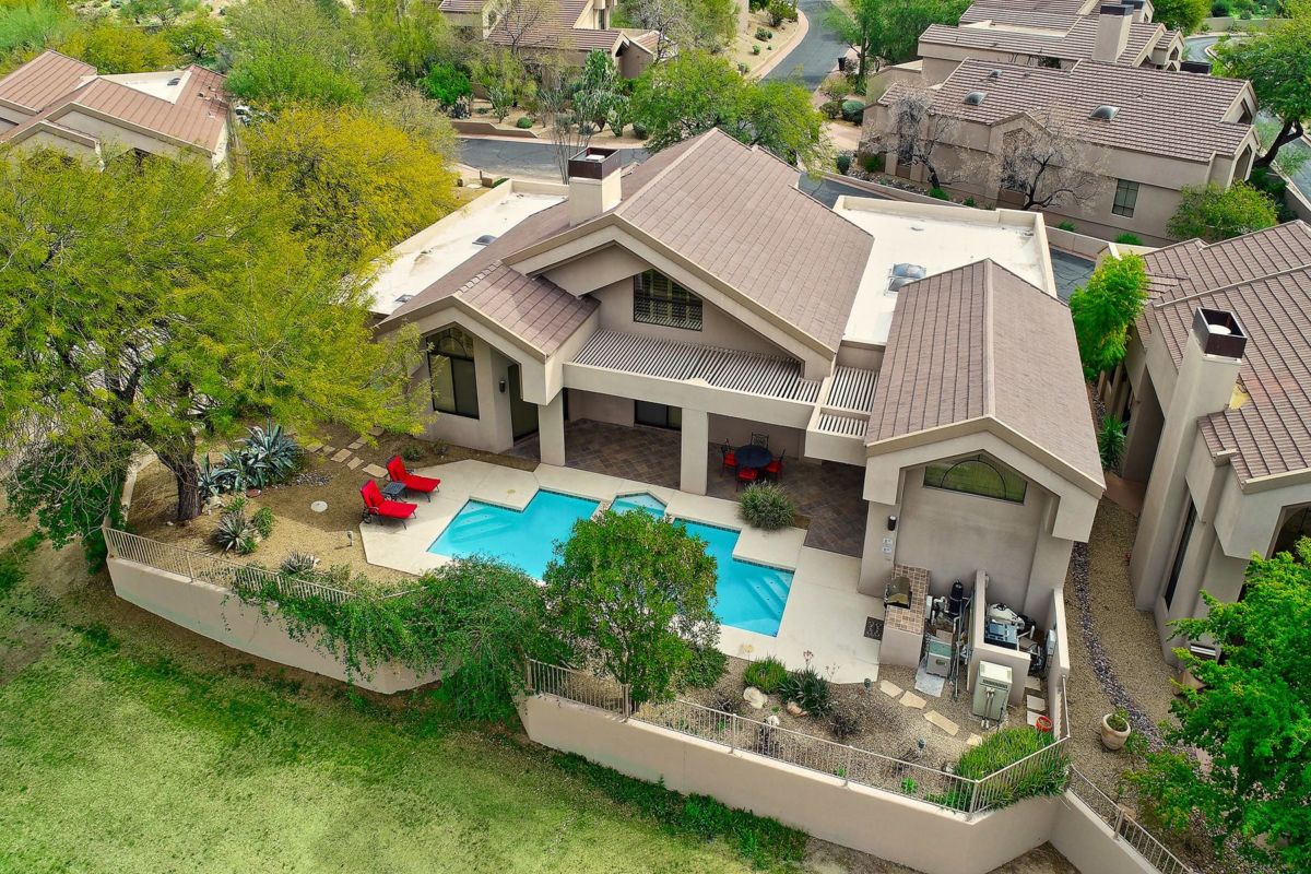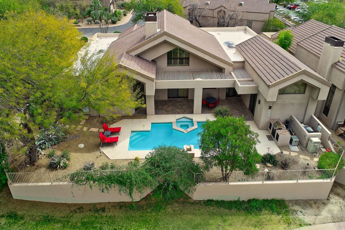 The backyard borders the Troon Country Club golf course and driving range and is nicely appointed with a pool and spa, large covered patio, and built-in barbecue. Two master baths, one with pool access, and two large master closets define the master suite for a true his-and-hers experience. The office/den is a great flex space with views of Troon Mountain.