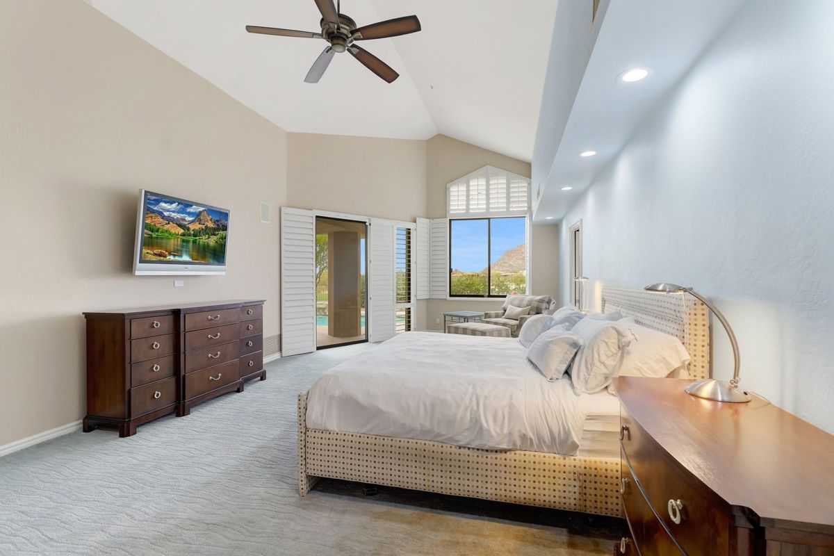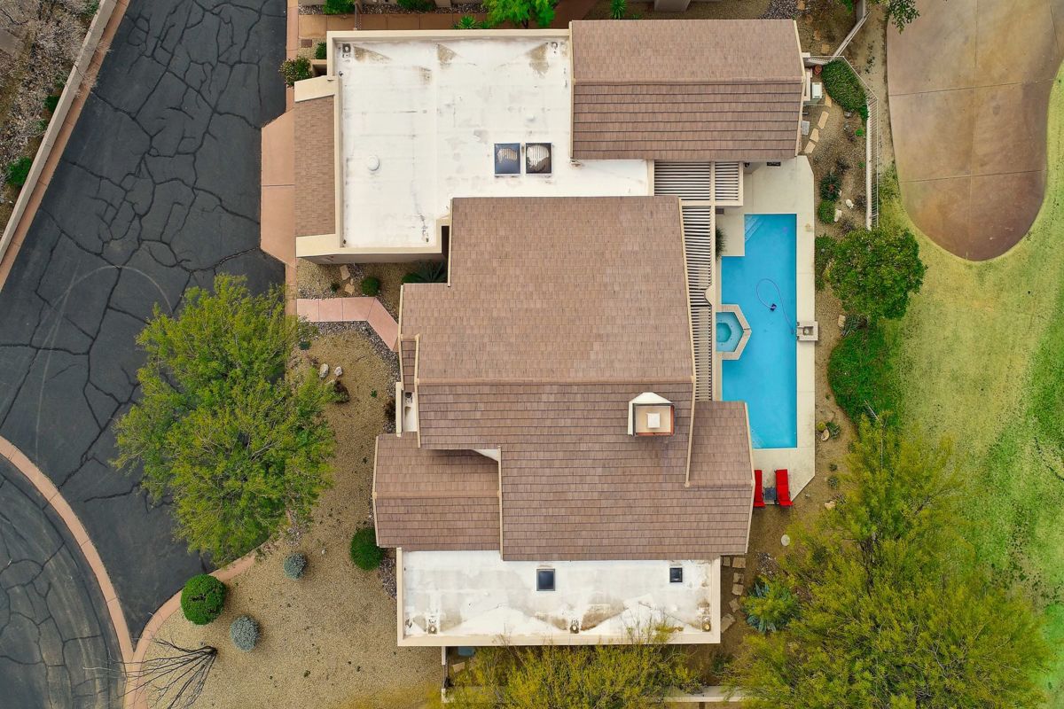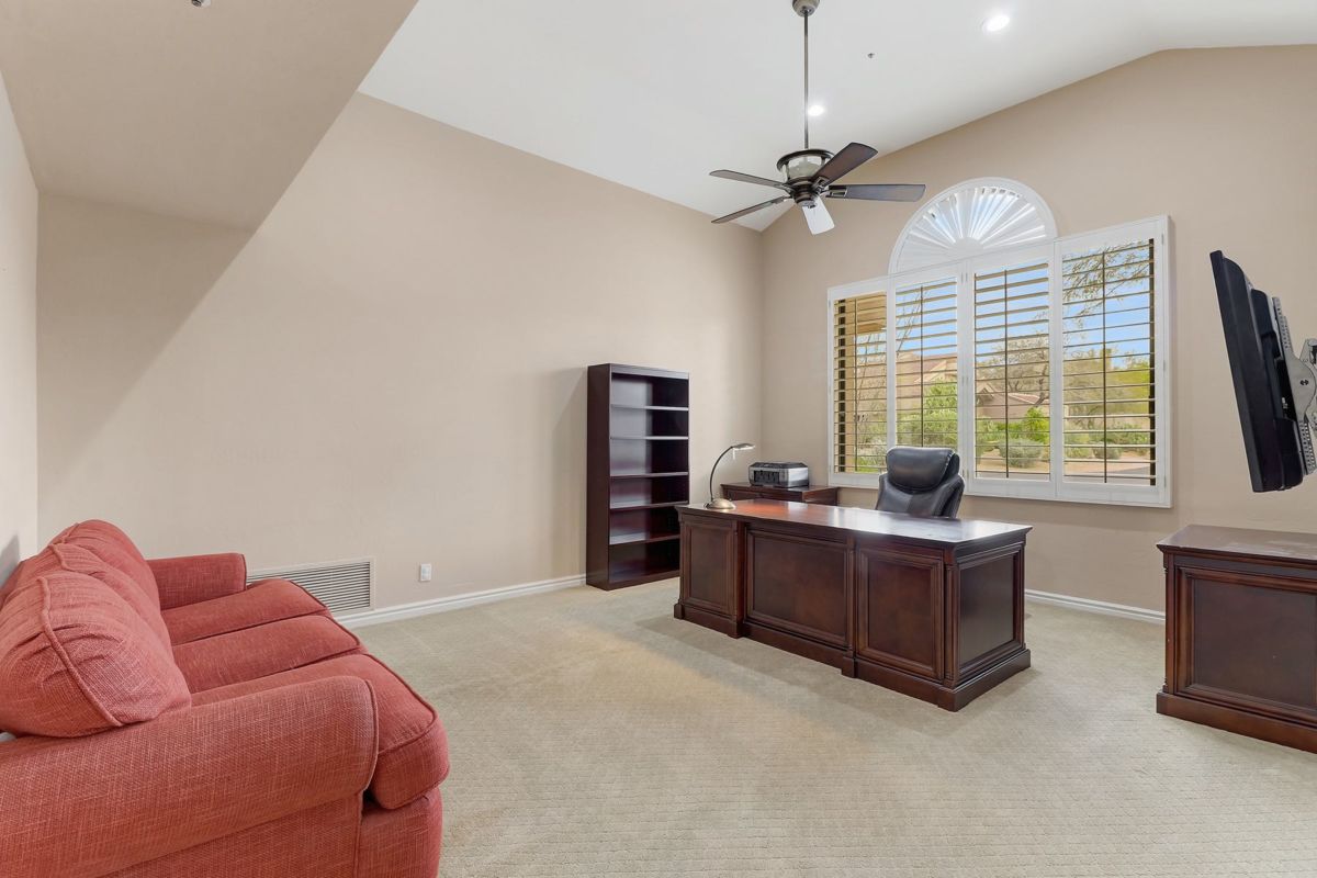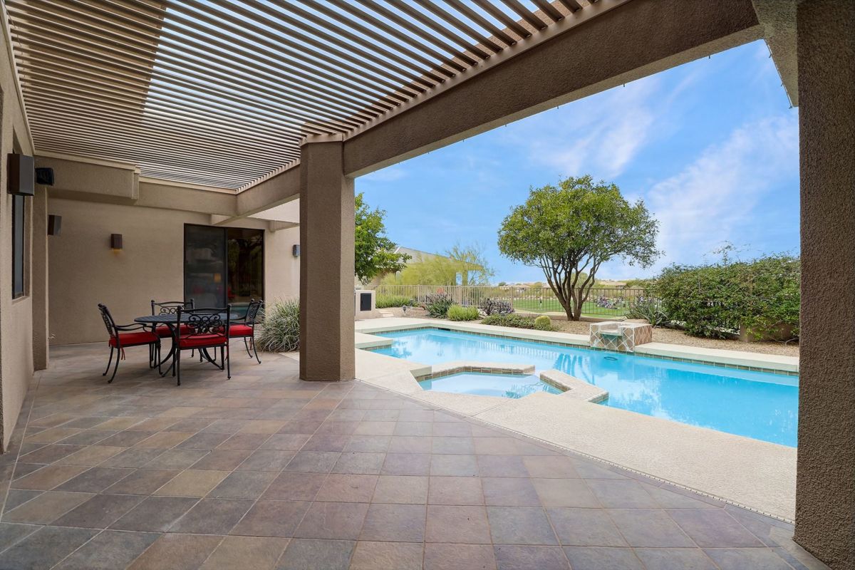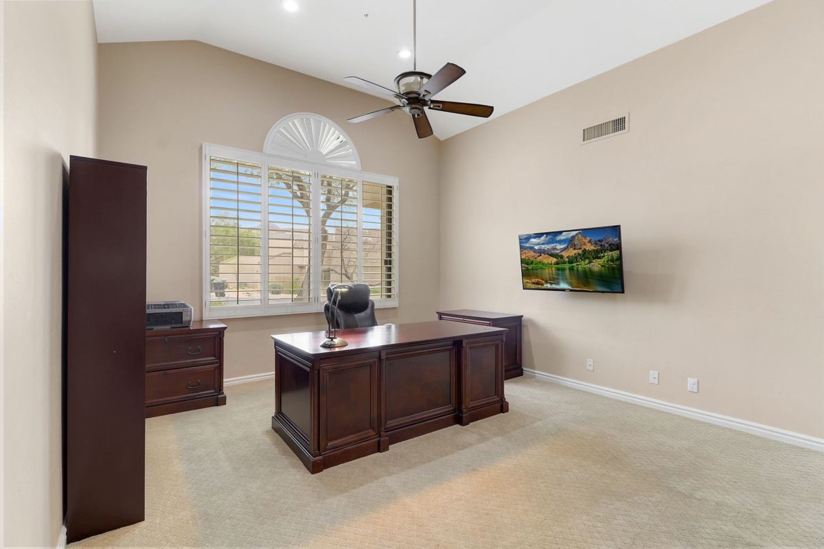 The backyard borders the Troon Country Club golf course and driving range and is nicely appointed with a pool and spa, large covered patio, and built-in barbecue. Two master baths, one with pool access, and two large master closets define the master suite for a true his-and-hers experience. The office/den is a great flex space with views of Troon Mountain.