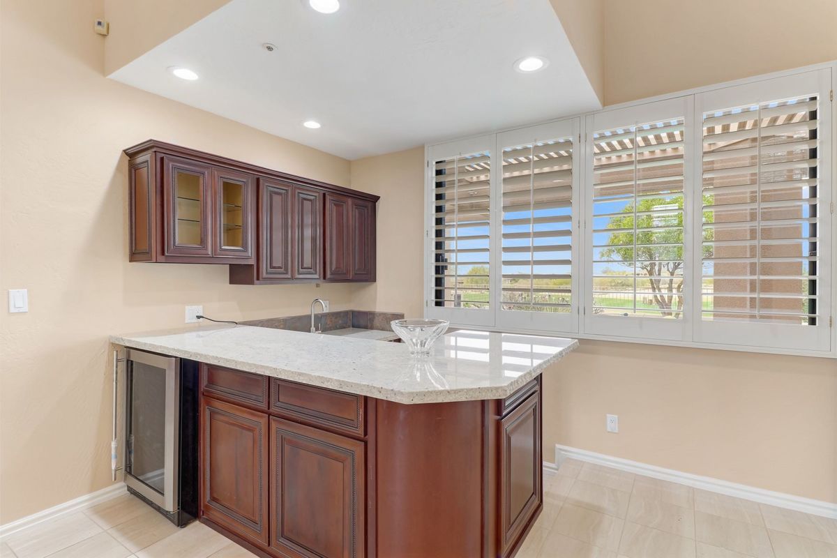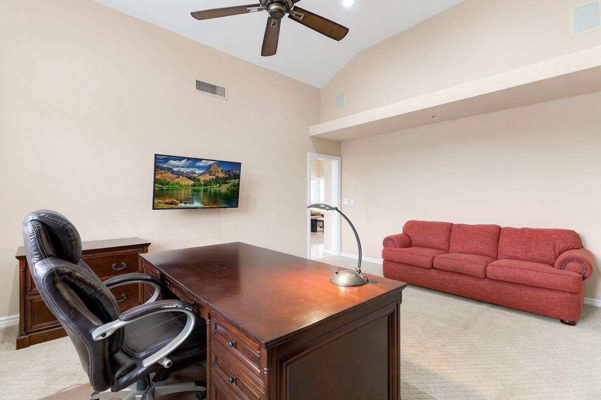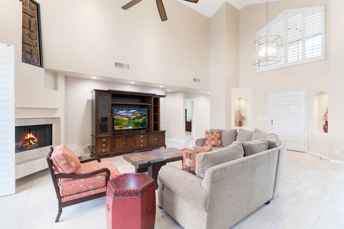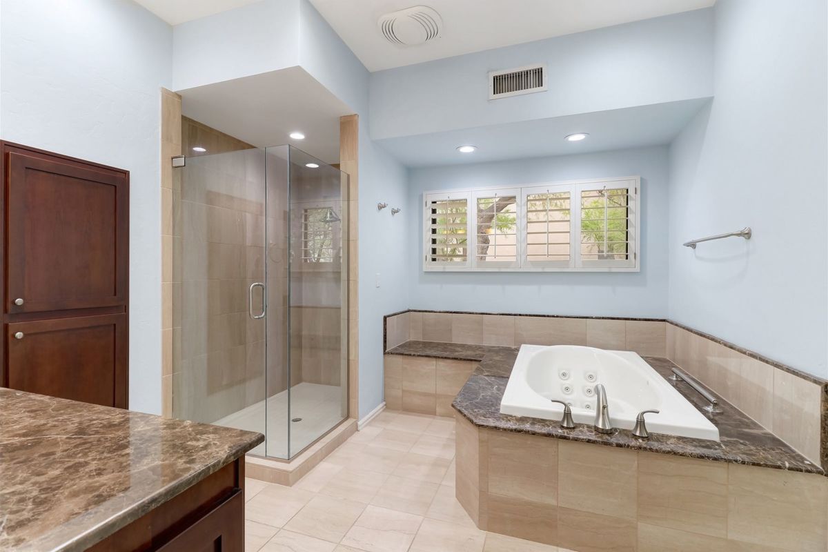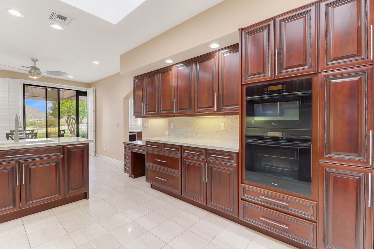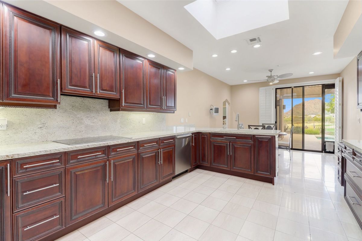The backyard borders the Troon Country Club golf course and driving range and is nicely appointed with a pool and spa, large covered patio, and built-in barbecue. Two master baths, one with pool access, and two large master closets define the master suite for a true his-and-hers experience. The office/den is a great flex space with views of Troon Mountain.