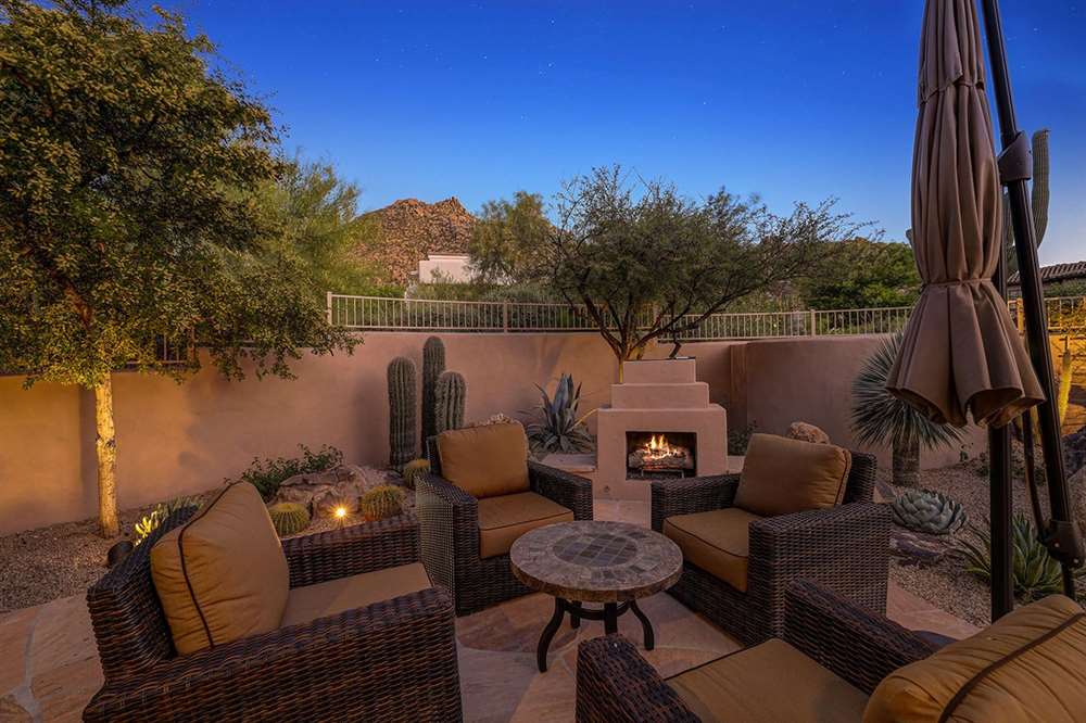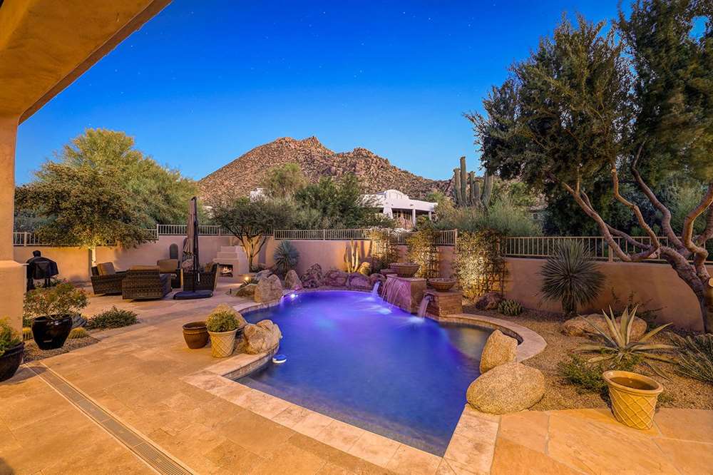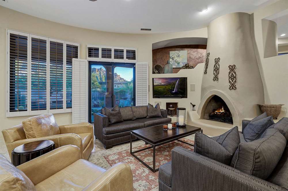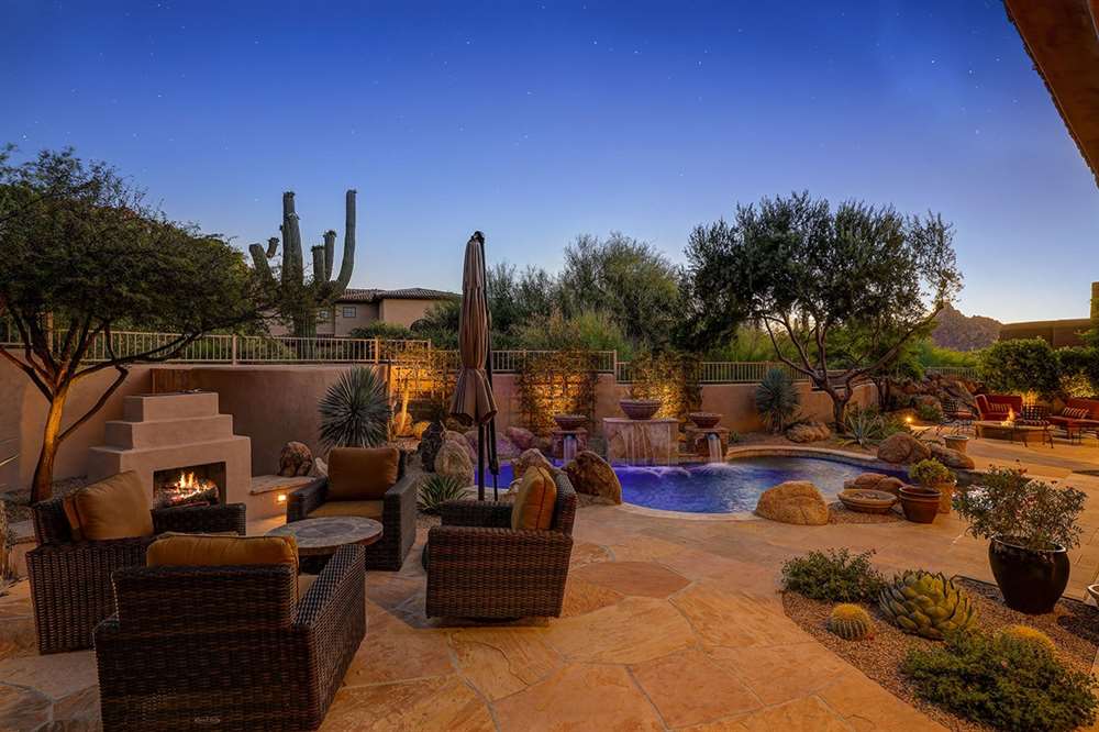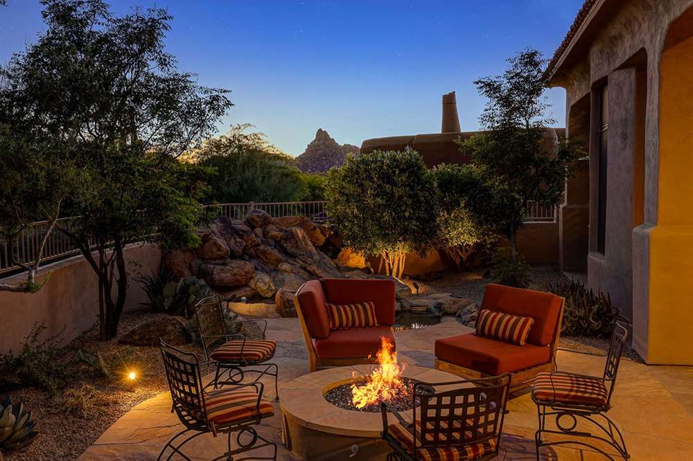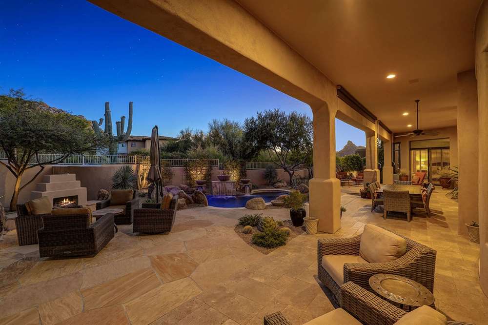 The remodeled backyard showcases new flagstone hardscape, new island with built-in barbecue and rotisserie, Green Egg (smoker) and granite top, new gas fire pit, new desert landscaping and new irrigation lines, large covered patio, fireplace, sparkling pool with water feature and Pinnacle Peak views! The interior continues to embrace the views throughout and the open kitchen/family room with dining area has a charming kiva fireplace and new windows and slider in the family room area.
