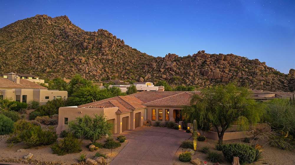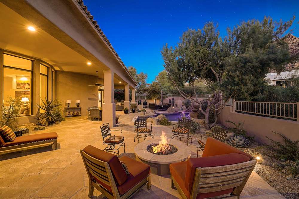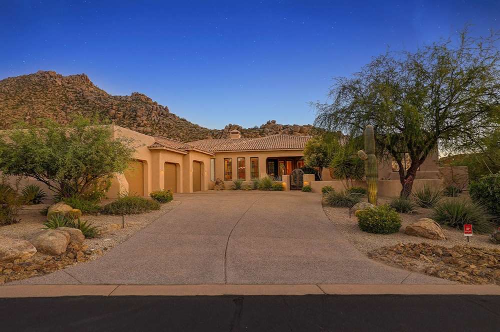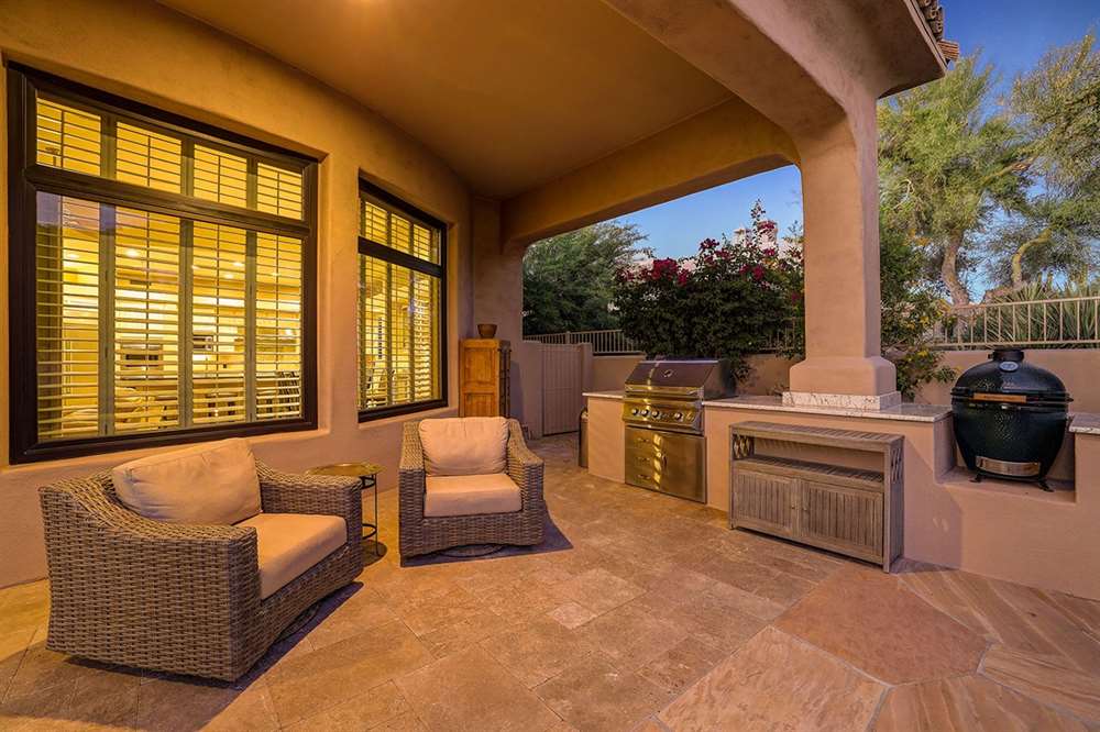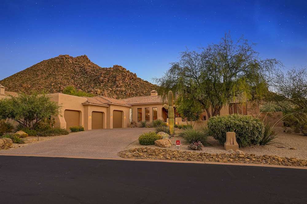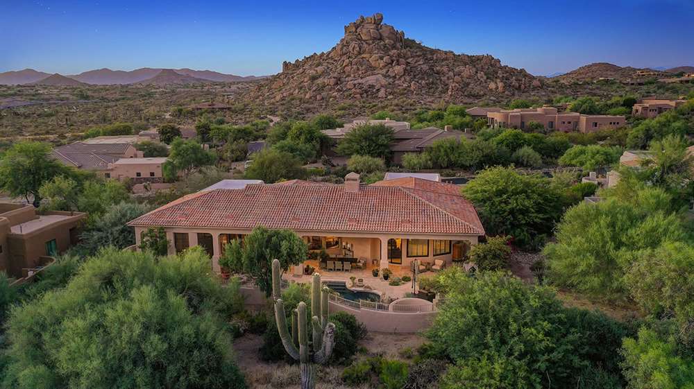 The remodeled backyard showcases new flagstone hardscape, new island with built-in barbecue and rotisserie, Green Egg (smoker) and granite top, new gas fire pit, new desert landscaping and new irrigation lines, large covered patio, fireplace, sparkling pool with water feature and Pinnacle Peak views! The interior continues to embrace the views throughout and the open kitchen/family room with dining area has a charming kiva fireplace and new windows and slider in the family room area.
