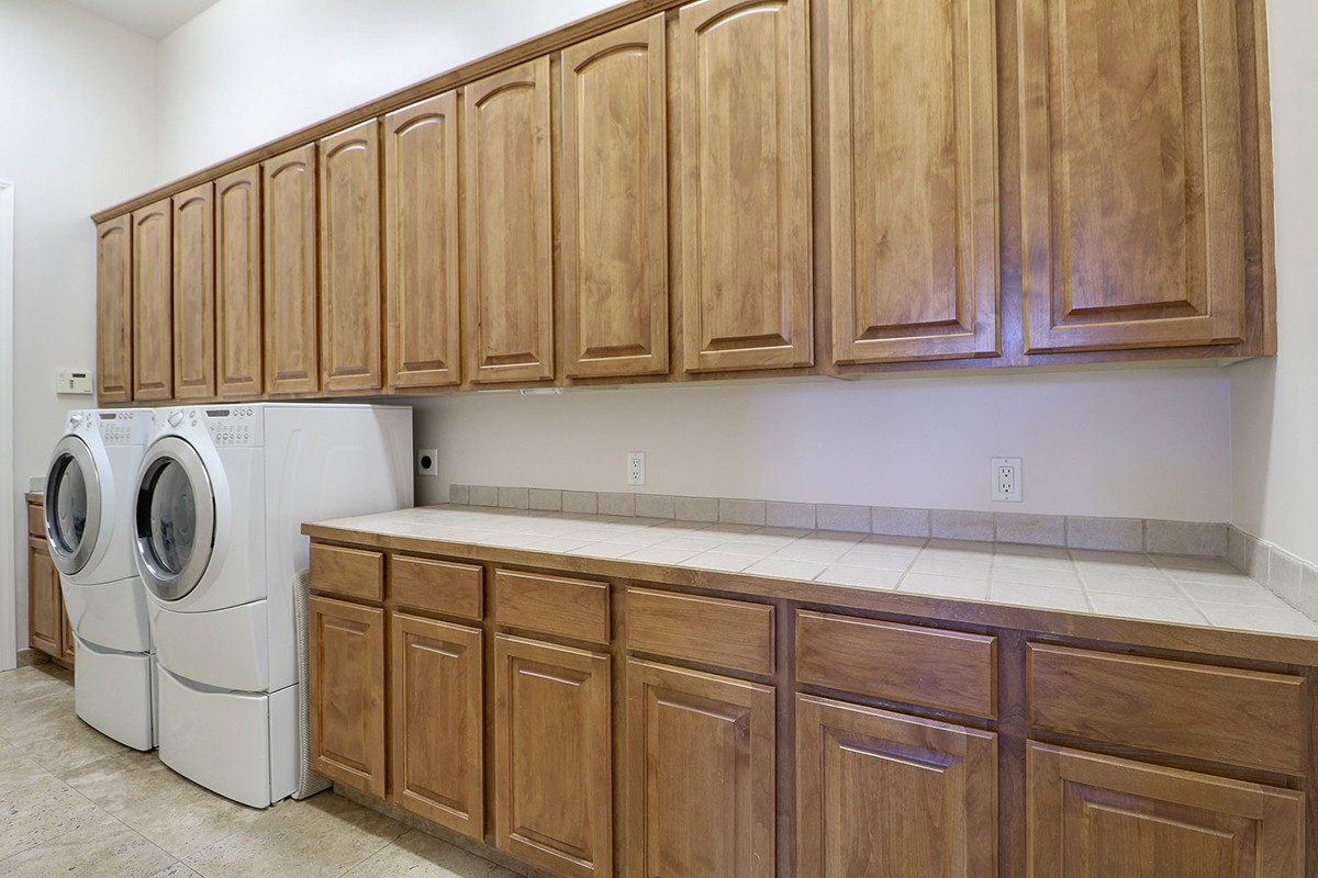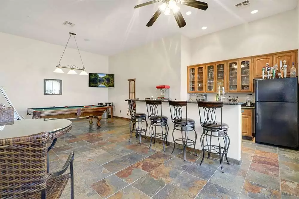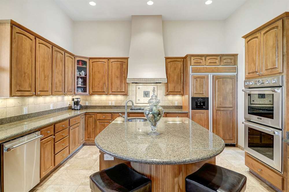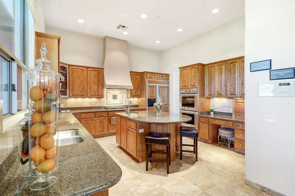 The interior has a formal entry and dining spaces with an open kitchen and family room. The master suite is on the same wing as the den/office and large bonus room with full bar and powder bath. The three guest suites are on the opposite wing and feature one private en-suite and two rooms sharing a jack and jill, all opening to the private play/bonus room.
