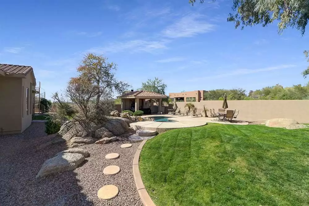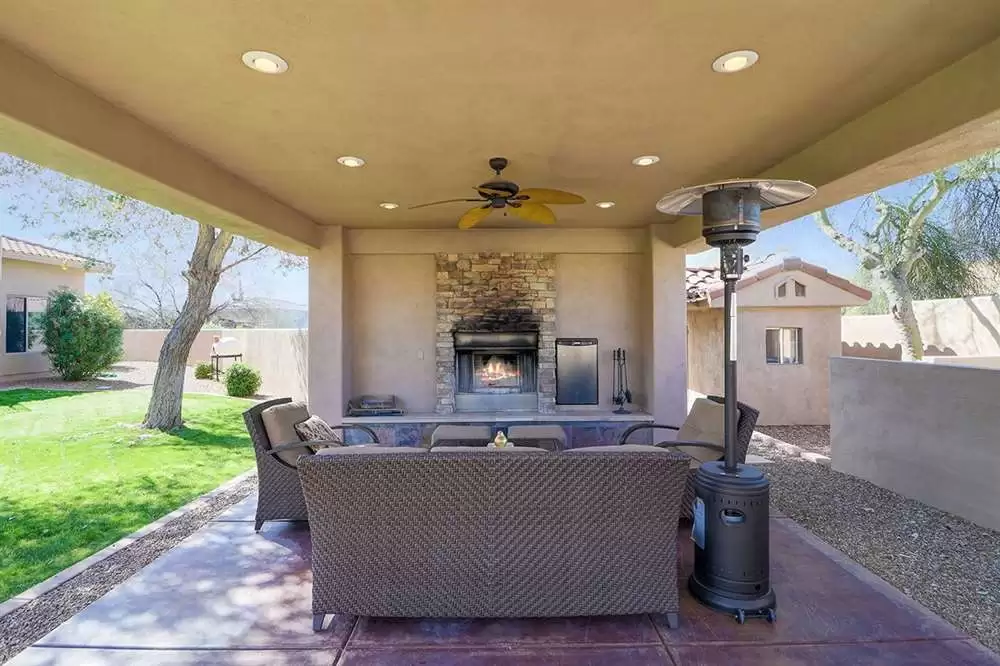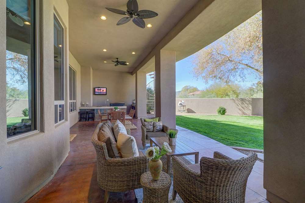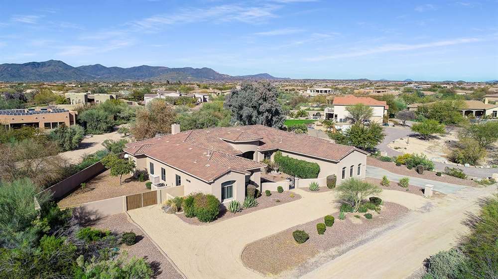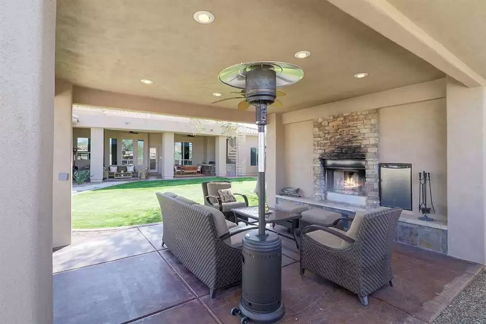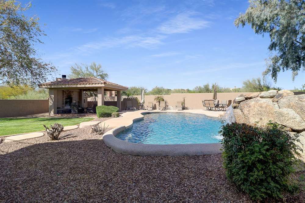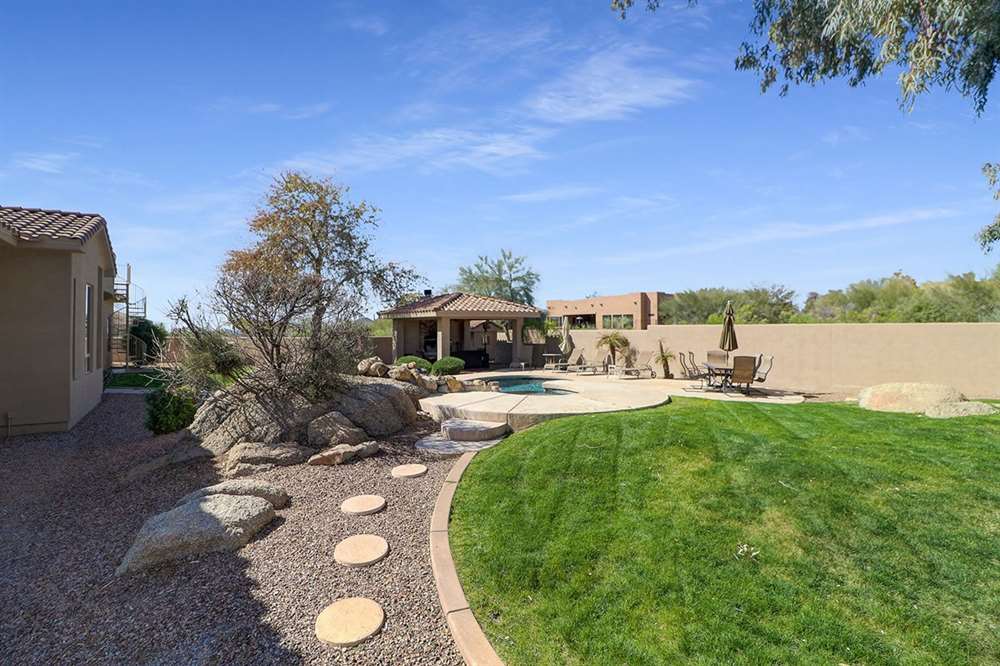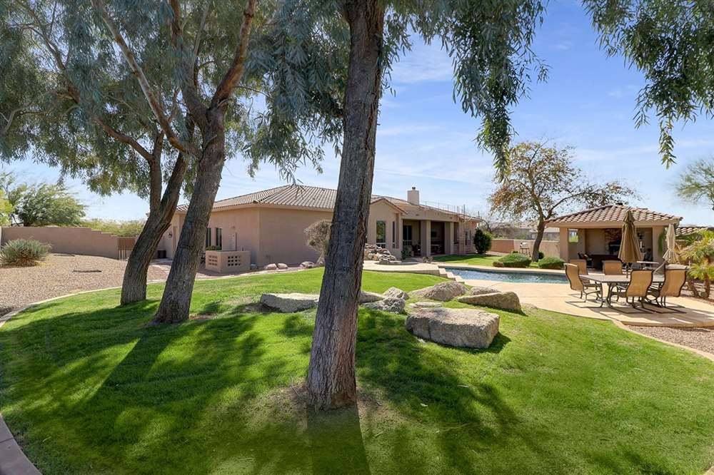 Spacious and private estate home in a non-HOA area allows for easy luxury living and generous outdoor spaces. The resort style backyard has a pool with boulder waterfall feature, covered gazebo with fireplace, large covered patio with built-in barbecue, mature trees including lemon, lime and orange, an irrigated garden area, real grass, view deck with 360-degree views and plenty of additional space for you to bring the toys and imagination!