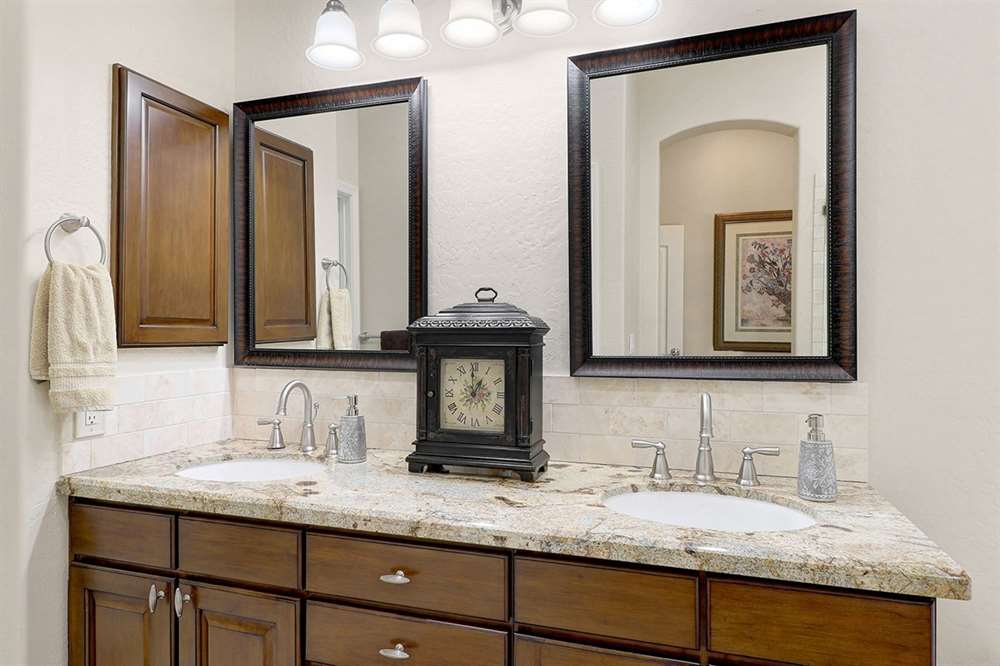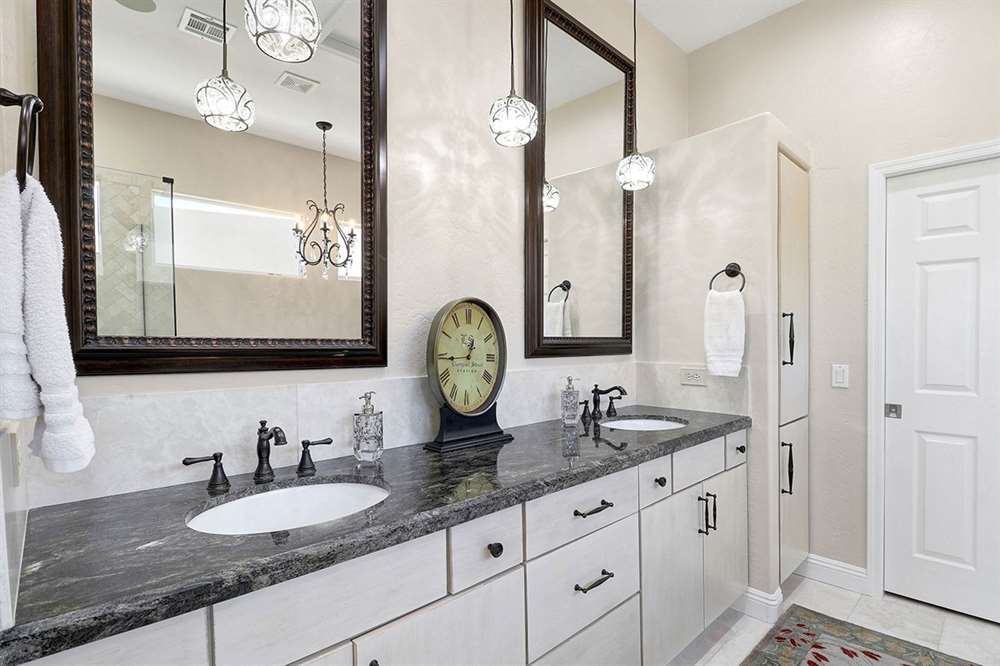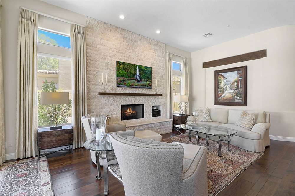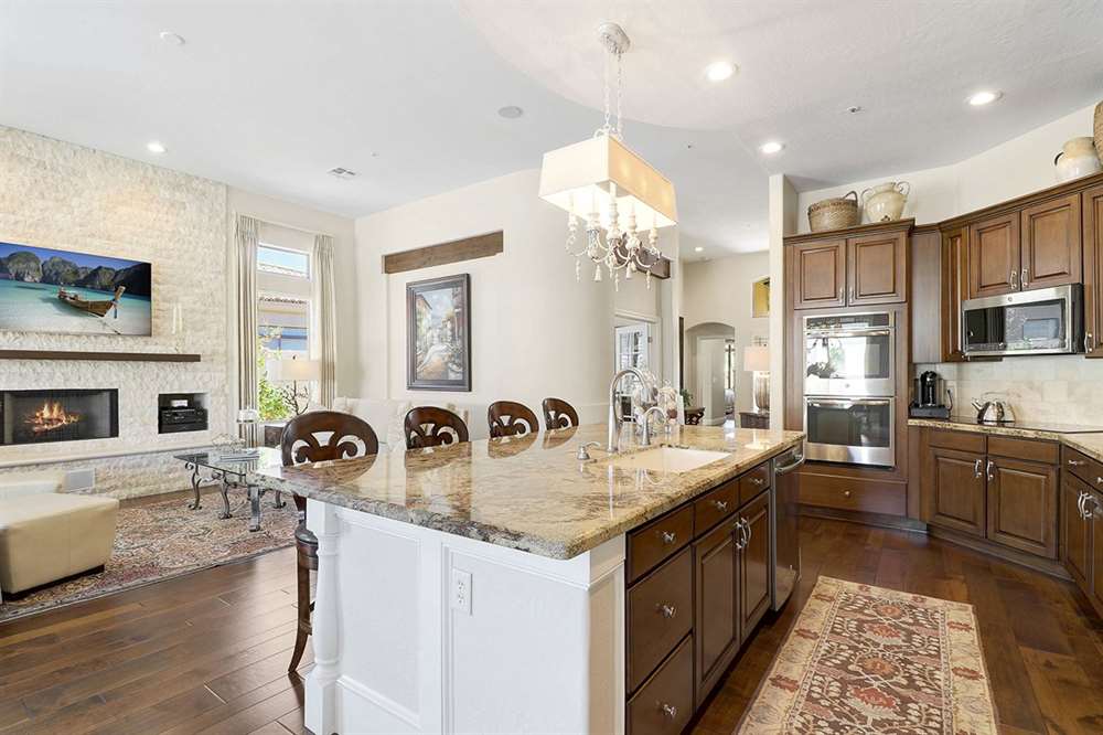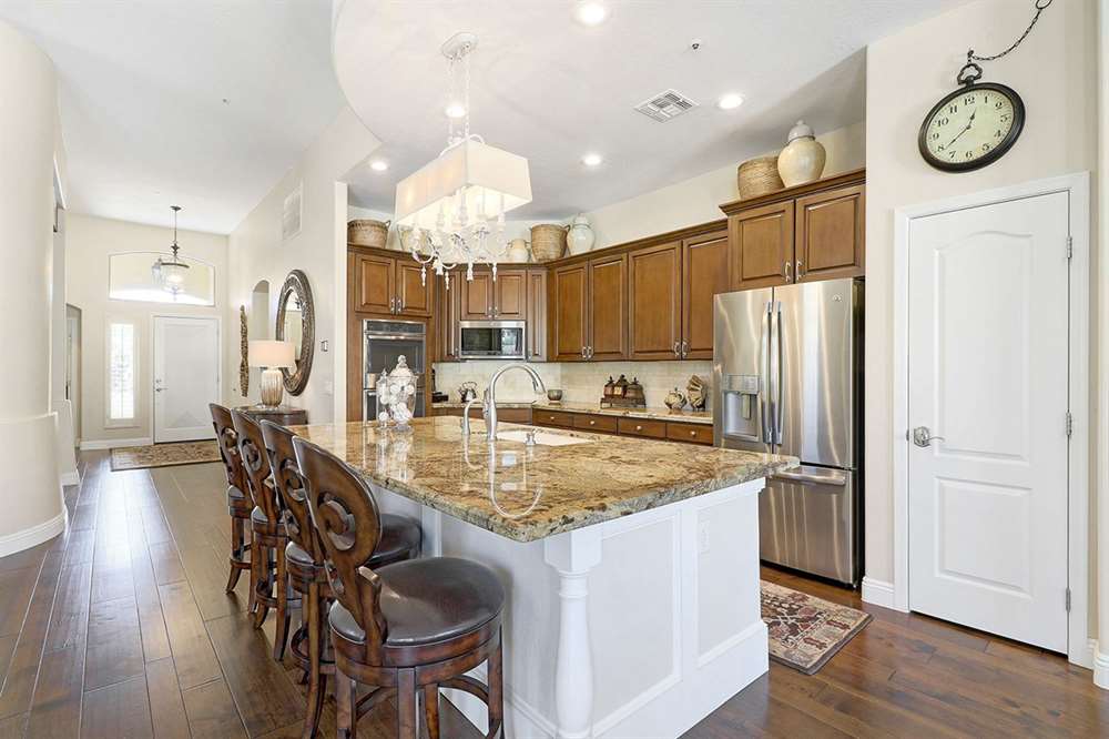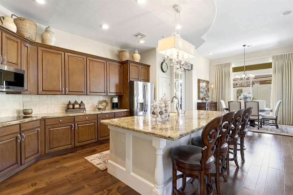 The great room has a stacked stone accent wall with fireplace and wood mantle, recessed dining room overlooking the rear yard and a chef’s kitchen with beautiful amenities. The kitchen has a stainless steel appliance package, induction cooktop, two wall ovens, granite counters, built-in microwave, large center island, refinished cabinets, private pantry, and custom light fixture.
