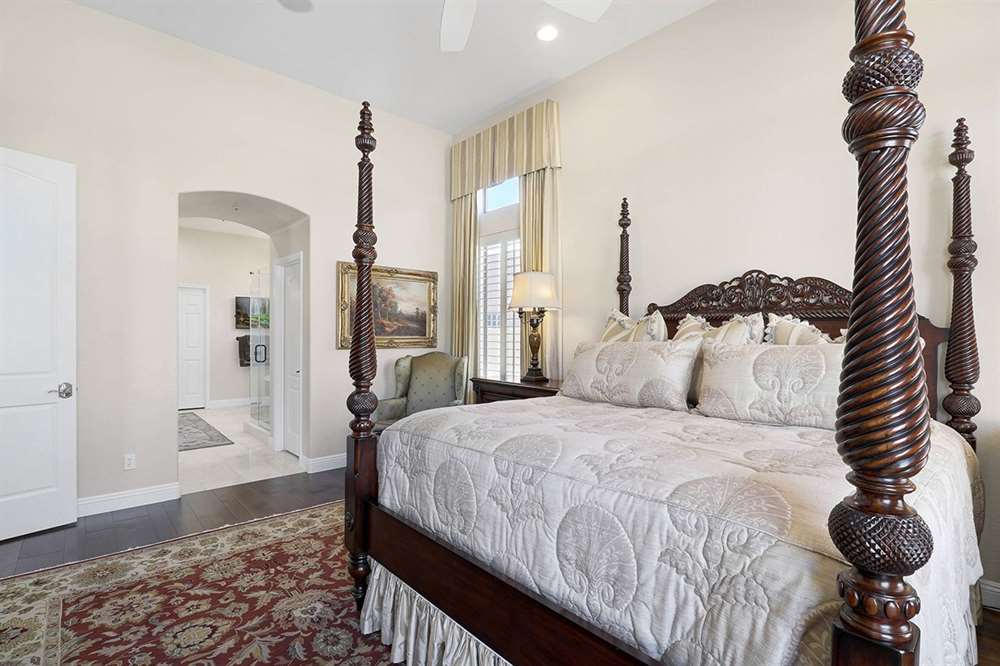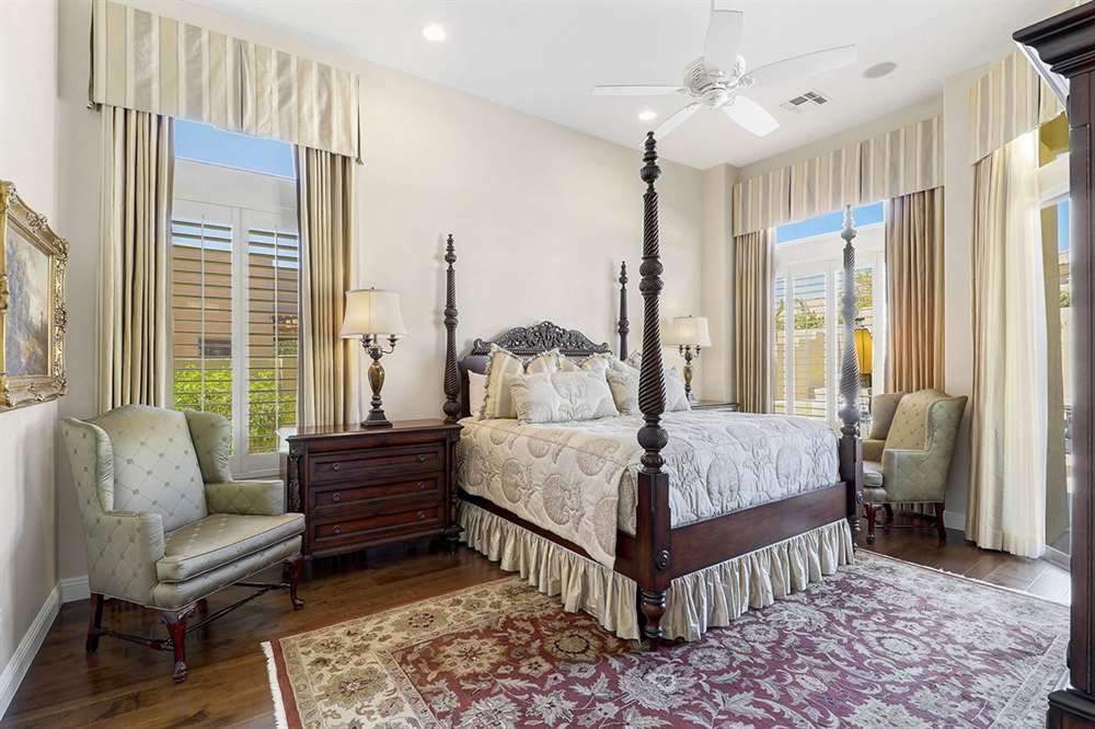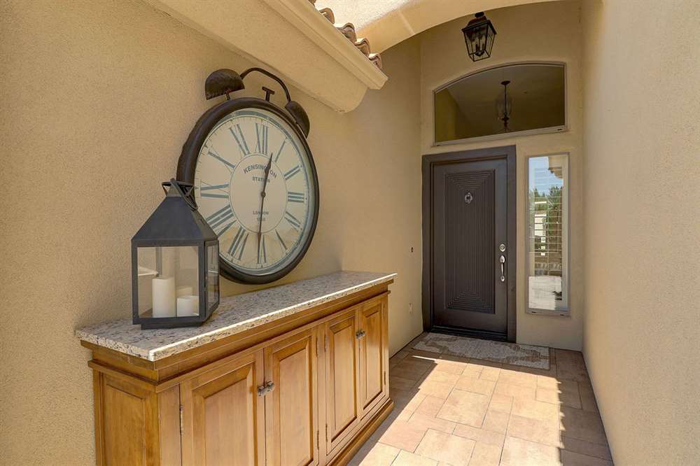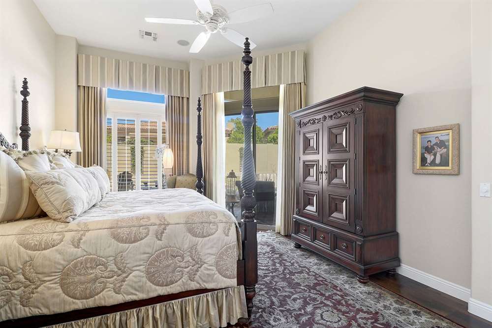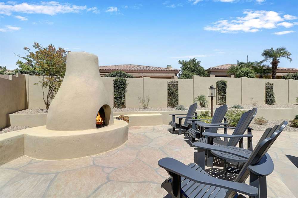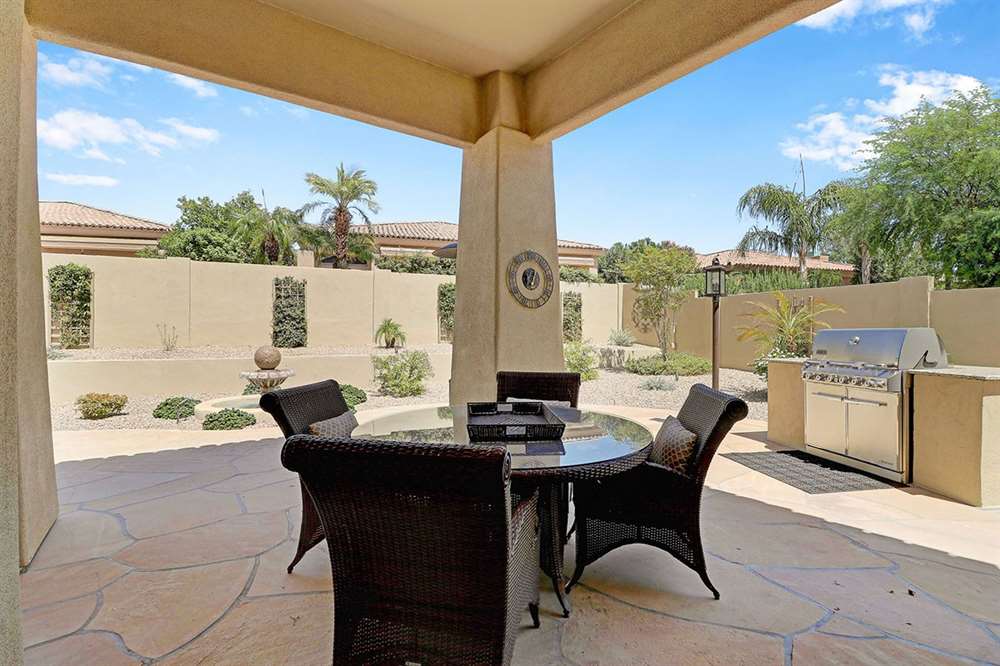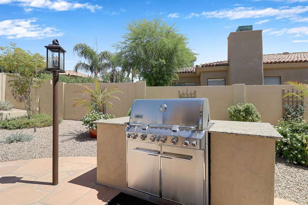 The master suite has a large closet, clerestory windows, travertine floors and shower surround, free-standing tub, accent hardware, and dual dual sinks. The easy care backyard has a kiva fireplace, water feature, covered patio, built-in barbecue, raised planter, natural stone hardscape, and low maintenance landscaping.