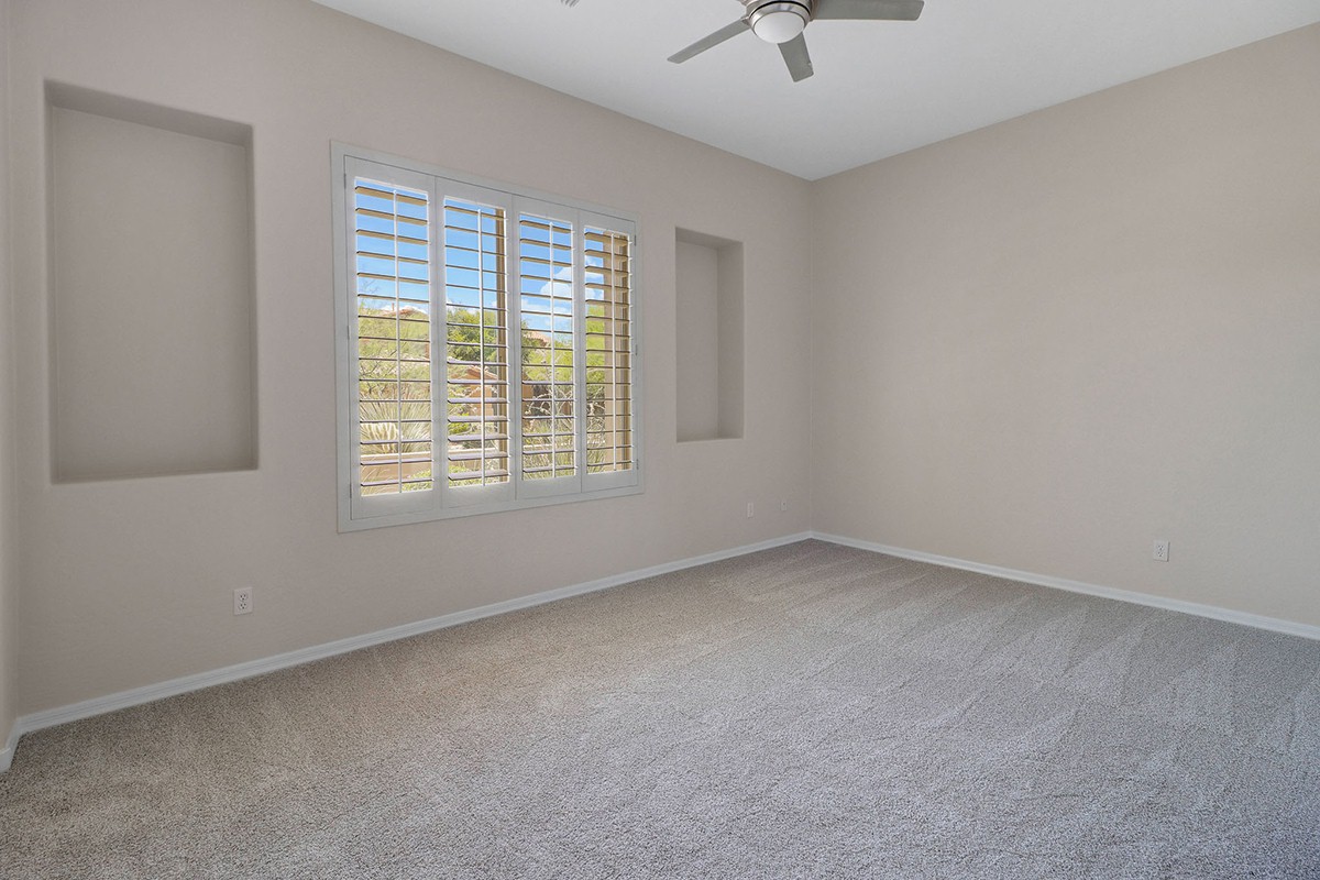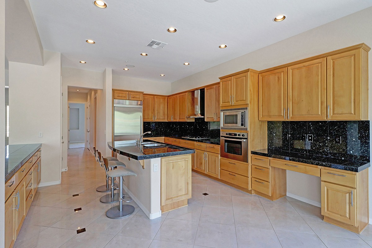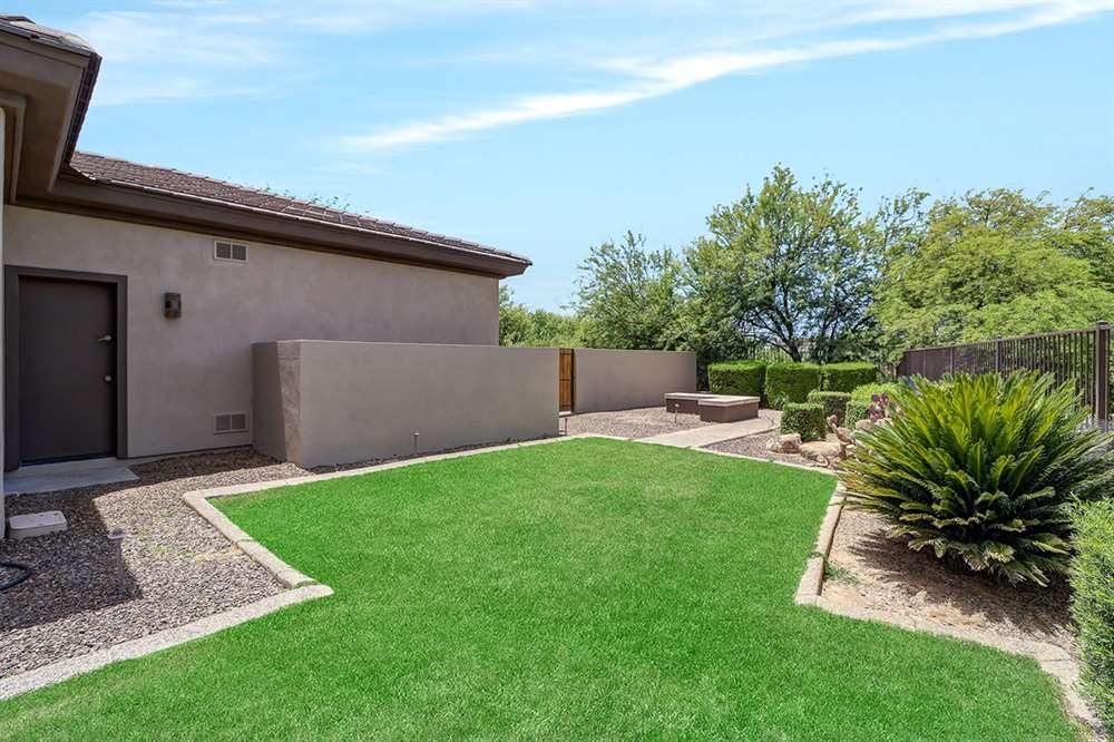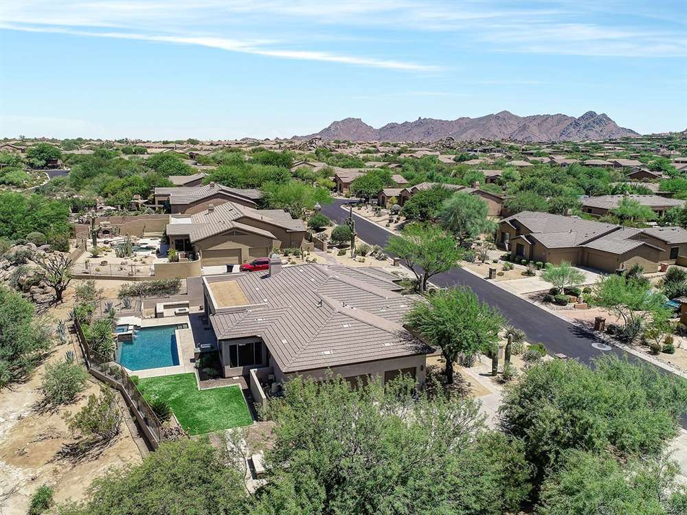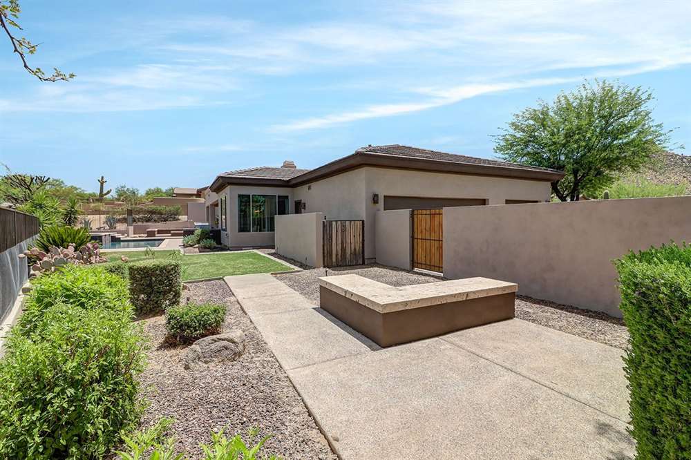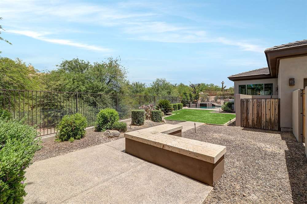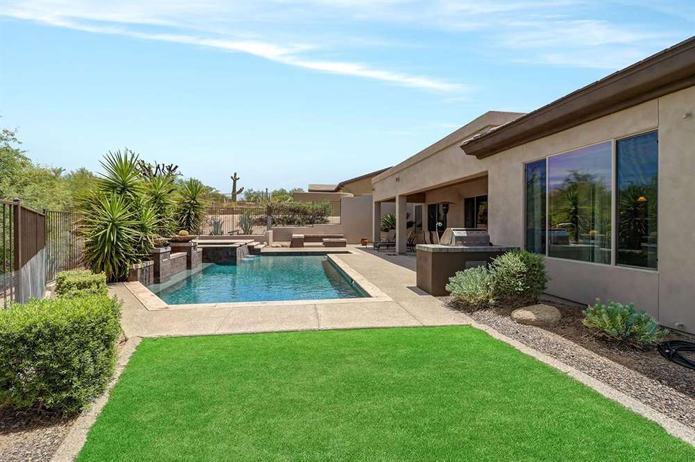 The private backyard backs to a beautiful desert arroyo and features an elevated spa cascading into the Pebble-Tec pool below, a built-in fire-pit with seating, large covered patio, built-in barbecue, grassy play area and mature landscaping throughout. With just over 2,700 square feet, this perfectly sized home has three bedrooms and three full baths, and a bonus room/flex space.