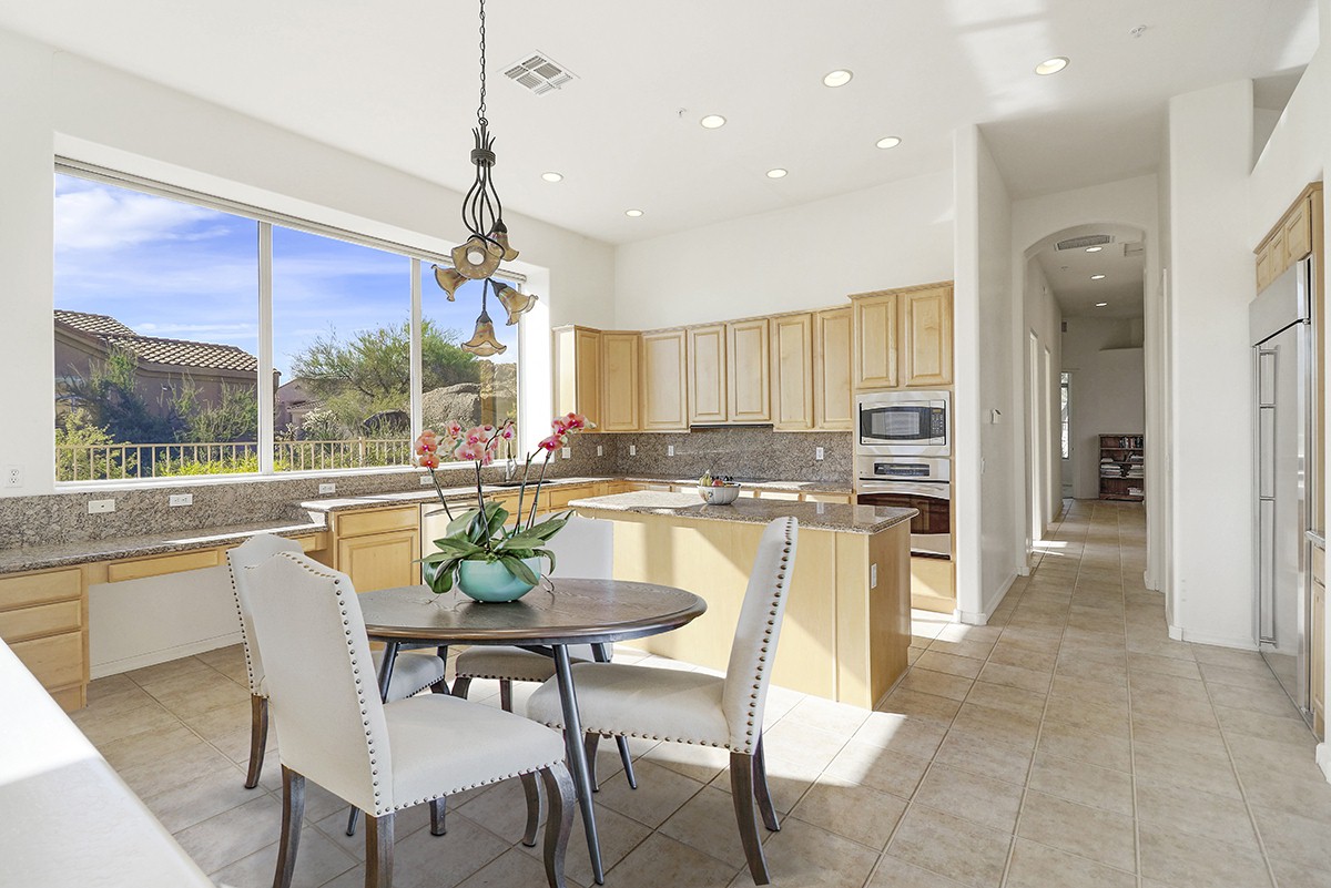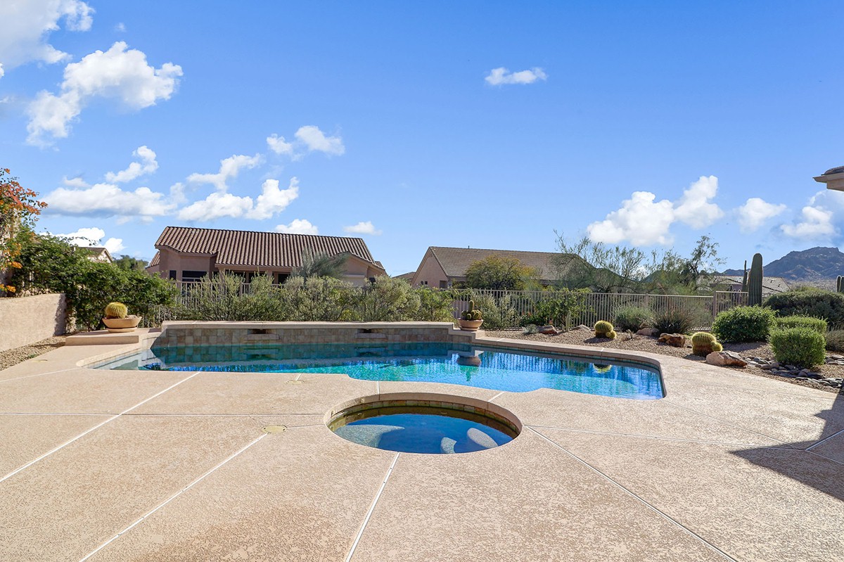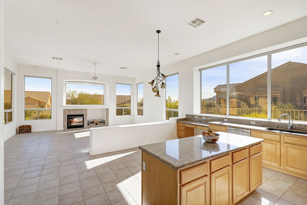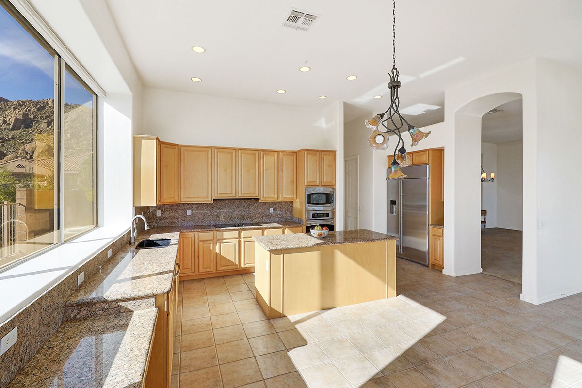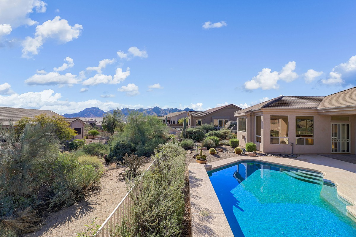 Great find in Four Peaks at Troon Village! This home is tucked away in a private cul-de-sac and the lot backs and sides to NAOS with Troon Mountain views out the front and McDowell Mountain Range views from the rear.