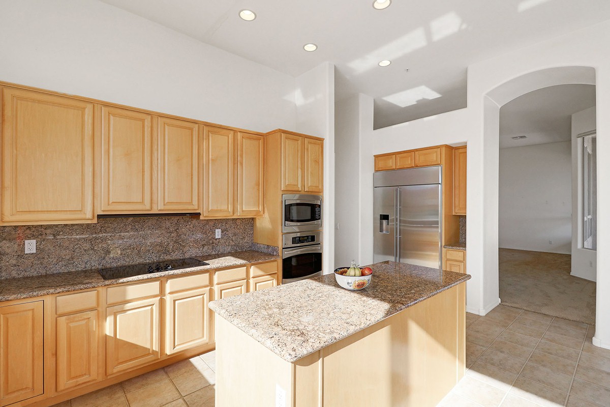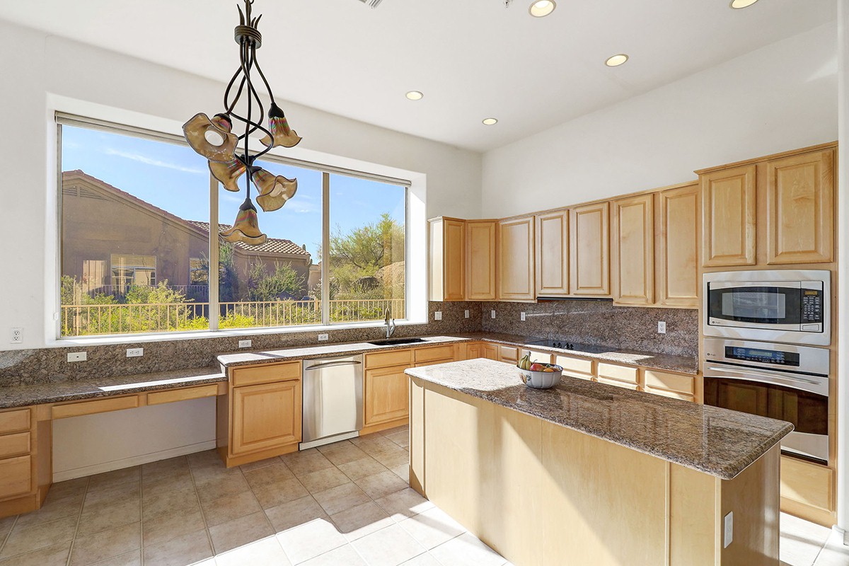 The kitchen and family room are the highlight of the house. The large working kitchen has a center island, beautiful granite counters, walk in pantry, built-in desk, stainless steel appliance package, ample cabinetry and a large picture window emitting East facing natural light. The family room is designed around the views with french doors to the backyard, large view windows, cozy fireplace and opens to the kitchen.