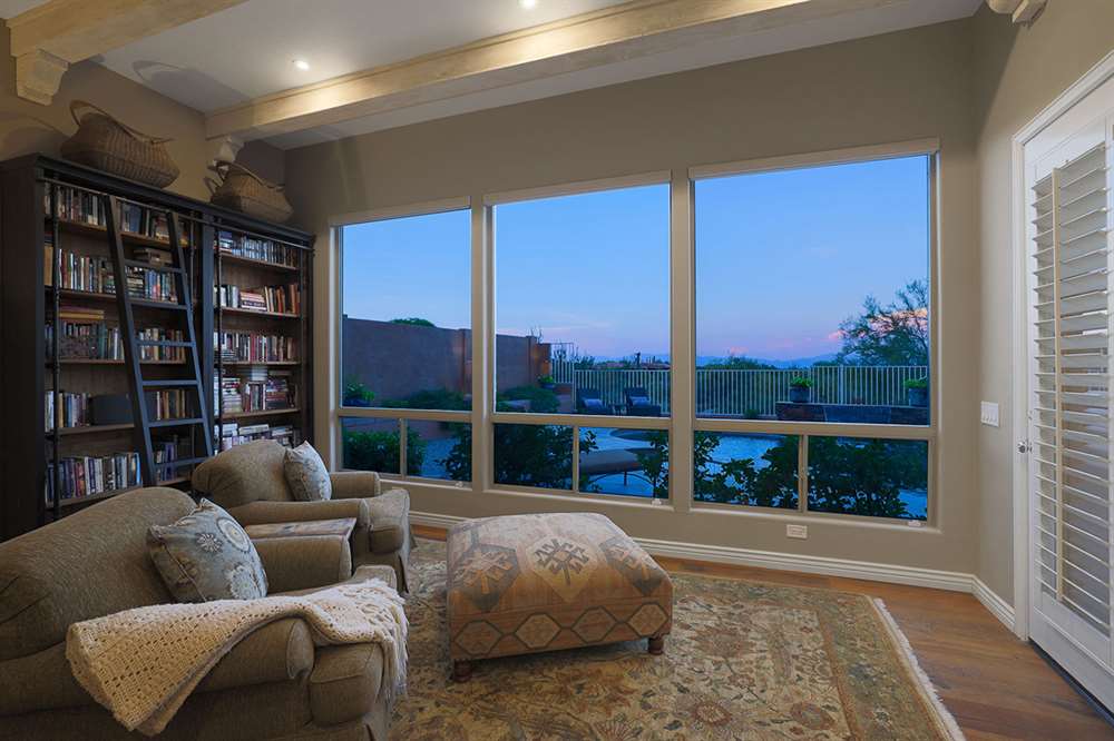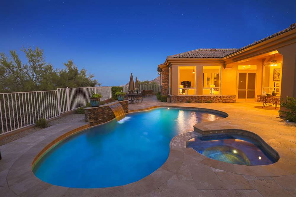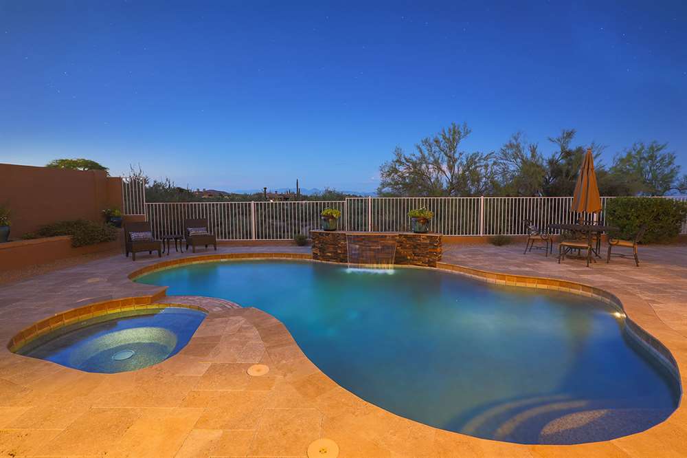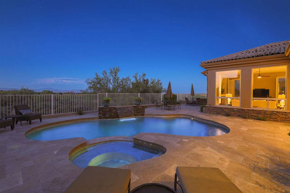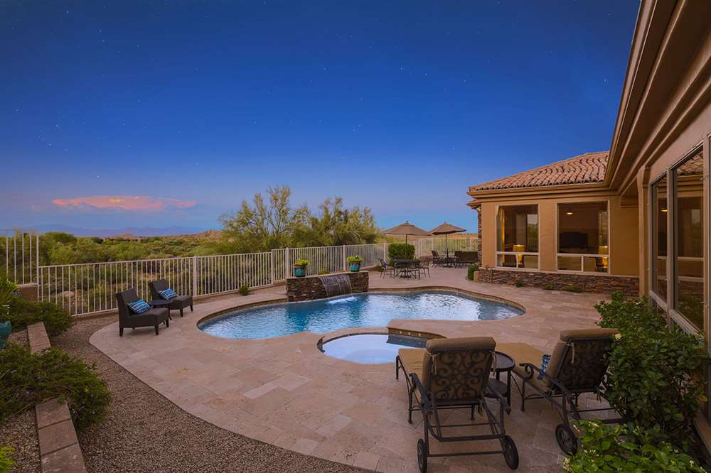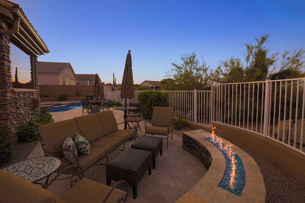 The backyard emphasizes the views with a private feel, view fencing, travertine hardscape, refreshing and heated pool and spa, covered patio, built-in barbecue, minimal landscaping for easy care, and built-in fire pit for the best in Arizona living. The four bedroom, three bath split room floor plan has a formal living and dining as well as a great room style kitchen, nook and family room.