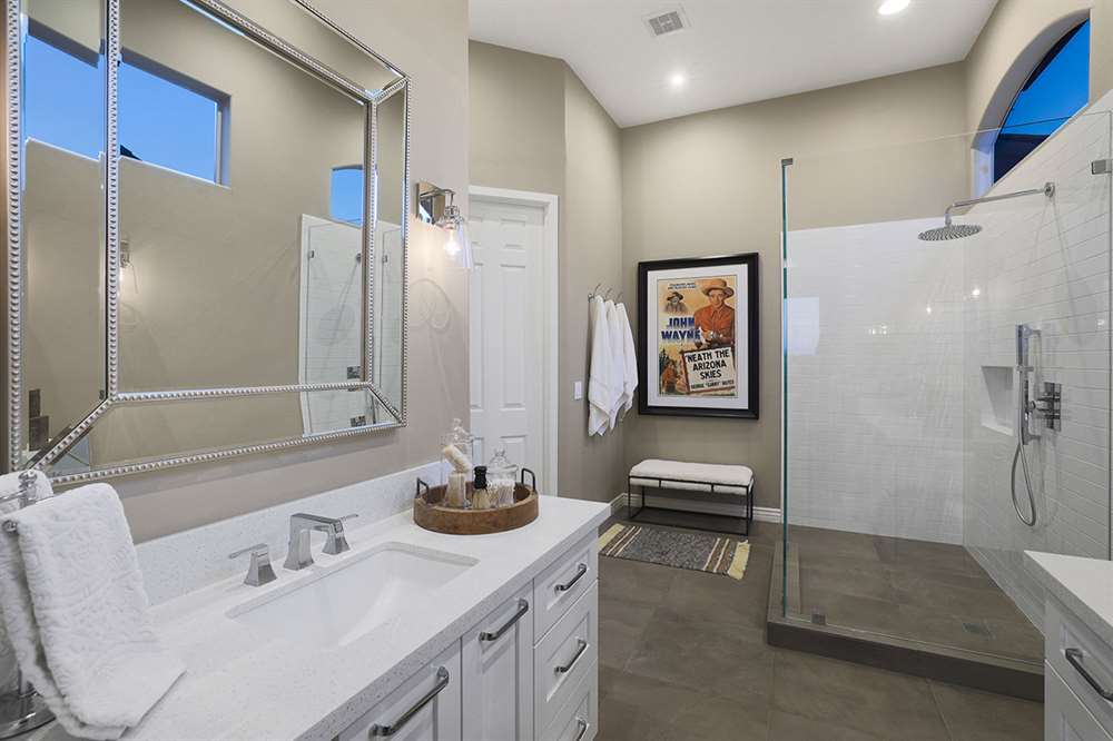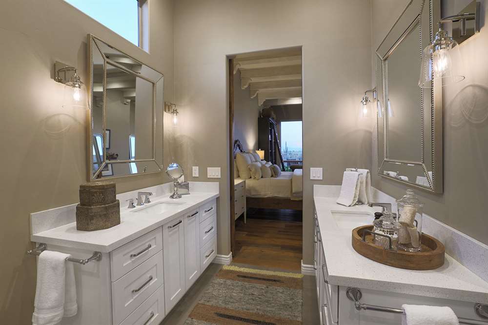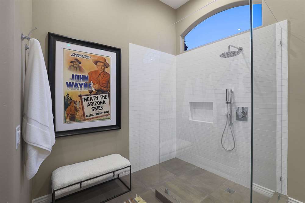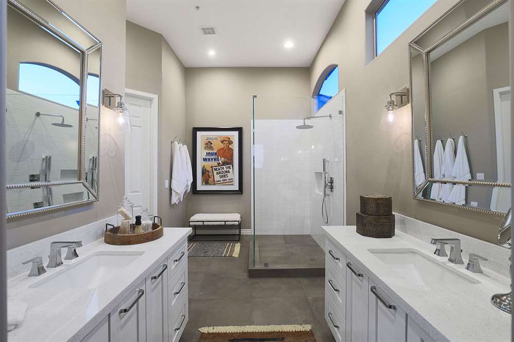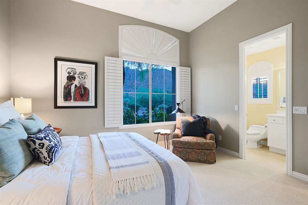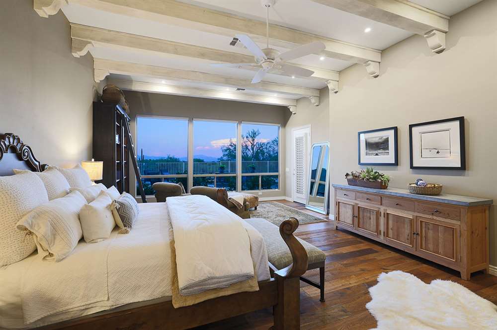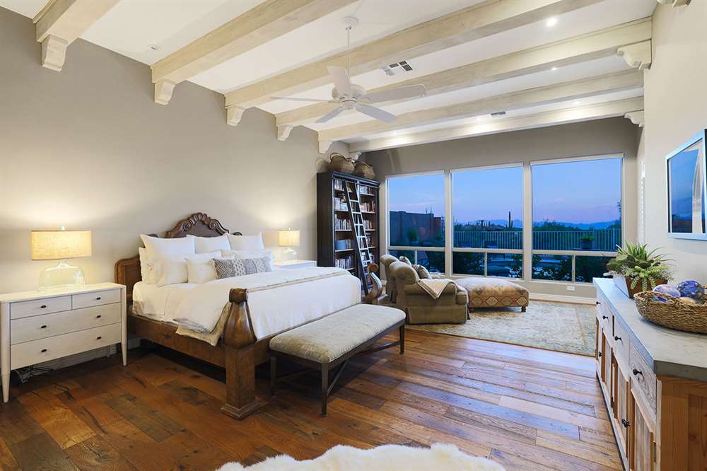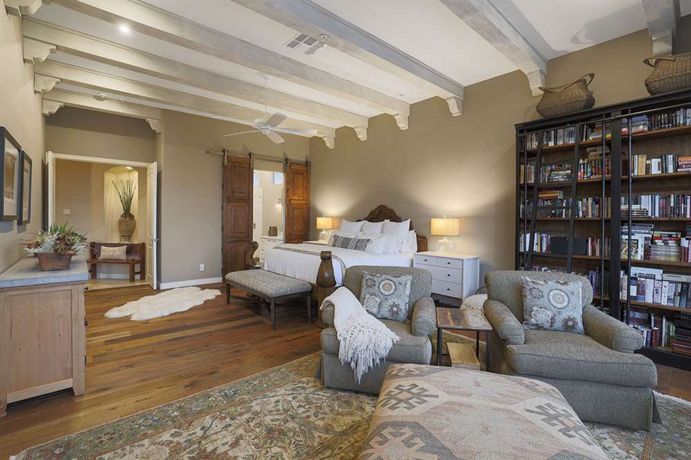 The beautifully remodeled Restoration Hardware style master bedroom and bathroom feature beamed ceilings, hardwood floors, exterior access, large view windows with a sitting area, dual vanities with quartz tops, frameless walk-in shower with white subway tile, and clerestory windows for additional light.