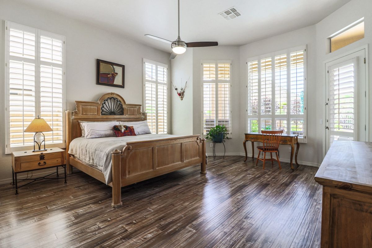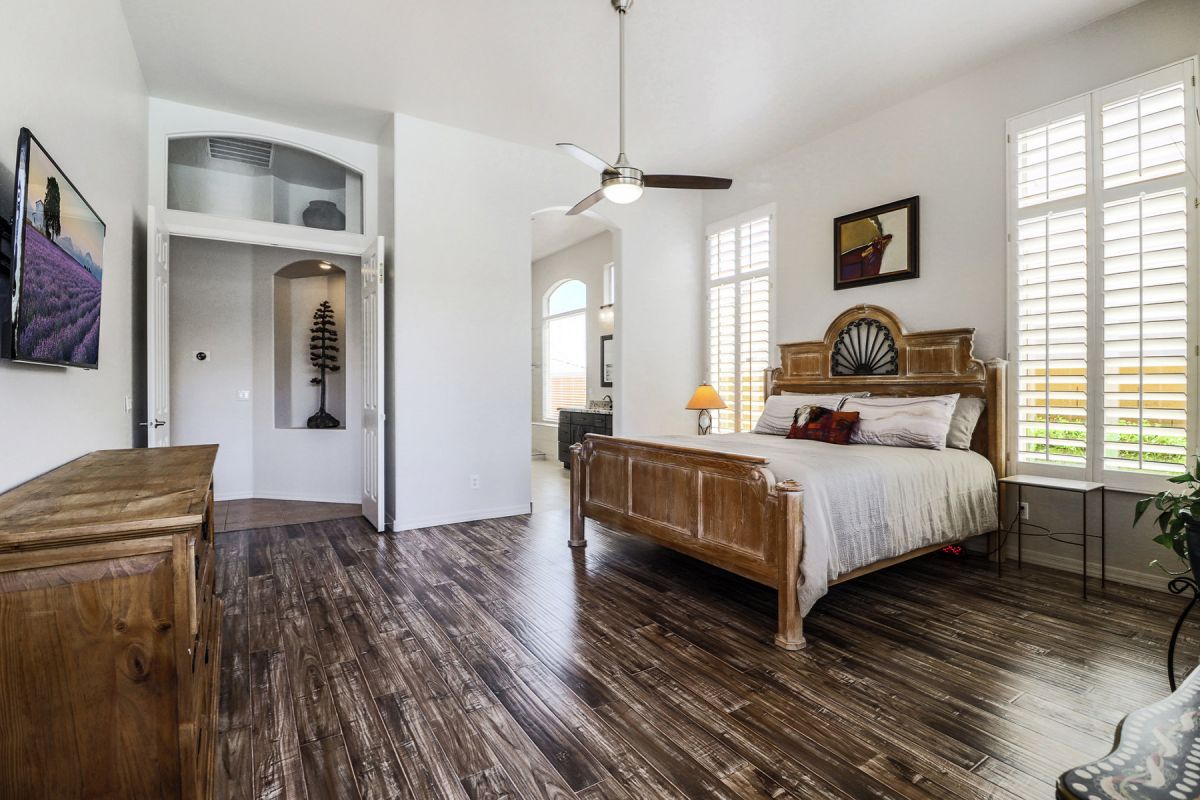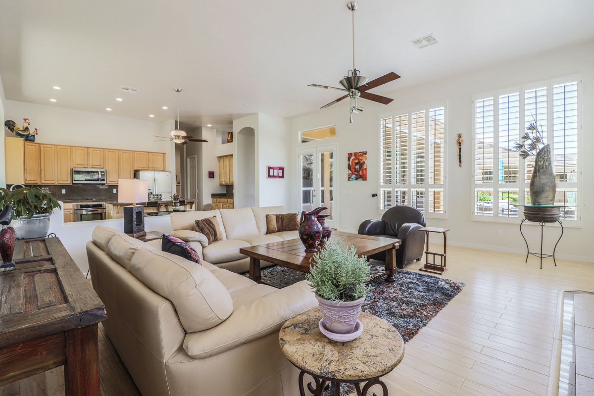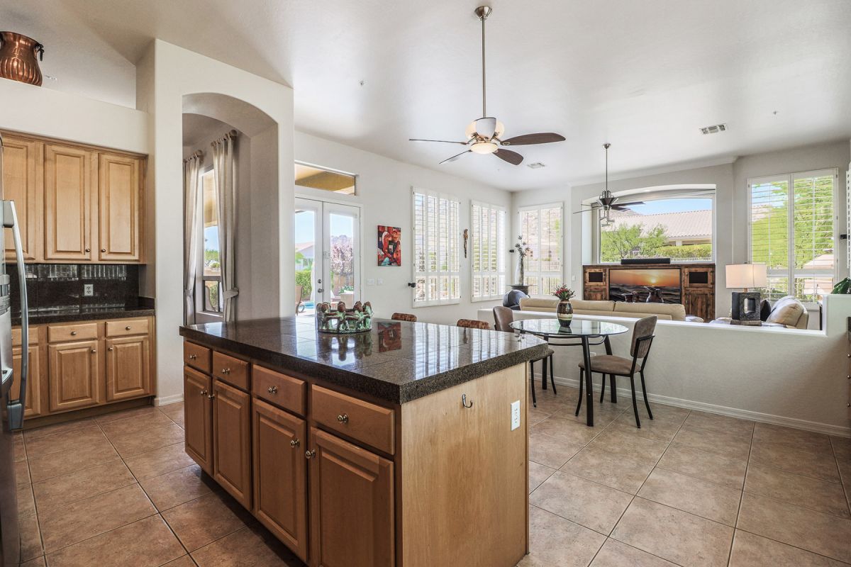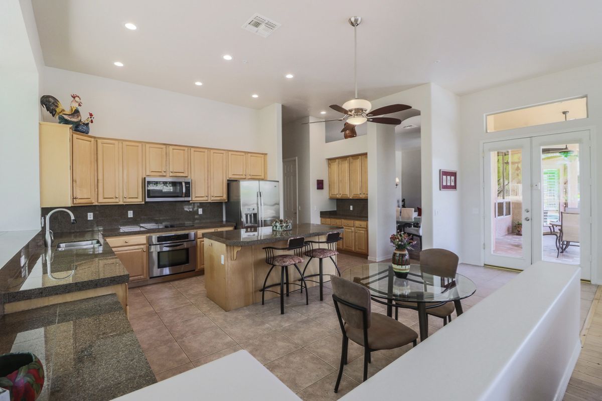 The kitchen and family room are the highlight of the house with the large working kitchen featuring a center island, granite counters, walk in pantry, stainless steel appliances, ample cabinetry and a large picture window emitting North facing filtered natural light. Other features include a retractable sun screen at the covered patio; large side yard; wood plank and porcelain tile flooring; plantation shutters; high ceilings; eat-in kitchen with breakfast area. This home is meticulous and move-in ready.