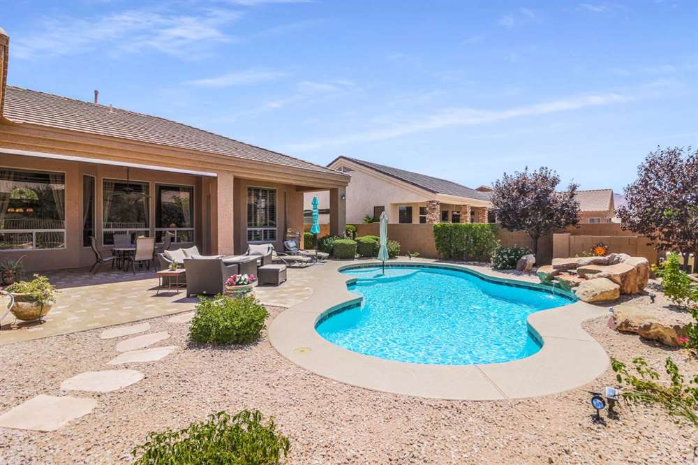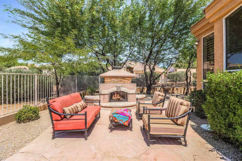 The backyard features new travertine pool decking, refreshing pool with new pebble finish, private wood burning fireplace lounge area, covered patio, and low maintenance yard care.