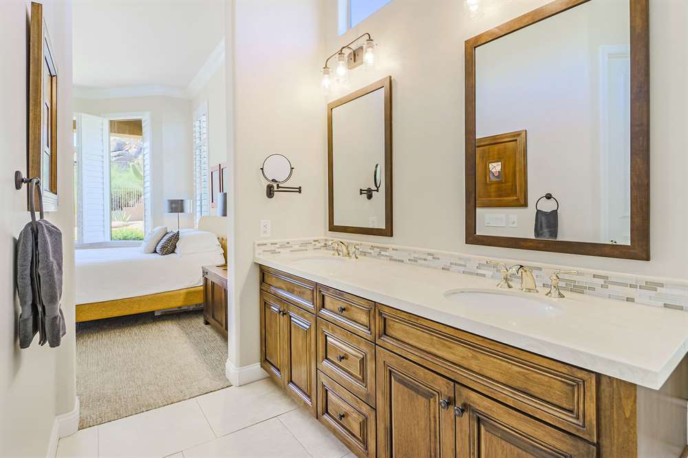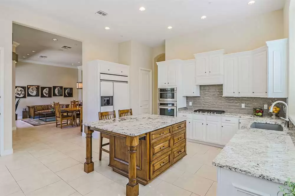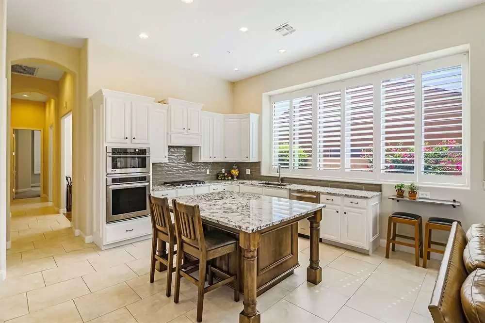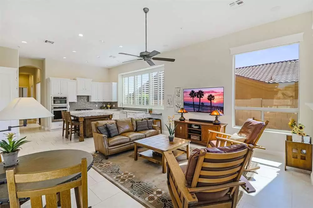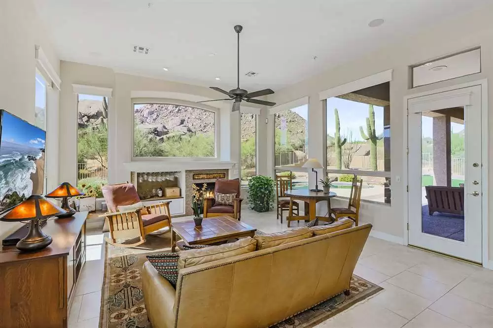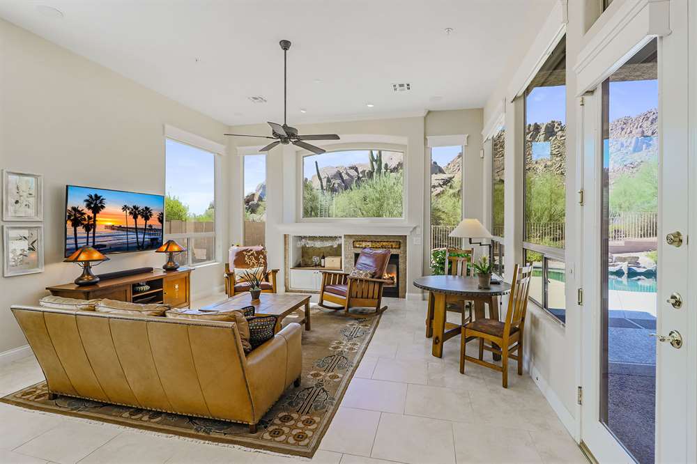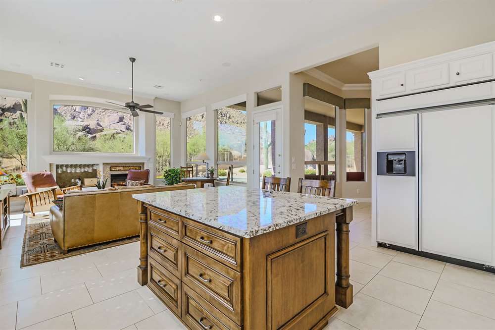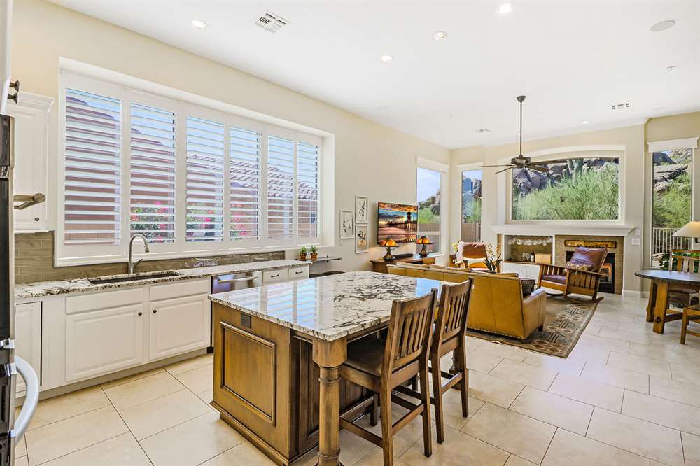 Remodeled in 2014, with two new HVAC units in 2016, enjoy an updated kitchen with white cabinets, granite counters, stainless steel appliances including gas stove, custom built center island with built-in seating, all open to the family room with cozy fireplace and exterior access. The formal great room (walls and column removed!) opens to the large backyard with a covered patio, sparkling pool, artificial turf putting green, low maintenance landscape with stately saguaros, all looking out to the amazing views.