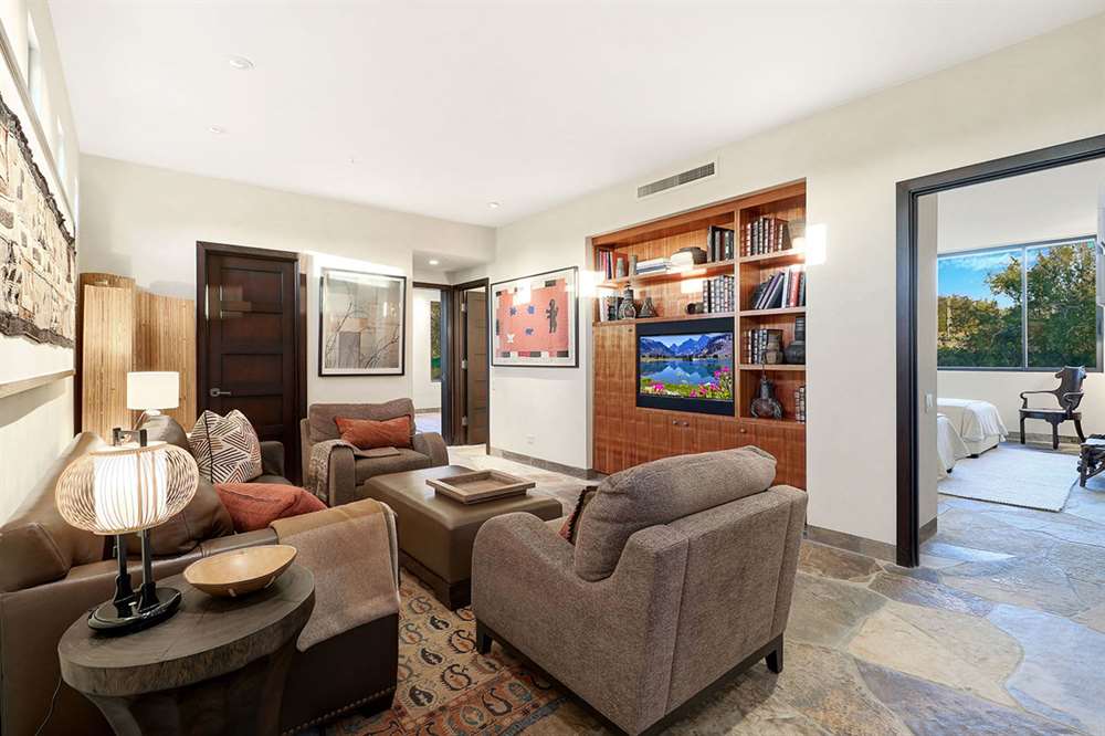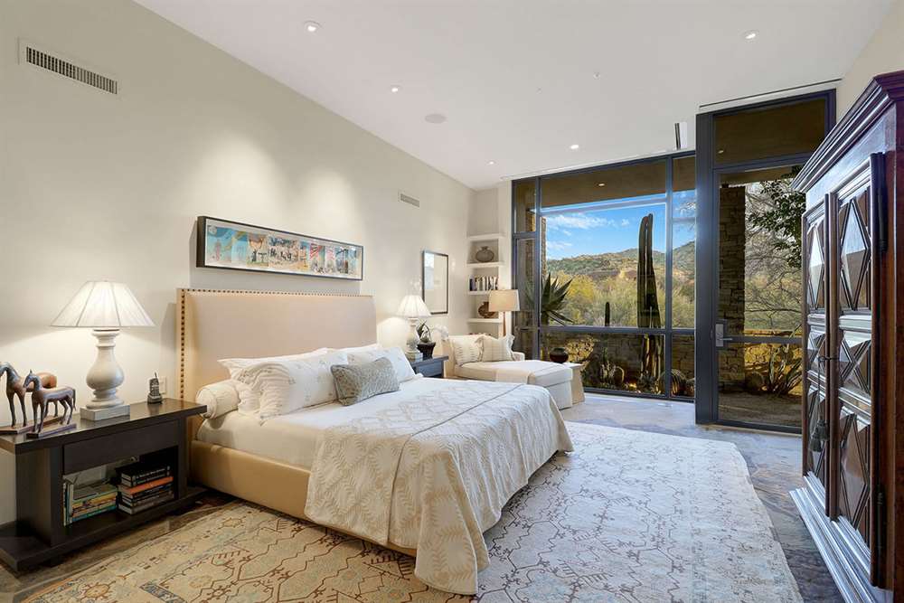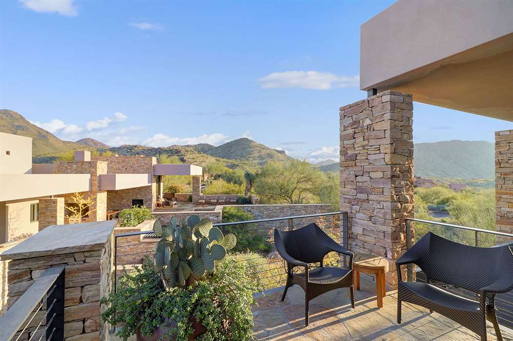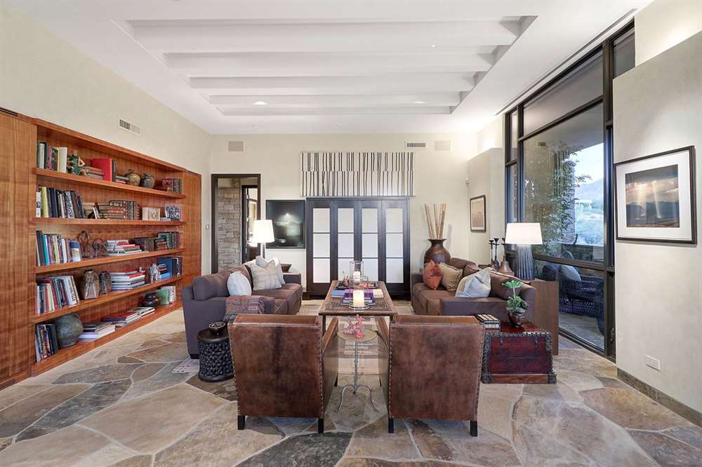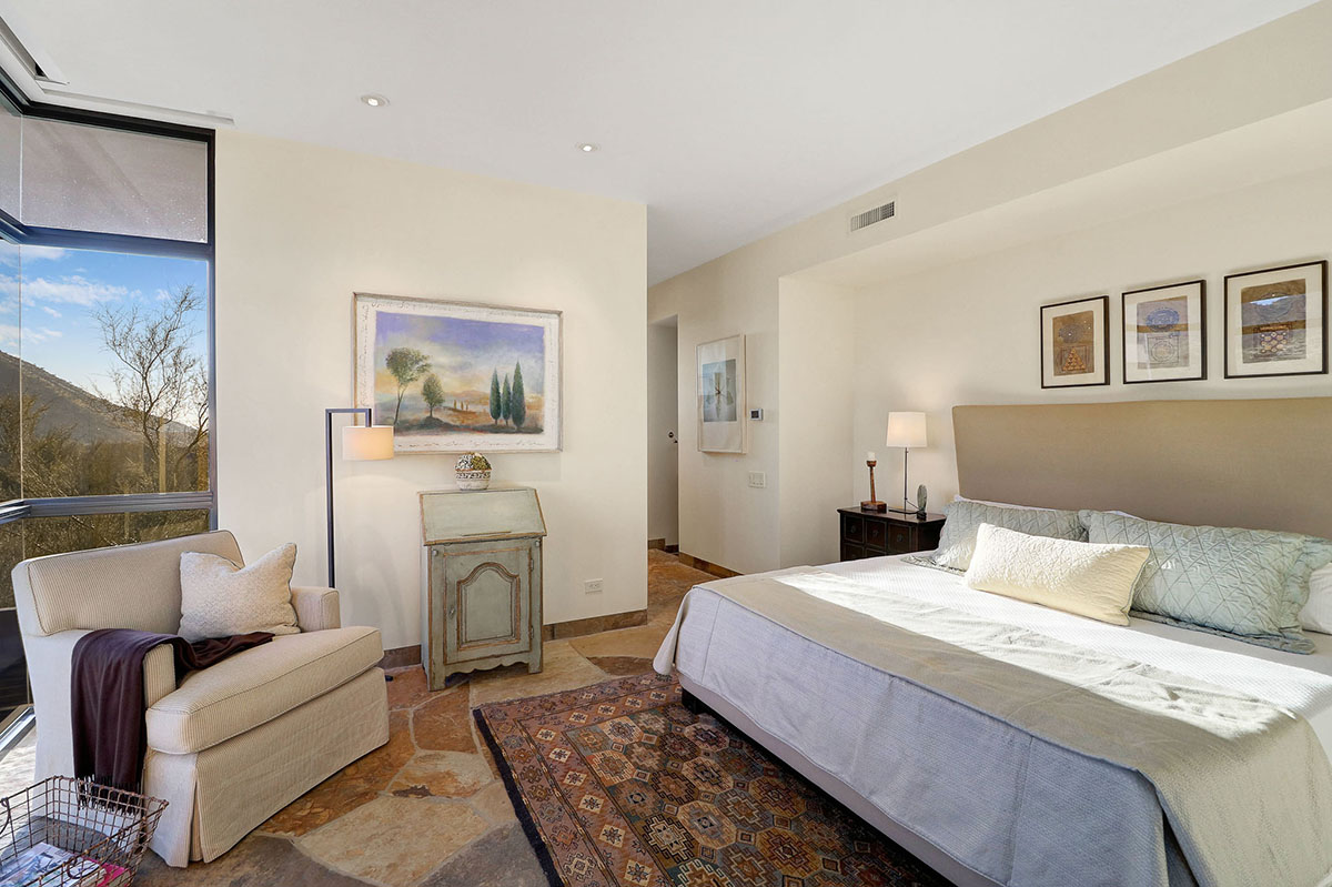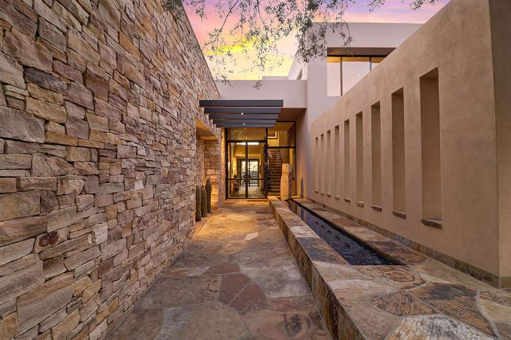 The lush, superbly designed landscaping continues the organic desert feel with numerous species of succulents, cacti, trees and boulders surrounding the decomposed granite driveway. The impressive entryway showcases a full length 40-foot long water feature and a direct view of the entry with a suspended staircase and a perfect neutral palette.