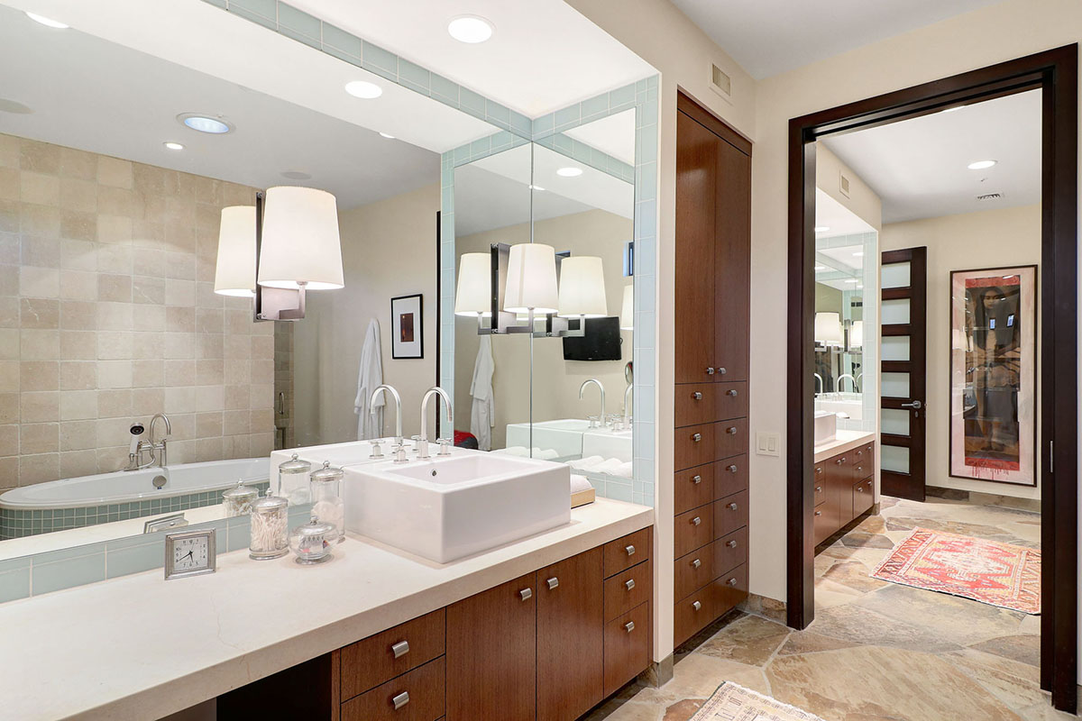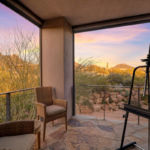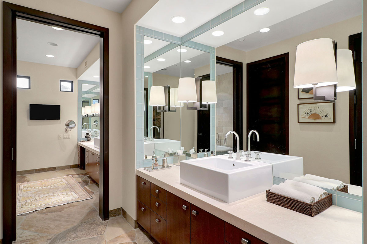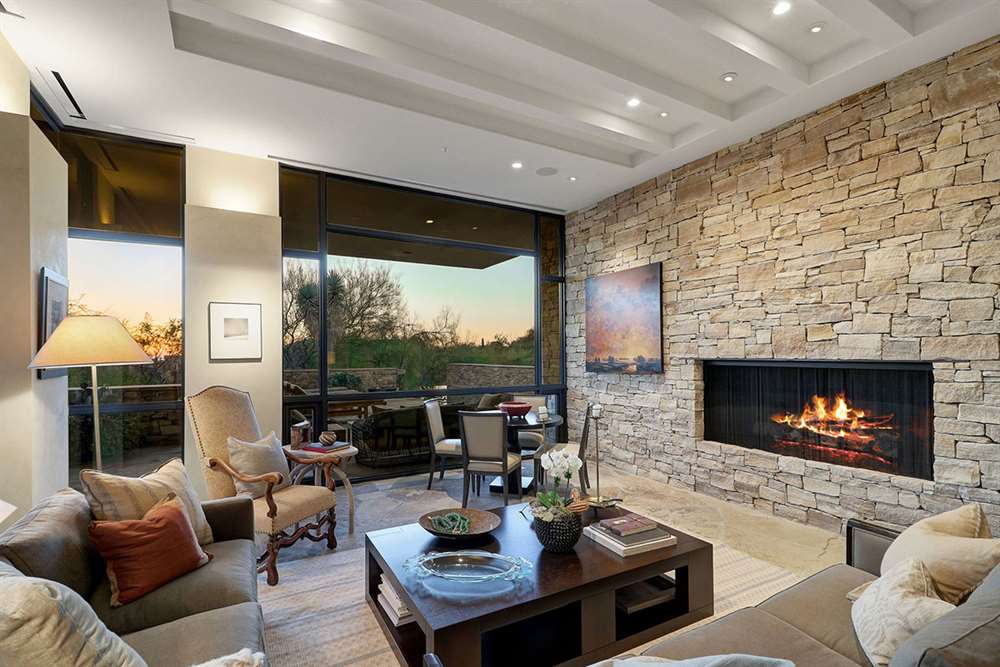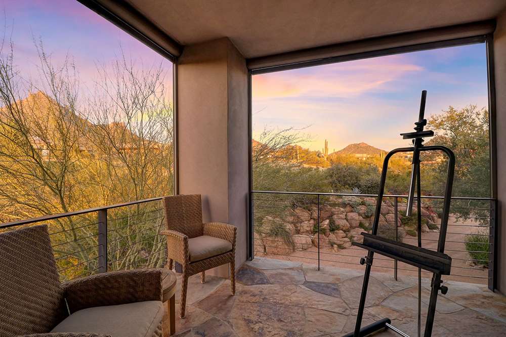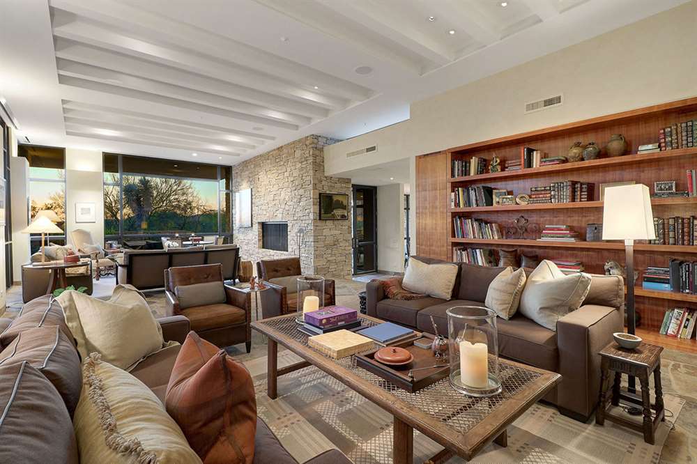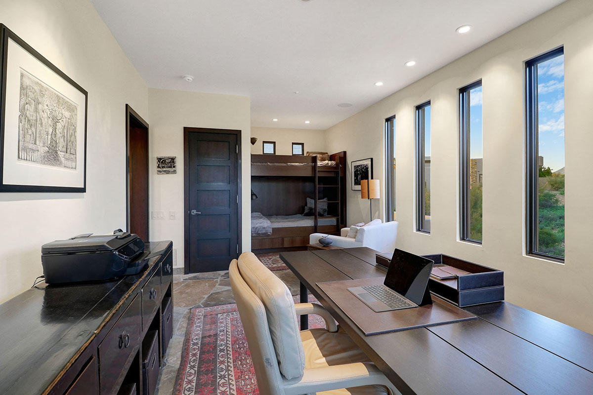 The lush, superbly designed landscaping continues the organic desert feel with numerous species of succulents, cacti, trees and boulders surrounding the decomposed granite driveway. The impressive entryway showcases a full length 40-foot long water feature and a direct view of the entry with a suspended staircase and a perfect neutral palette.