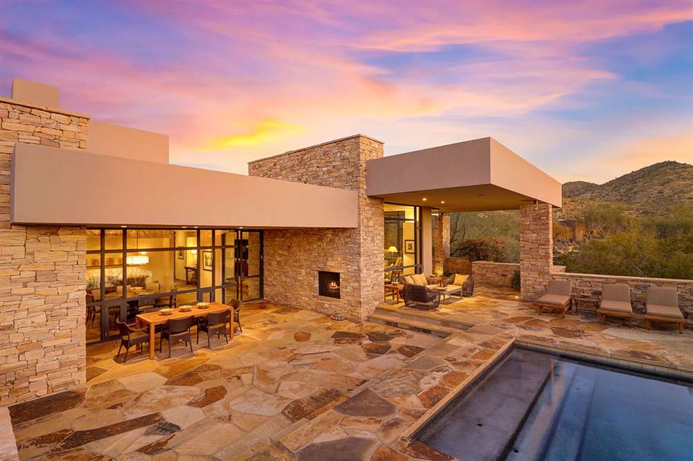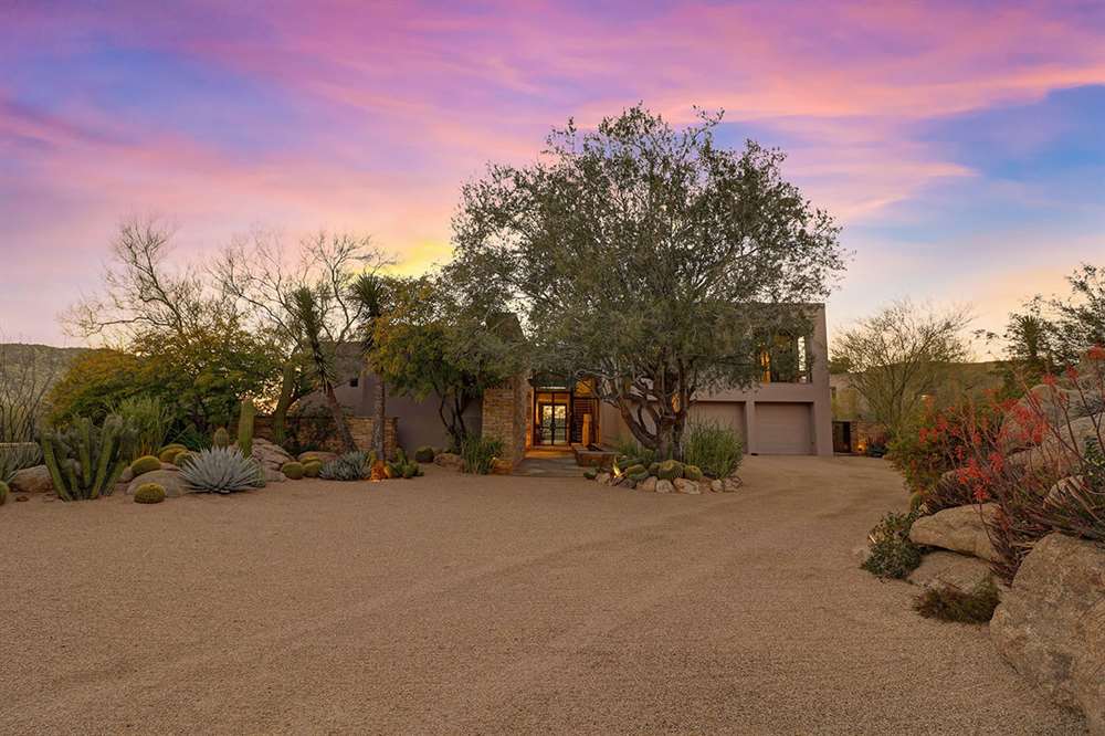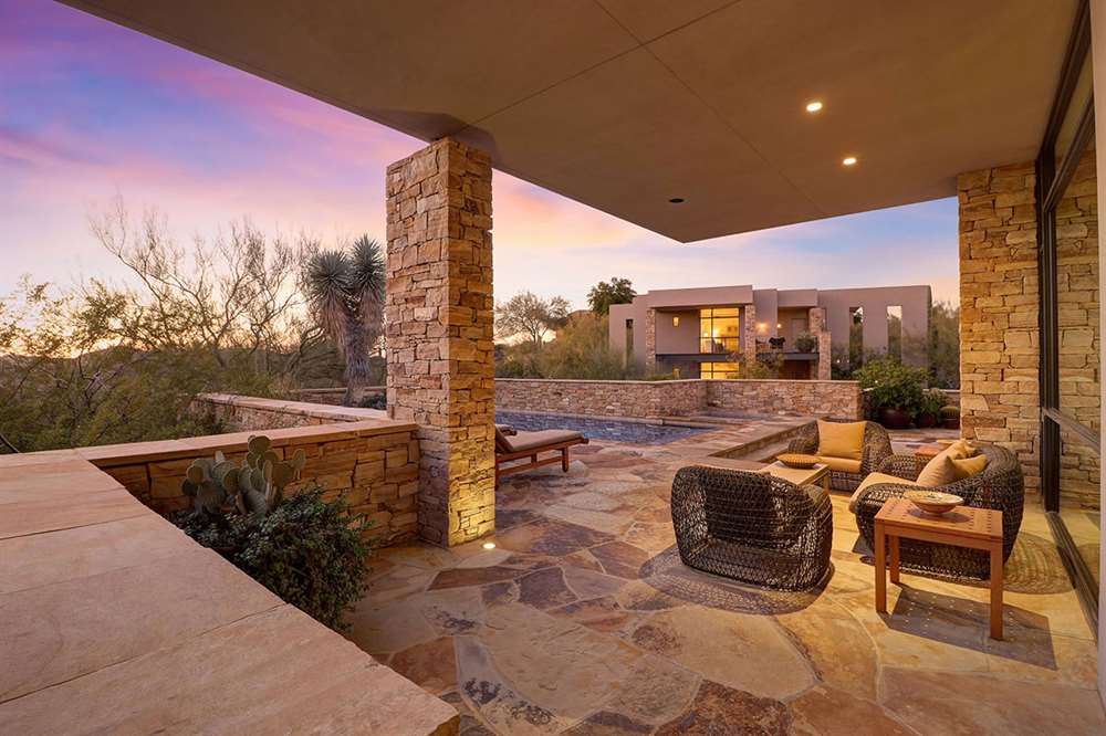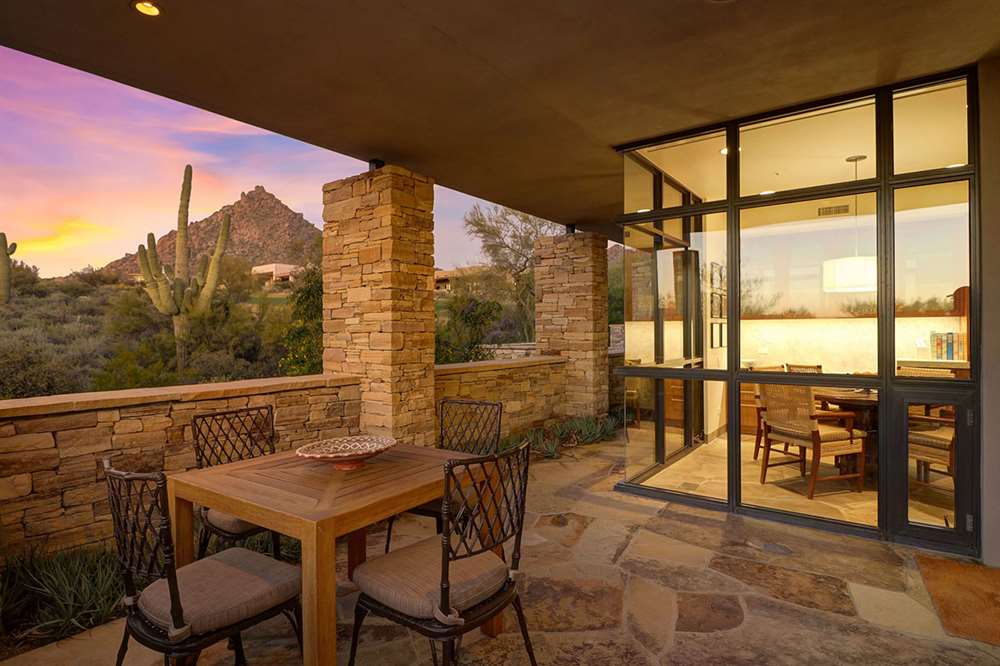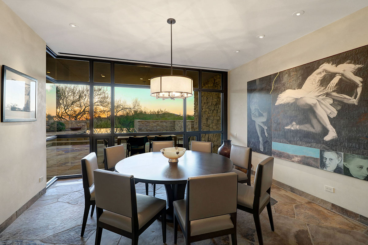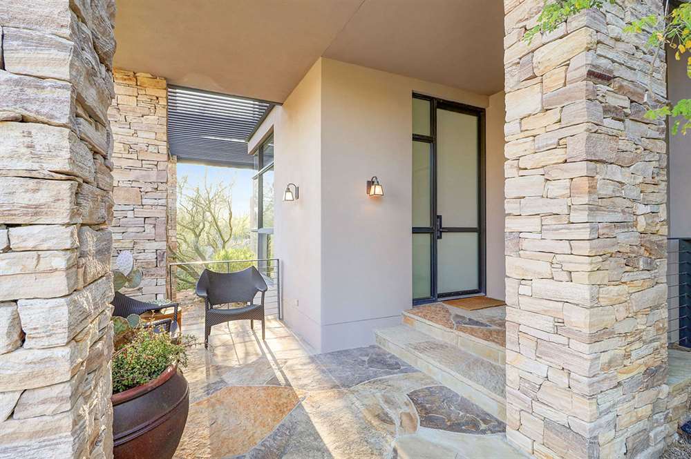 Timeless architecture and design grace this contemporary styled home with beautiful organic elements throughout. This masterpiece is located in the prestigious guard-gated community of Glenn Moor at Troon Village, home to the back nine of Troon Country Club’s private course. Featured in Phoenix Home and Garden Masters of the Southwest issue, the home was designed by renowned architect Hugh Knoell (Knoell Quidort Architects) and offers design elements that embrace the desert setting allowing for seamless living inside and out including steel and glass doors, flagstone flooring throughout, high ceilings, locally sourced stacked stone walls and clean lines.